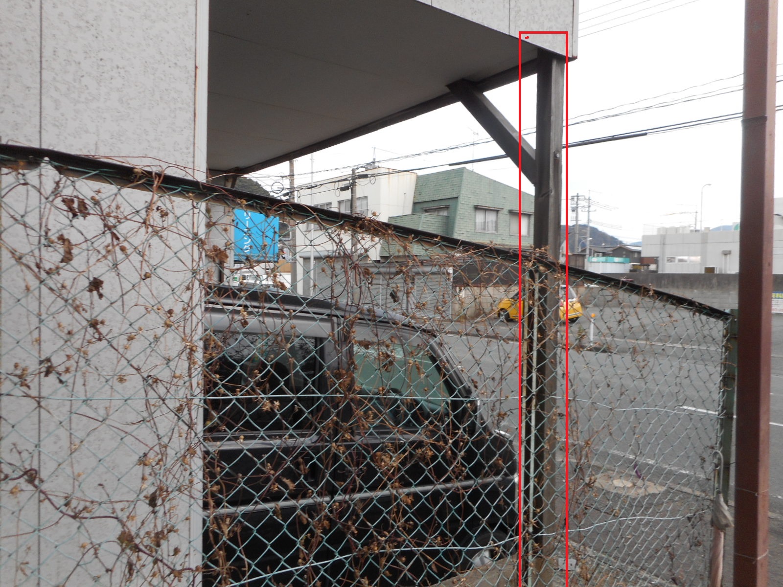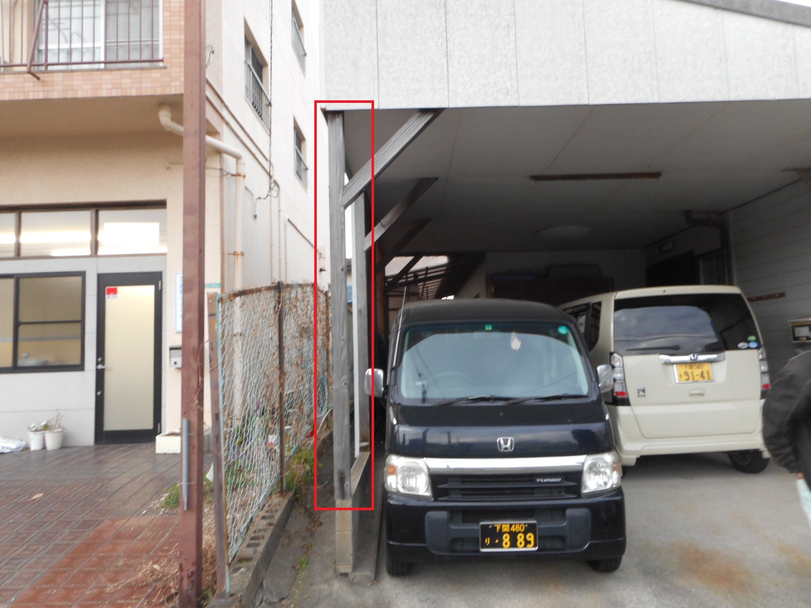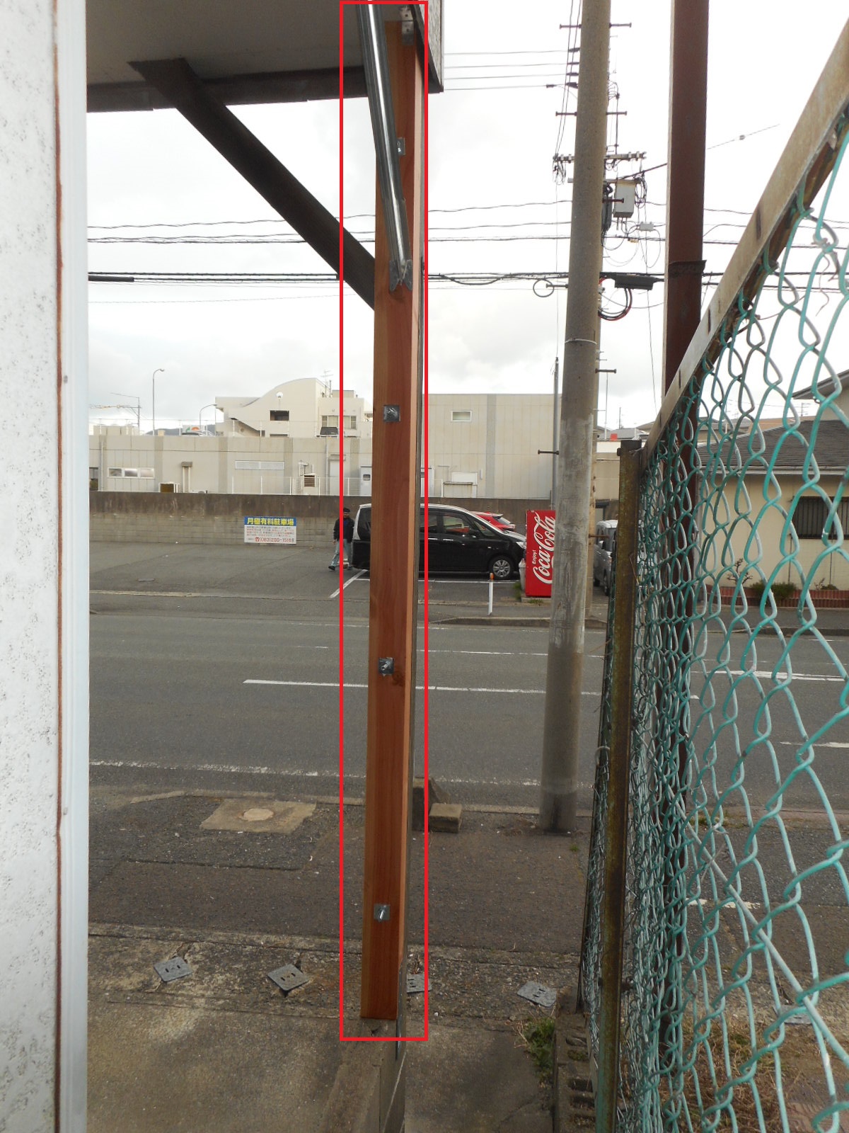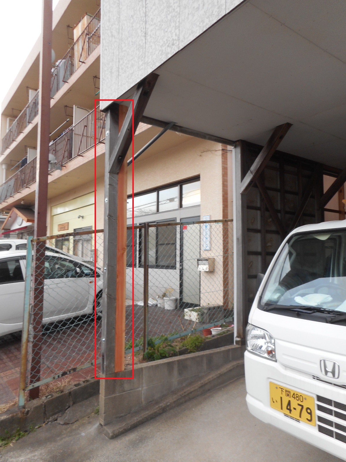 車庫の柱(赤線□部分)が若干腐食して来たため、用心のために既存の柱に新規の柱を抱かせて補強しました。