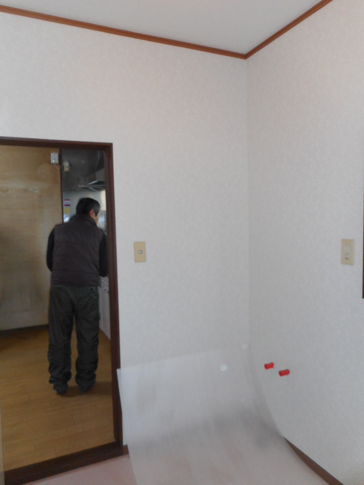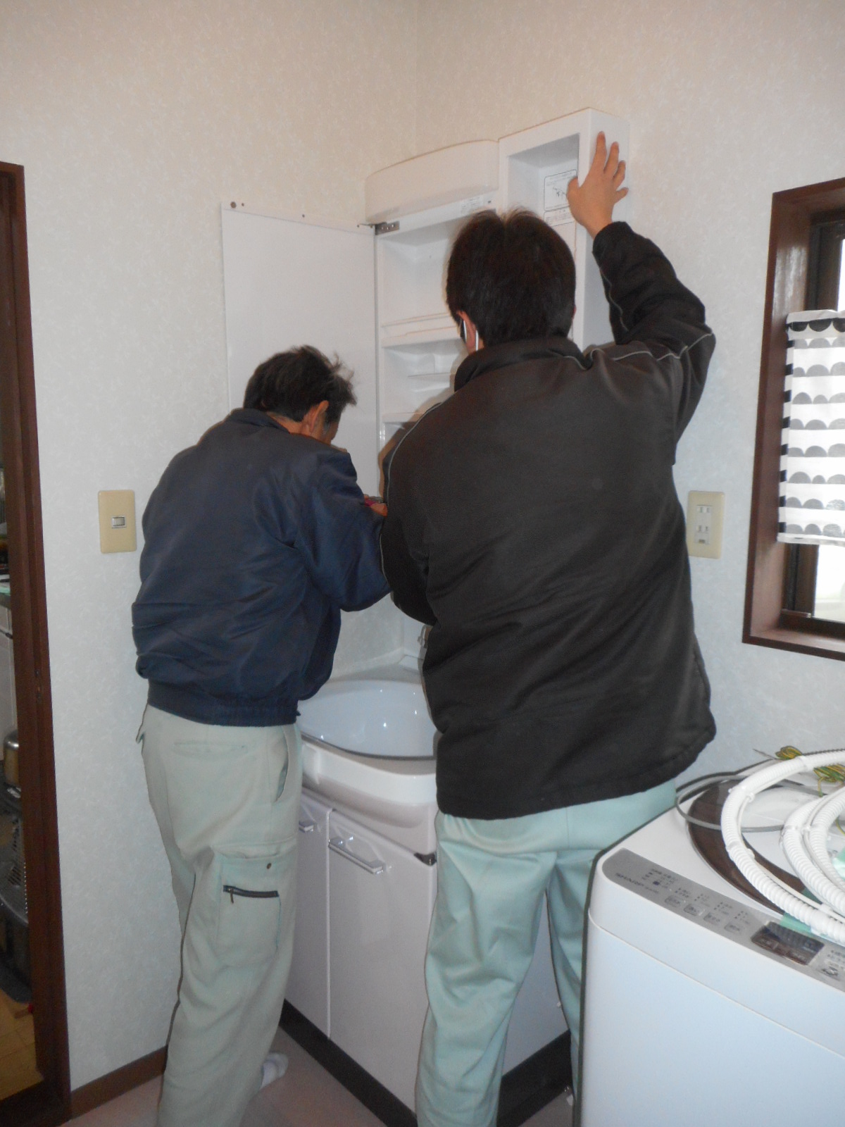 | 内装工事が、完了しました!! | 新規の洗面化粧台を、組付けて行きます!! |