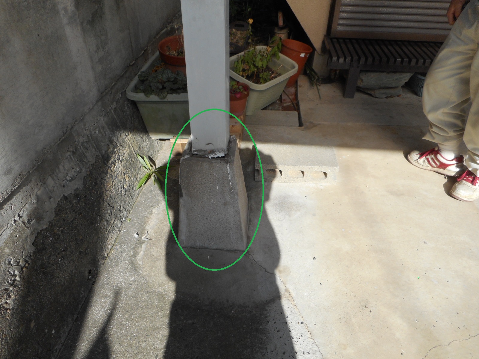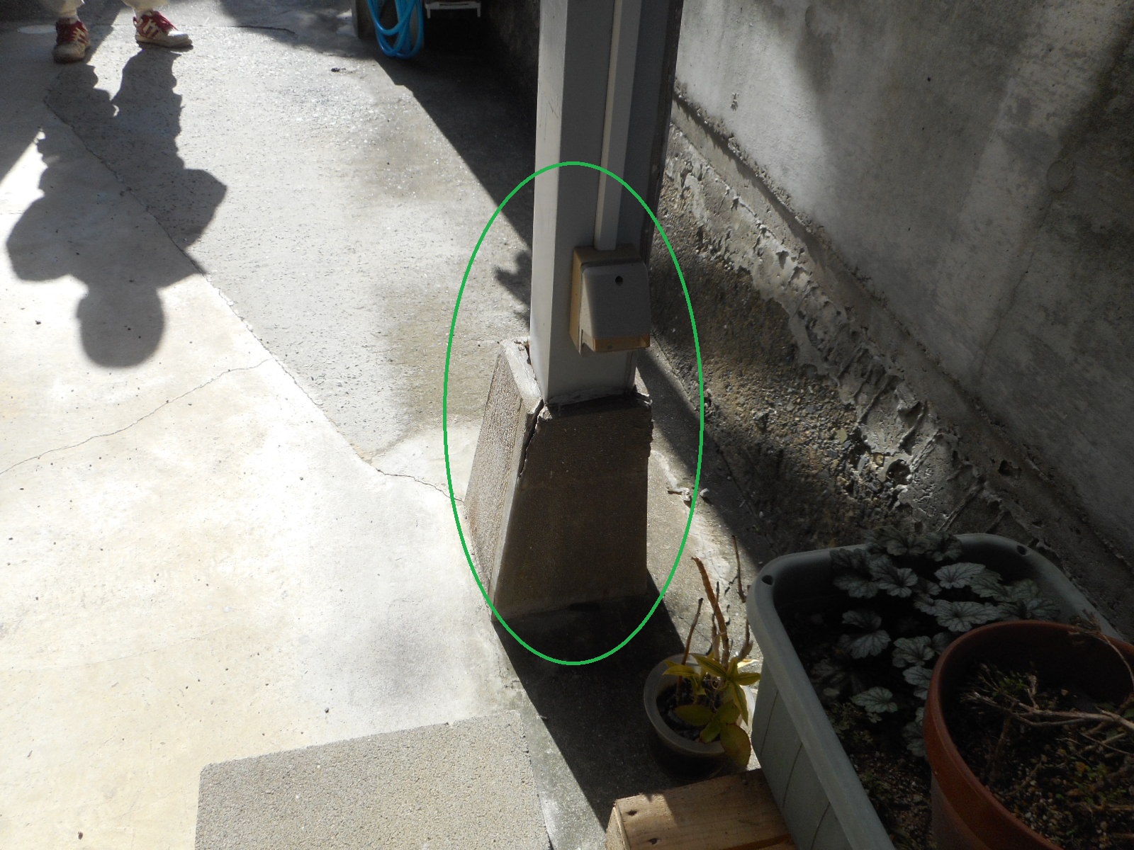 | 正面から見る!! (青○で囲った部分の柱の下部が腐食しています) |