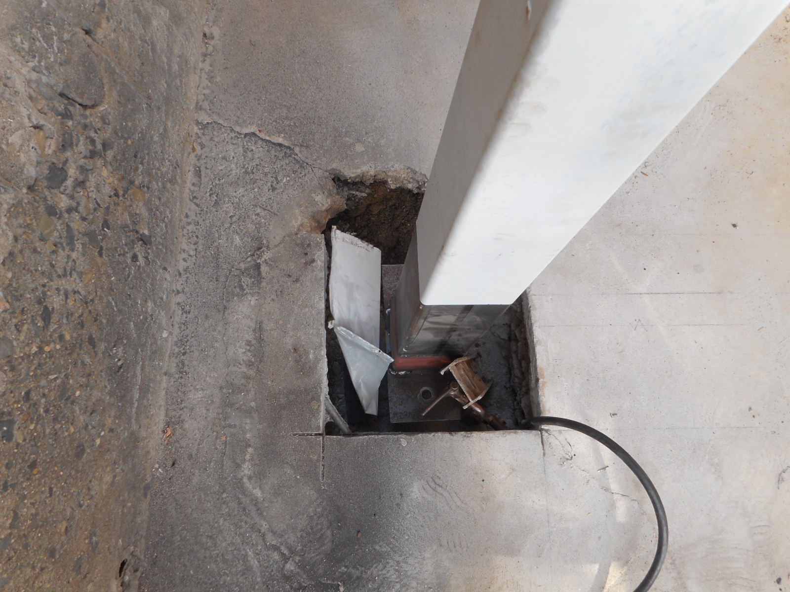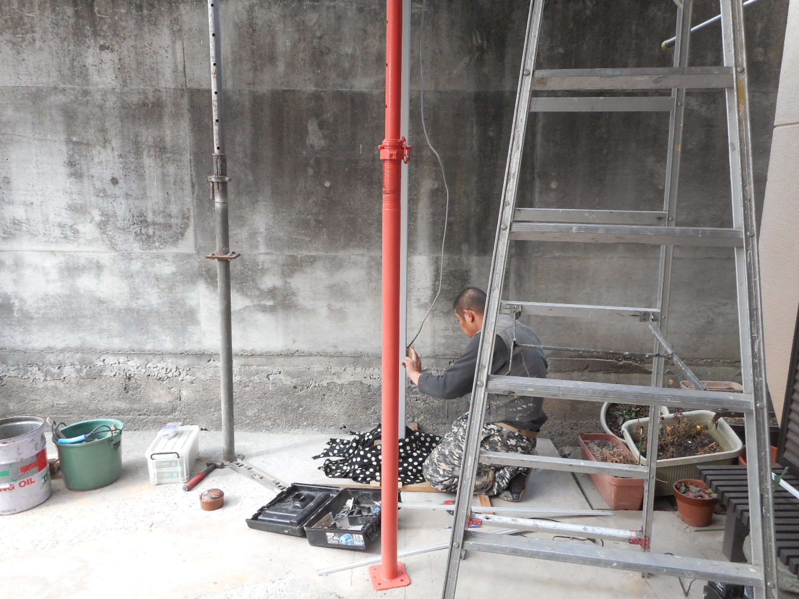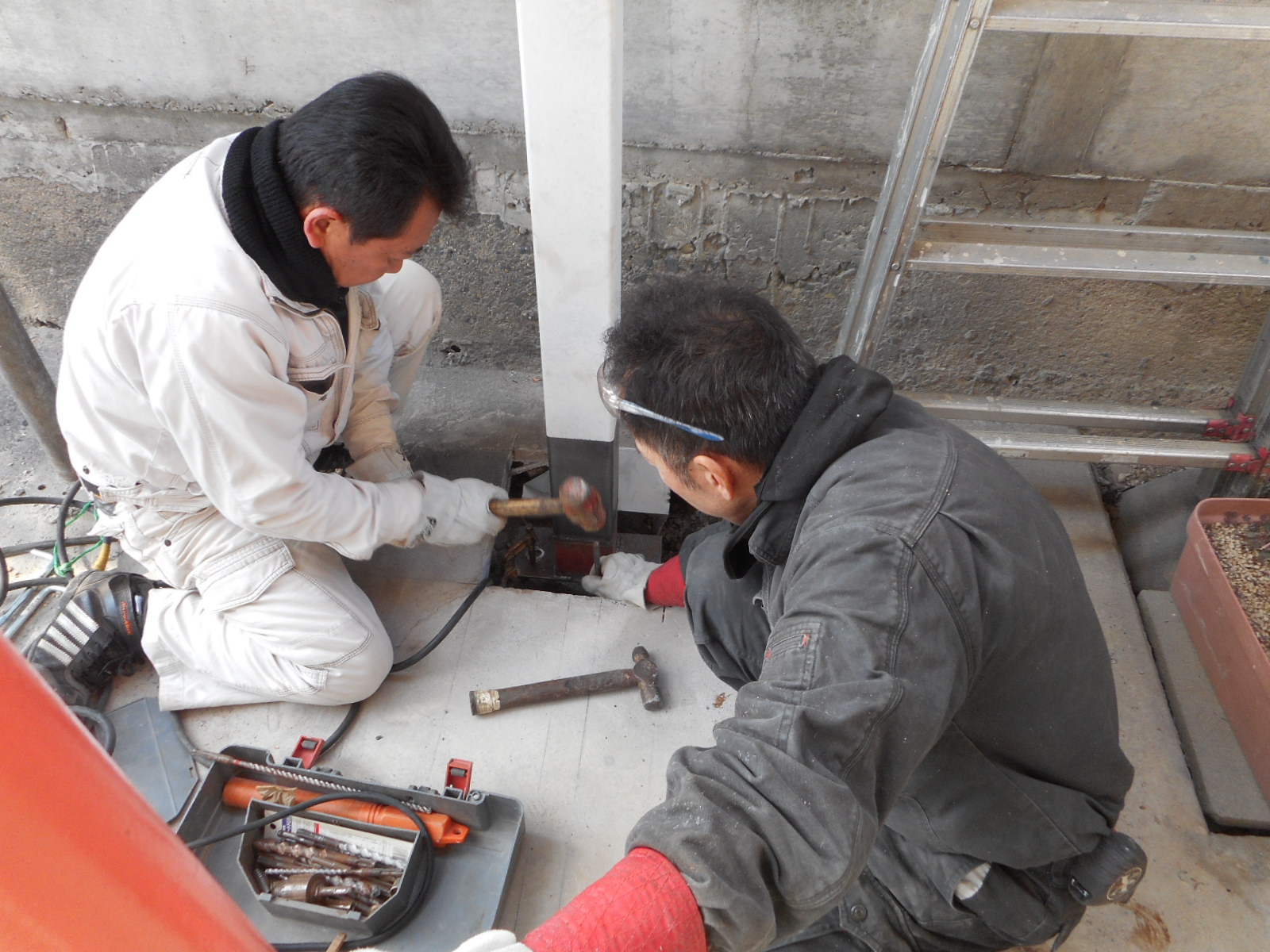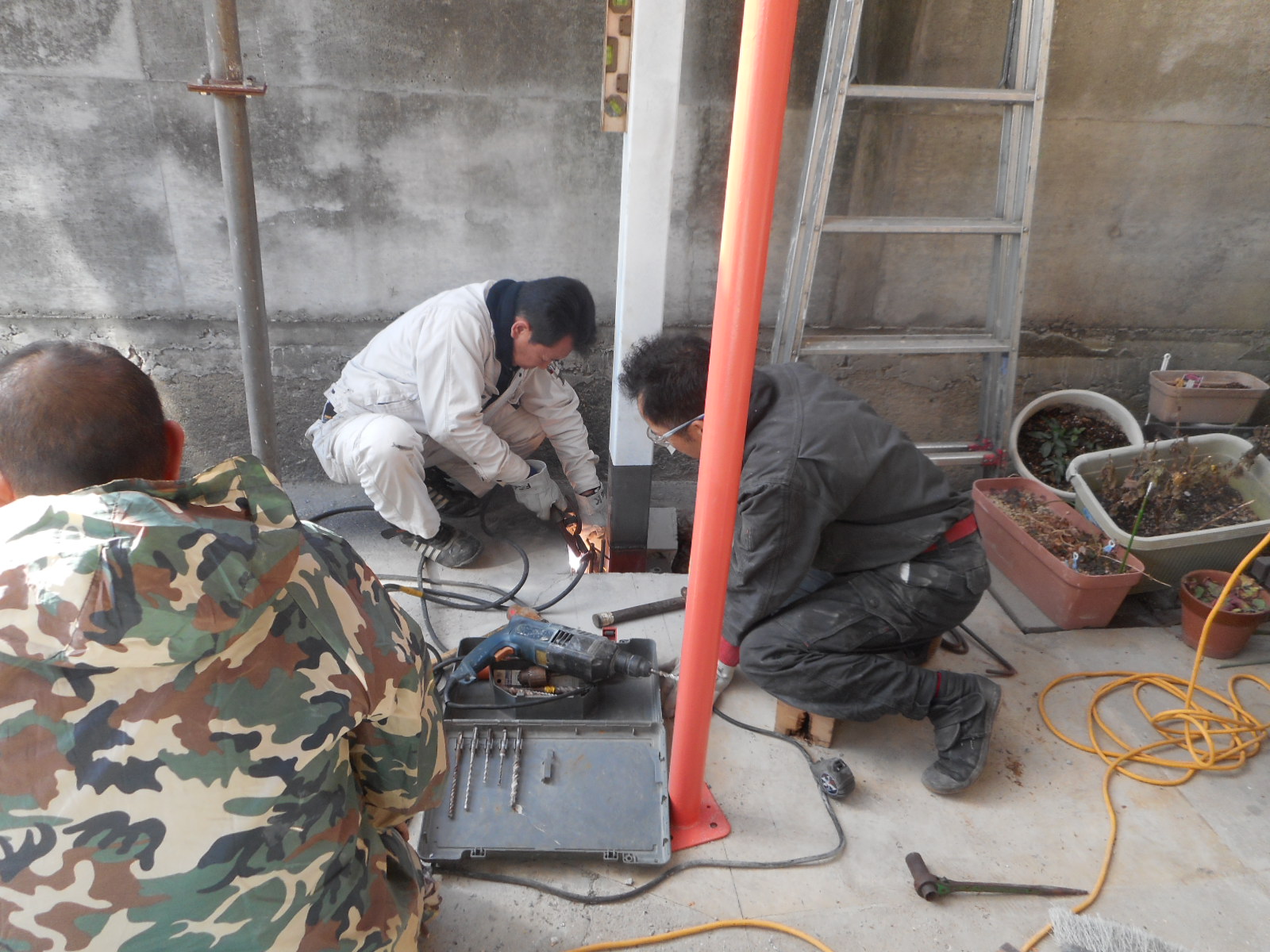 | ベース部分がズレない様に、溶接をします!! | 柱廻りにモルタルを打ち、防水コンセントを元に戻します!! |
