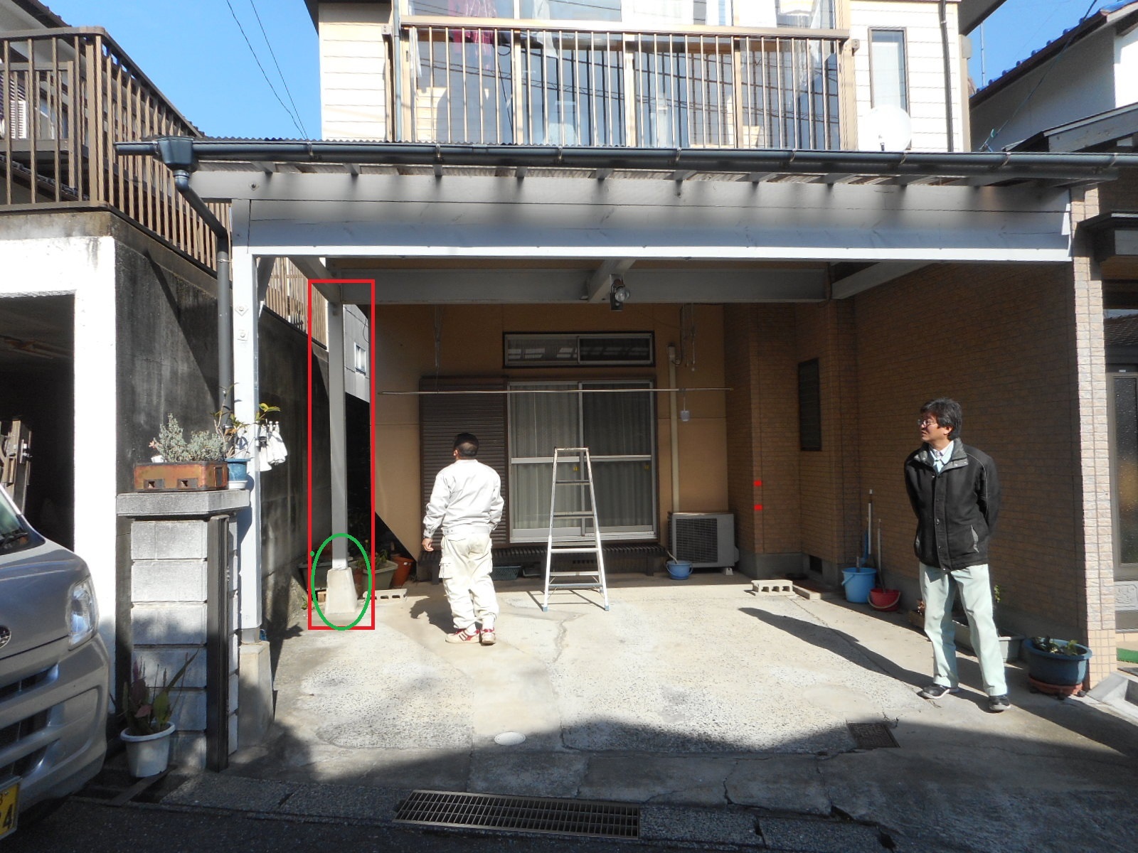 赤線□で囲った柱は、車庫の上のサンルームの荷も掛かっているため大変重要な柱です。