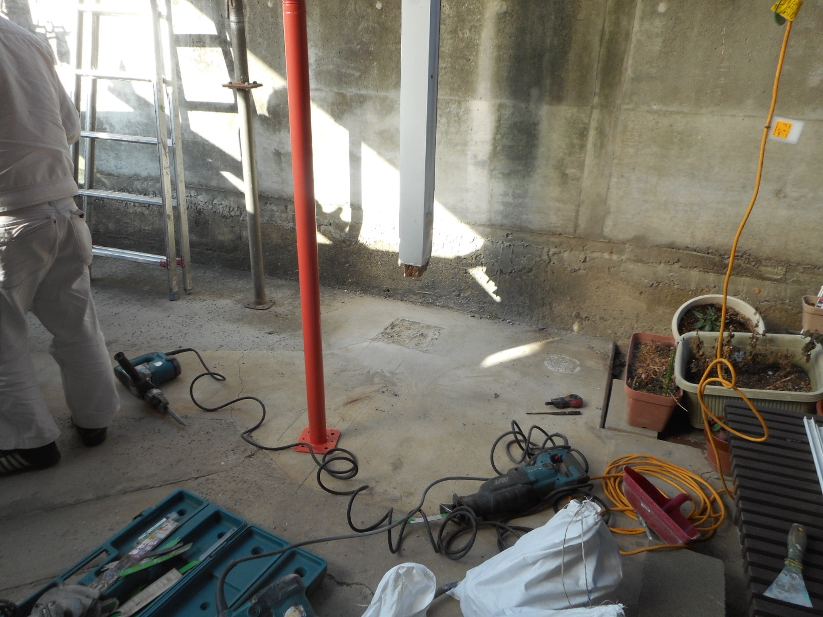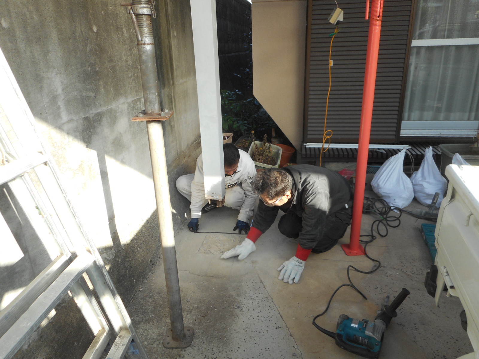 このまま放置すると上のサンルームも危険なため、下の束石部分から改修し、柱は鉄骨を交換し