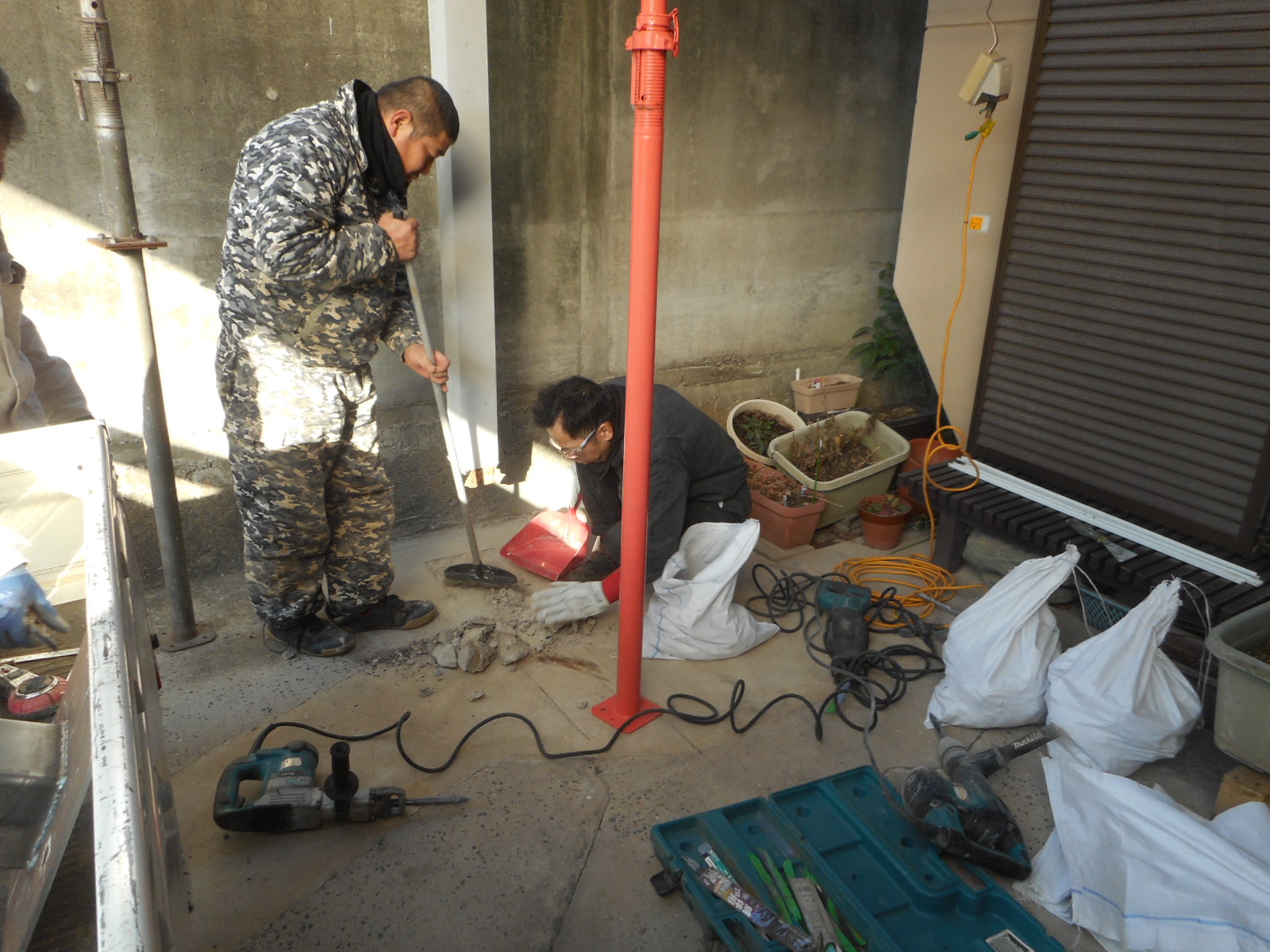 | 土間に穴を明けて行きます!! | 既存の木の柱を、上から切り離します!! |