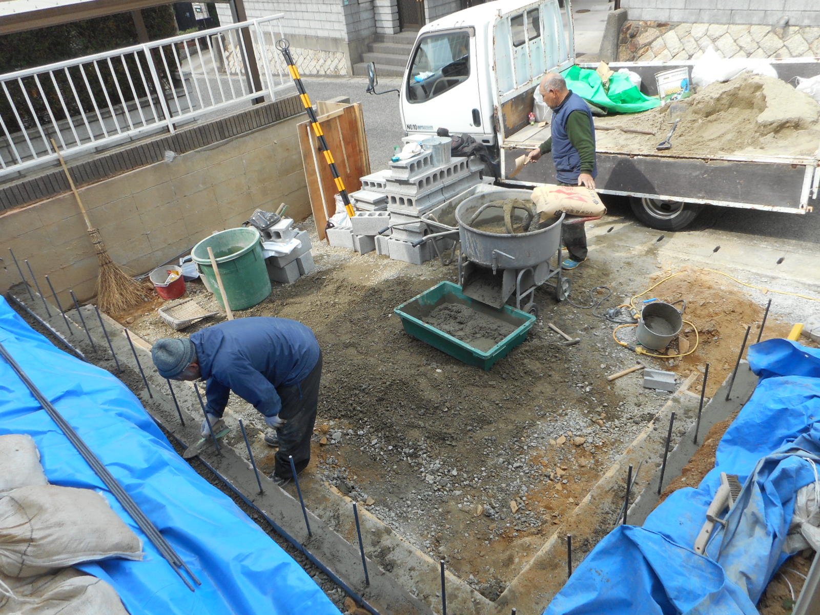 | 鉄筋を加工します!! | 土留めのブロックを施工する部分に鉄筋を組み 下地の捨てコンを打ちました!! |