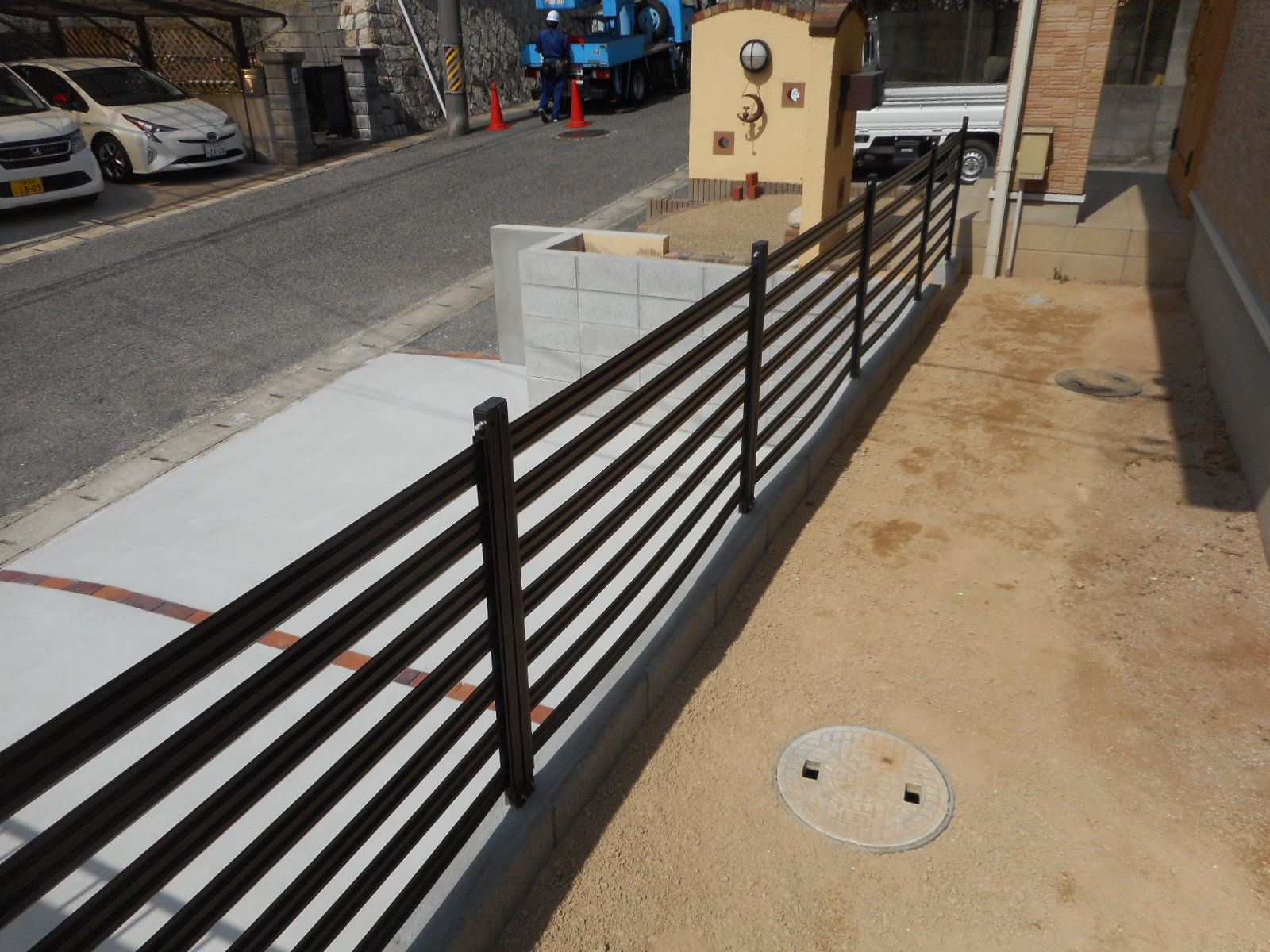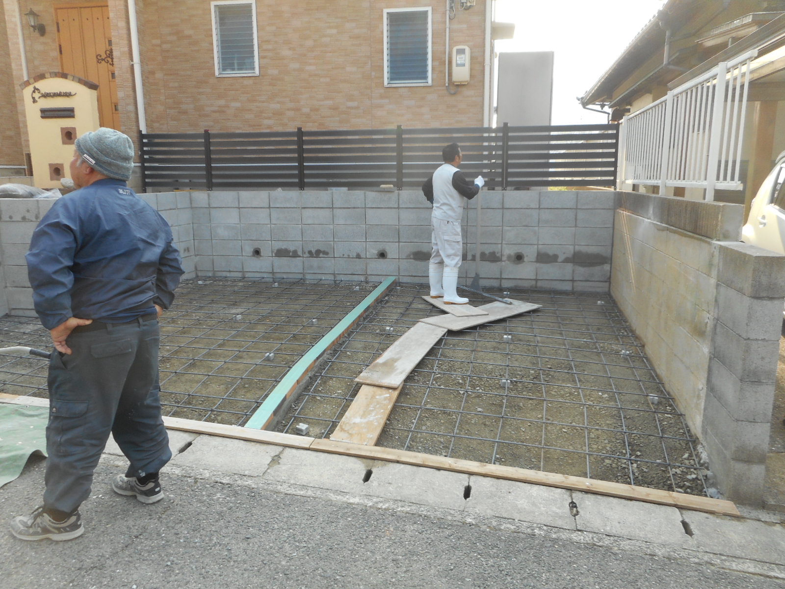 整地後、中間にレンガ目地を施工し鉄筋を組みました!!(ブロックの上にはフェンスを取付けました)
