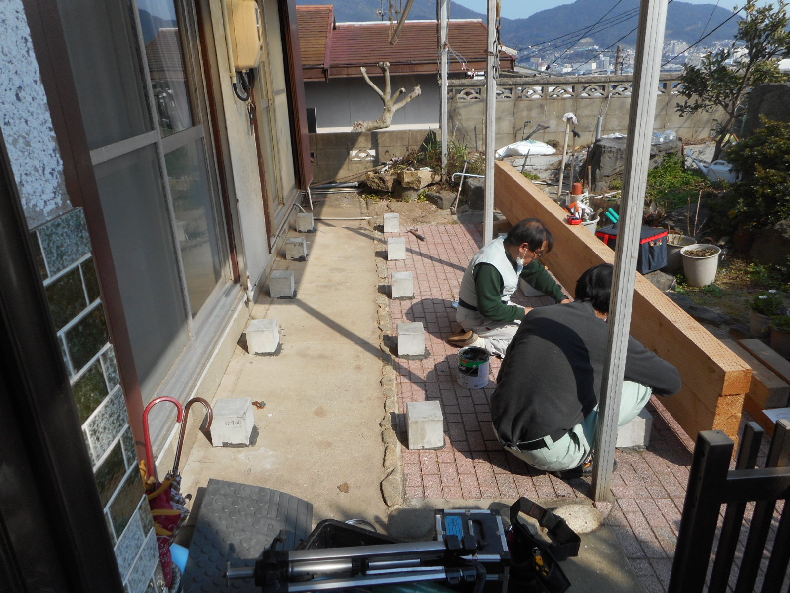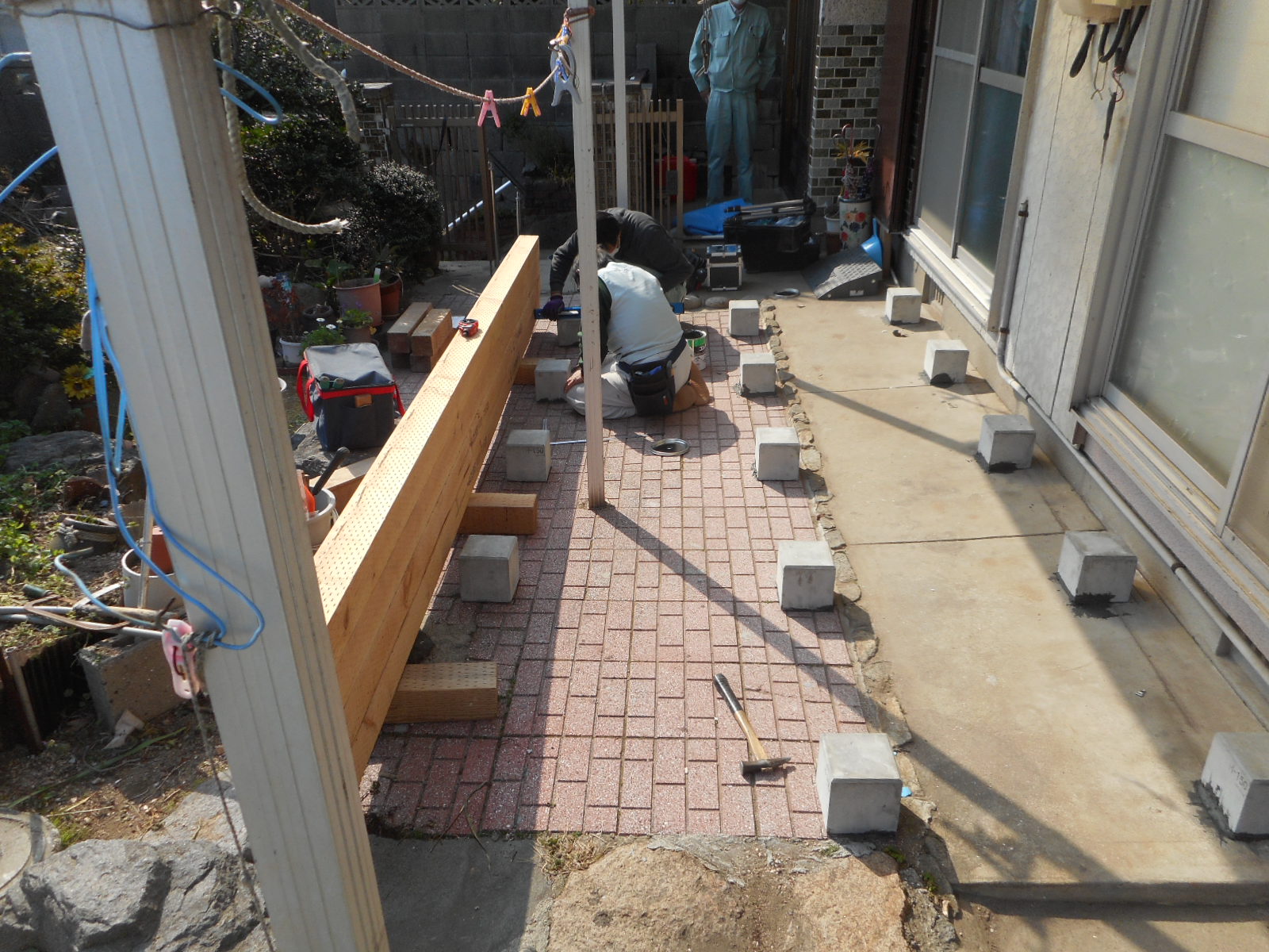 最初に、束石を施工します!!  束石の施工を、右方向から見る!!