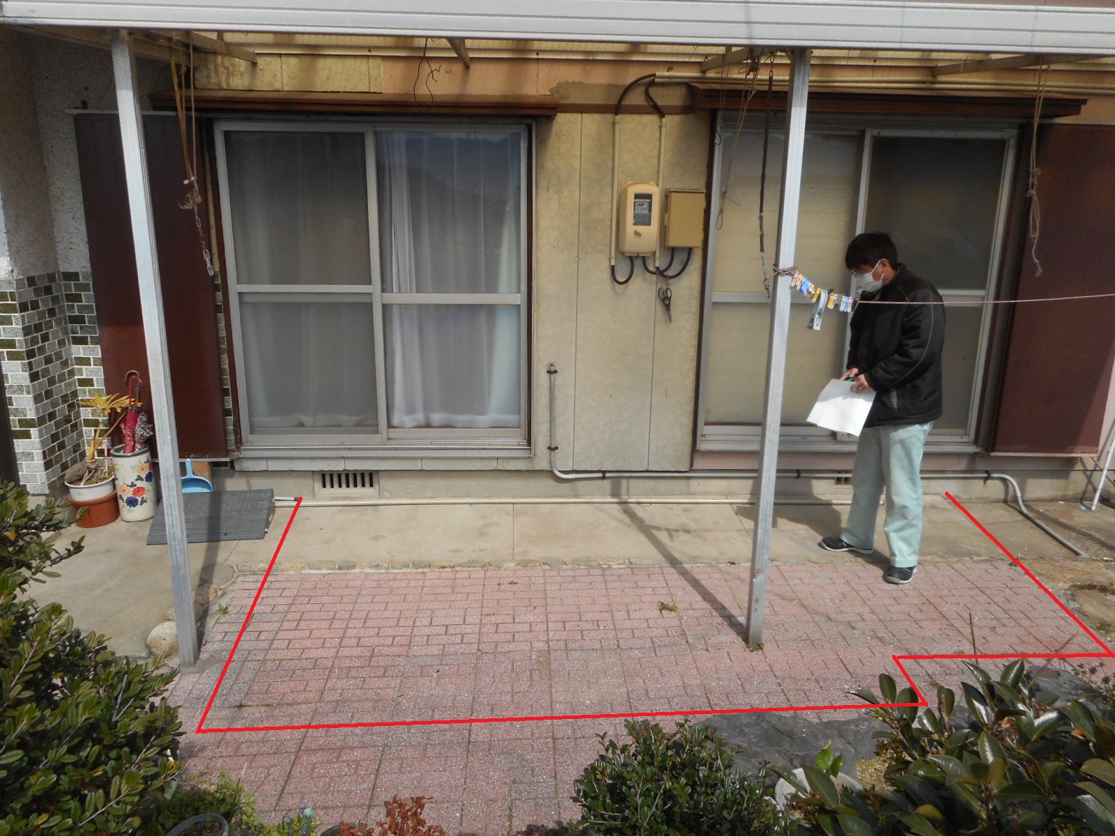 正面から見る!!(赤線の様な形のウッドデッキを造ります)