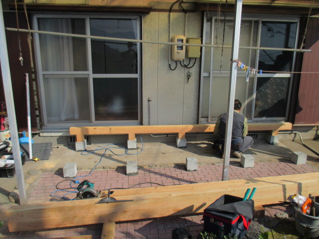 束石の上に束柱を立て、土台を施工して行きます!! 同様に順次土台を、施工して行く!!