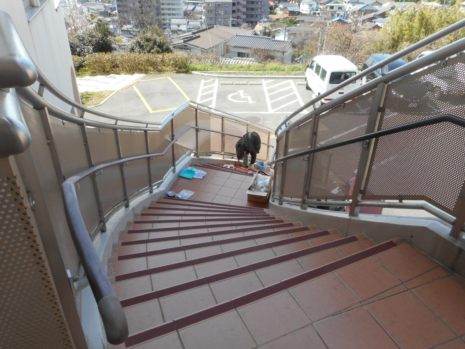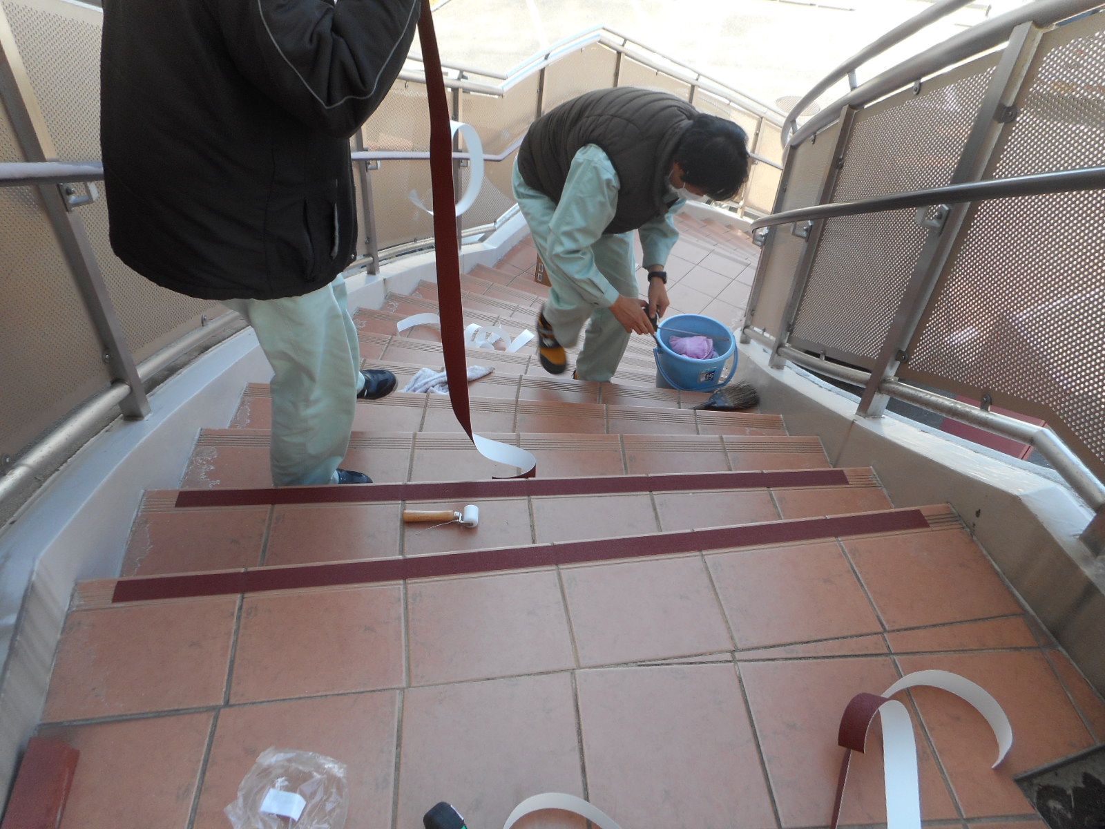 | 上から順番に掃除をしながら、スベリ止めテープを張って行きます!! | 順次下まで同様に、スベリ止めテープを張って行きます!! |
