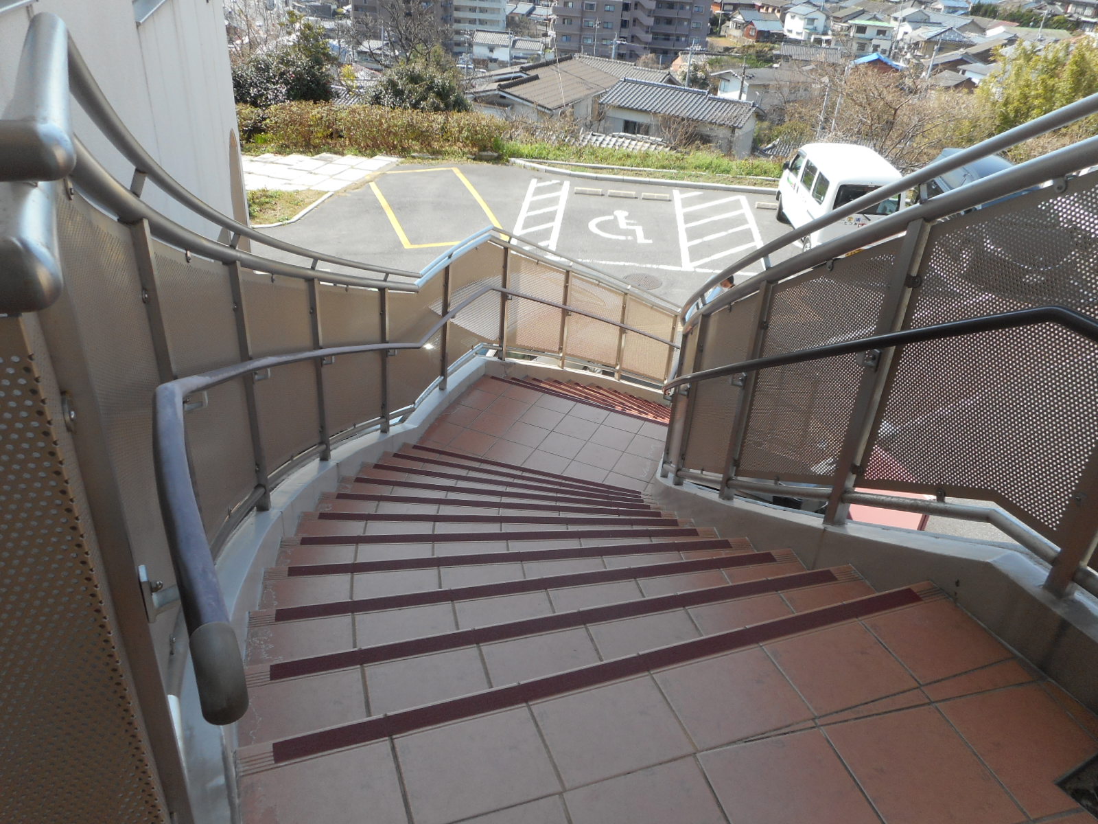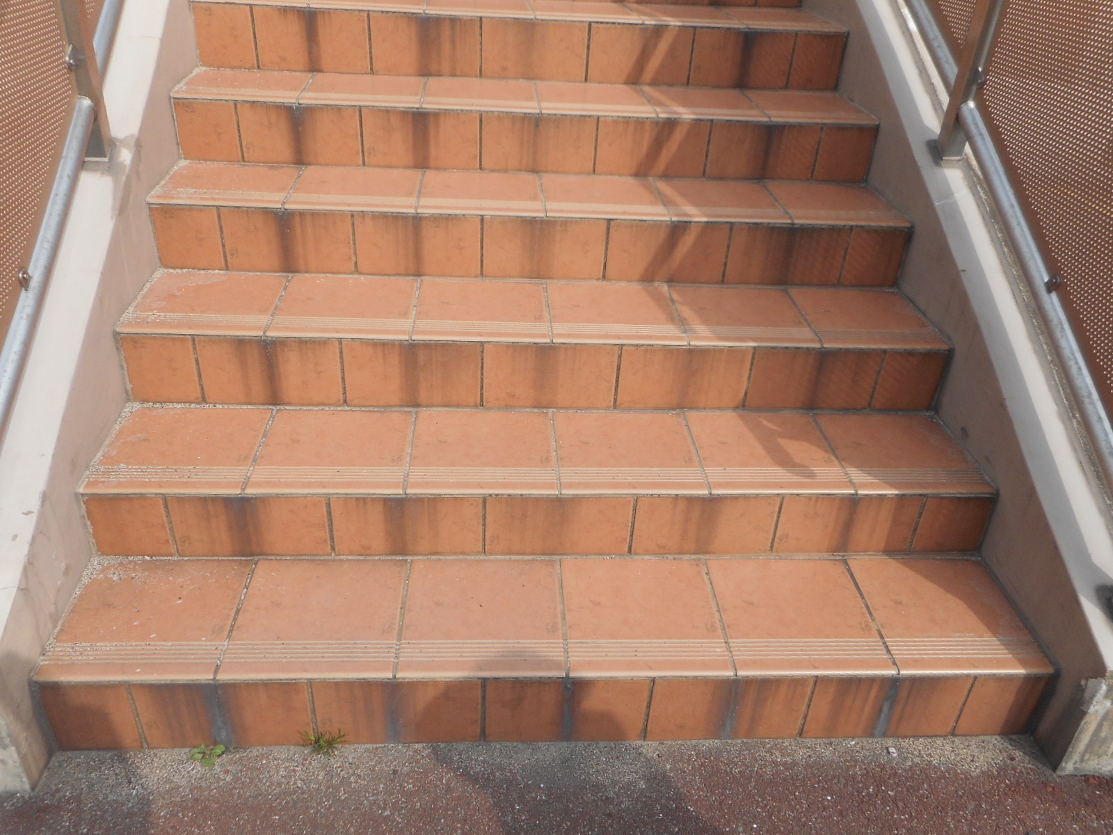 | 2階に上がる外階段!! | タイルの鼻先にはスベリ止めのタイルが張られているのですが、それでも雨降りには滑る様です!! |