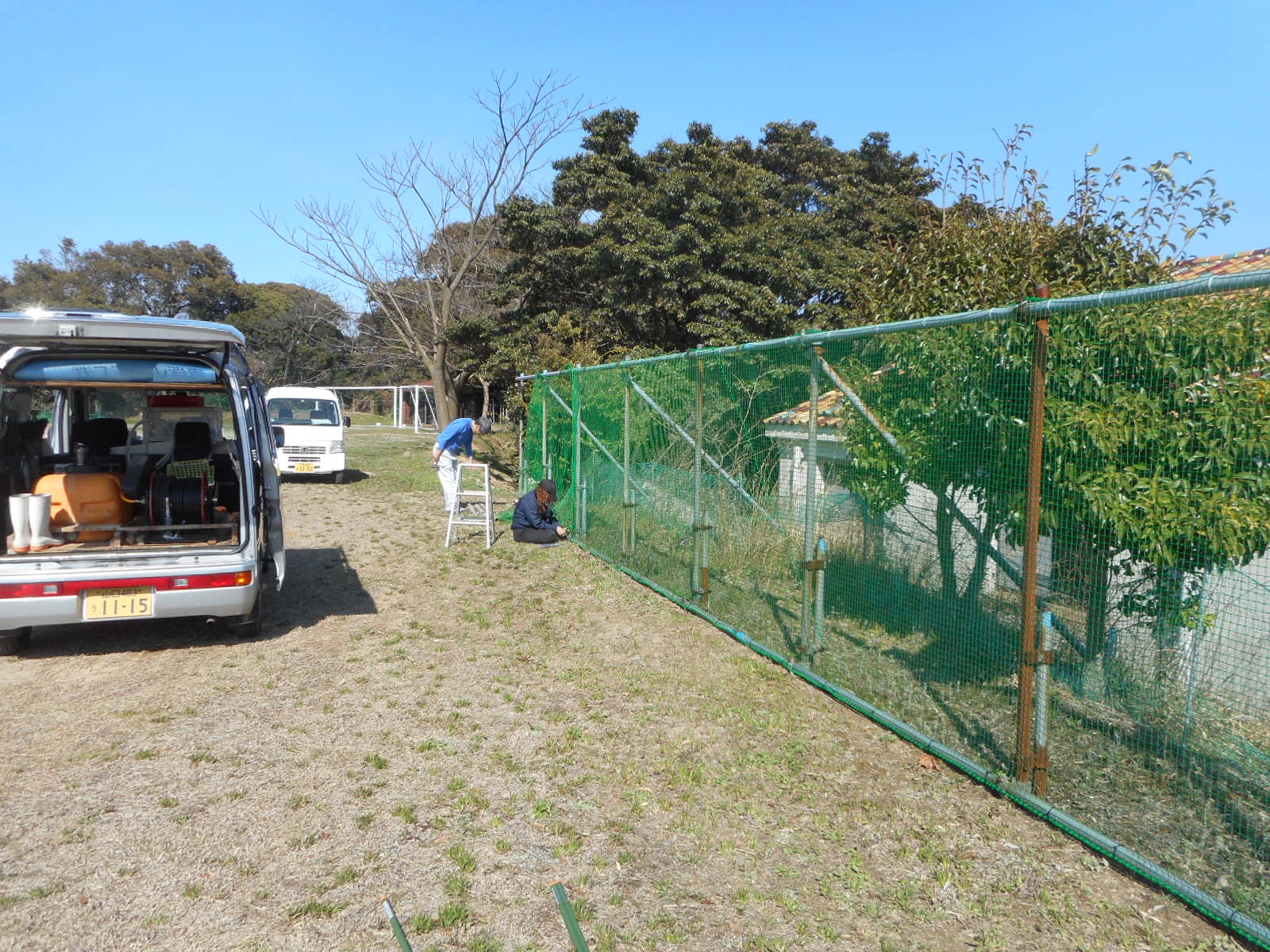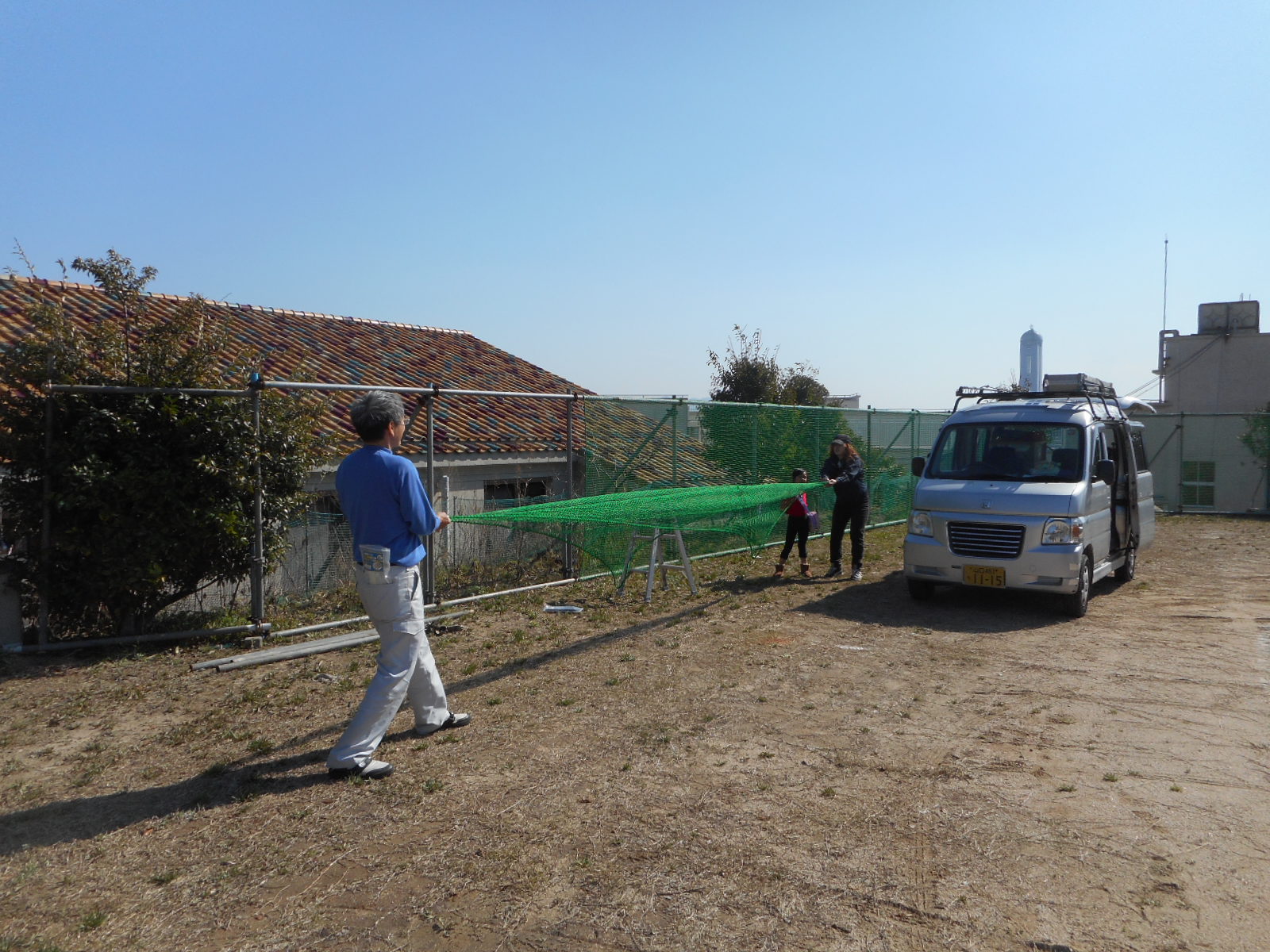 | 既存のネットを撤去し、新規のネットを張ってて行きます!! | 10mスパンのネットを、張る前にしっかり伸ばします!! |