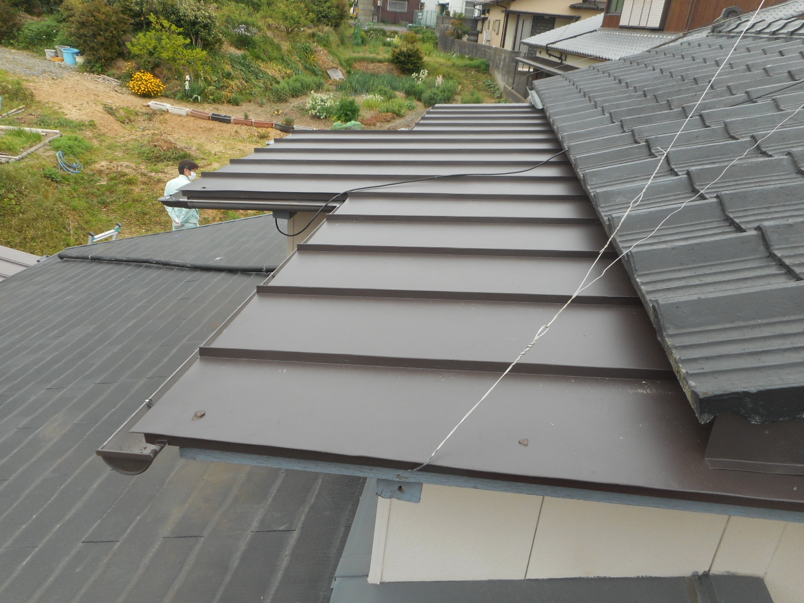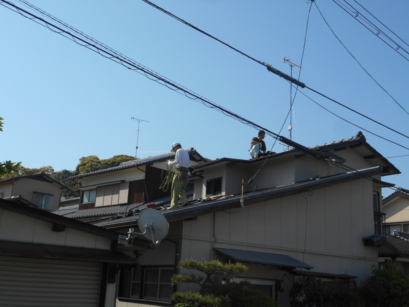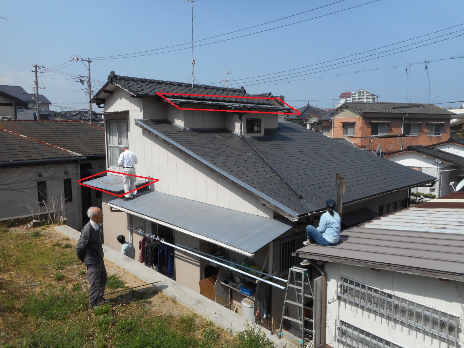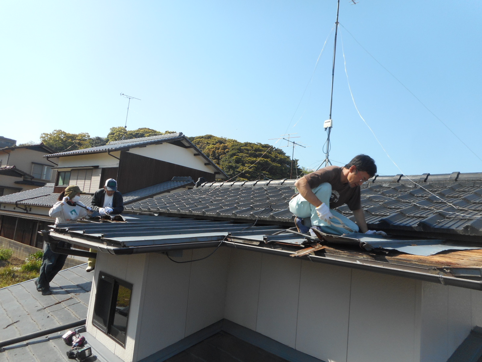 *工事前の状態!!(状態が非常に悪く、風で飛ばない様に施主さんがロープを張って押えています)