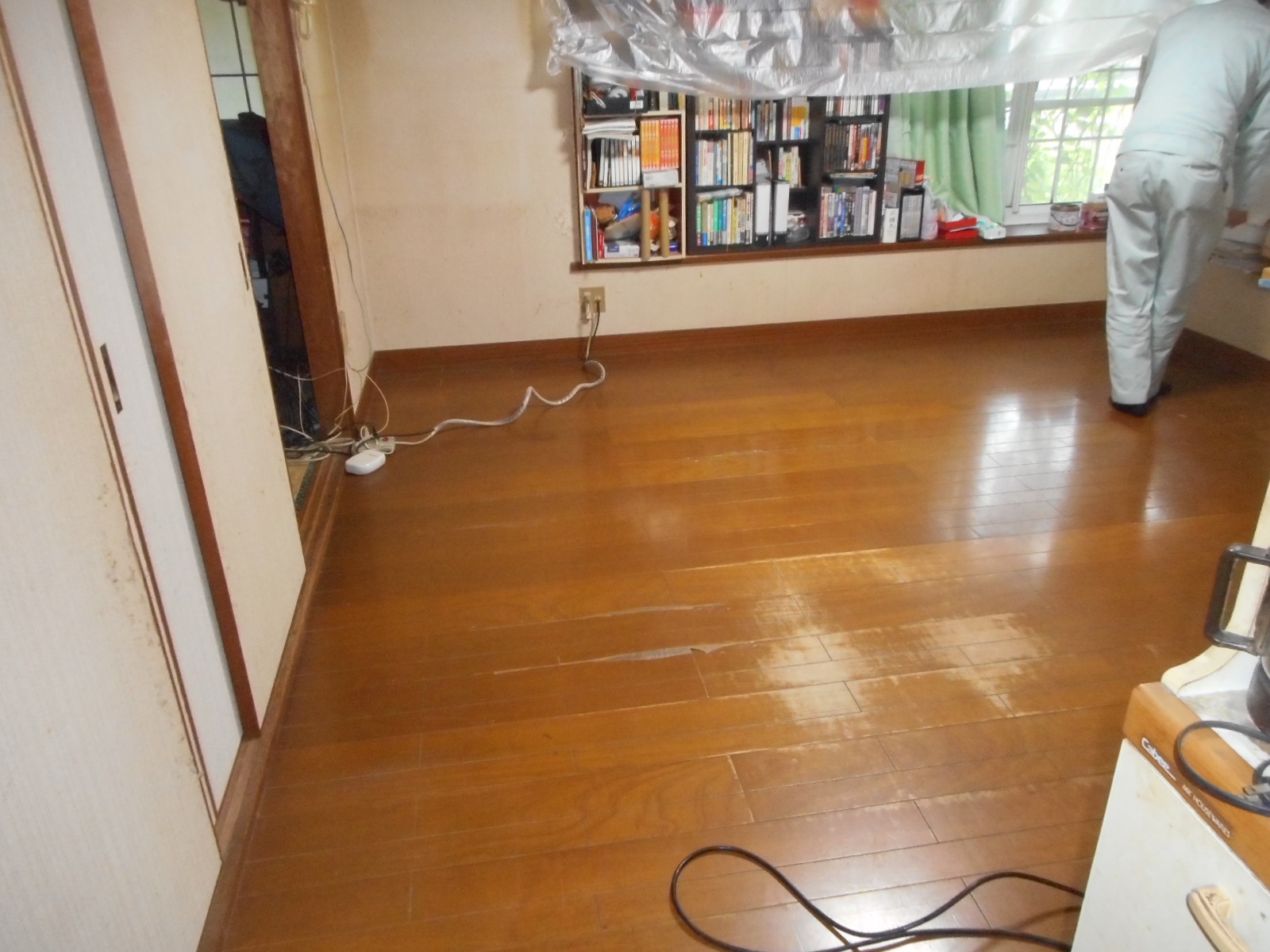 | ビフォー!!(作業前に養生をしています)⇒ | アフター!!(既存上部より新規フロアを施工中) |