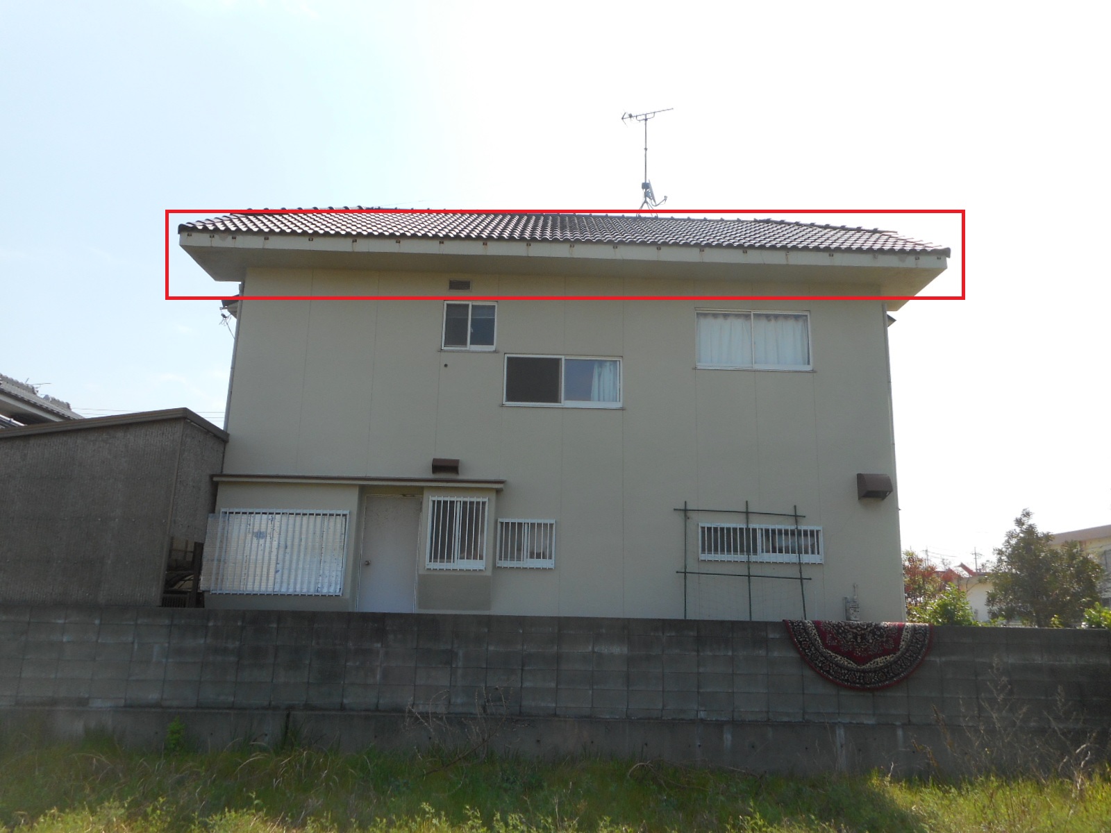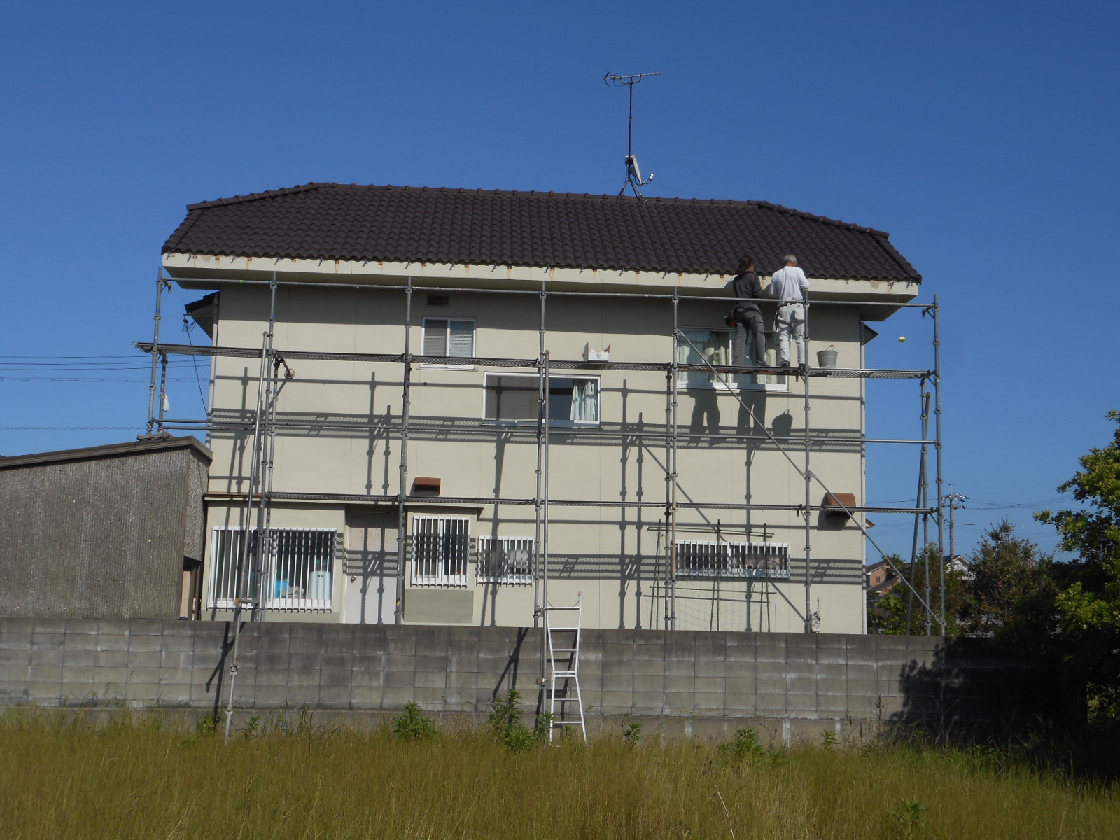 | 赤線□で囲った部分の雨樋が、強風で飛んで有りません!! ⇒ | 足場を組んで、作業中です!! |