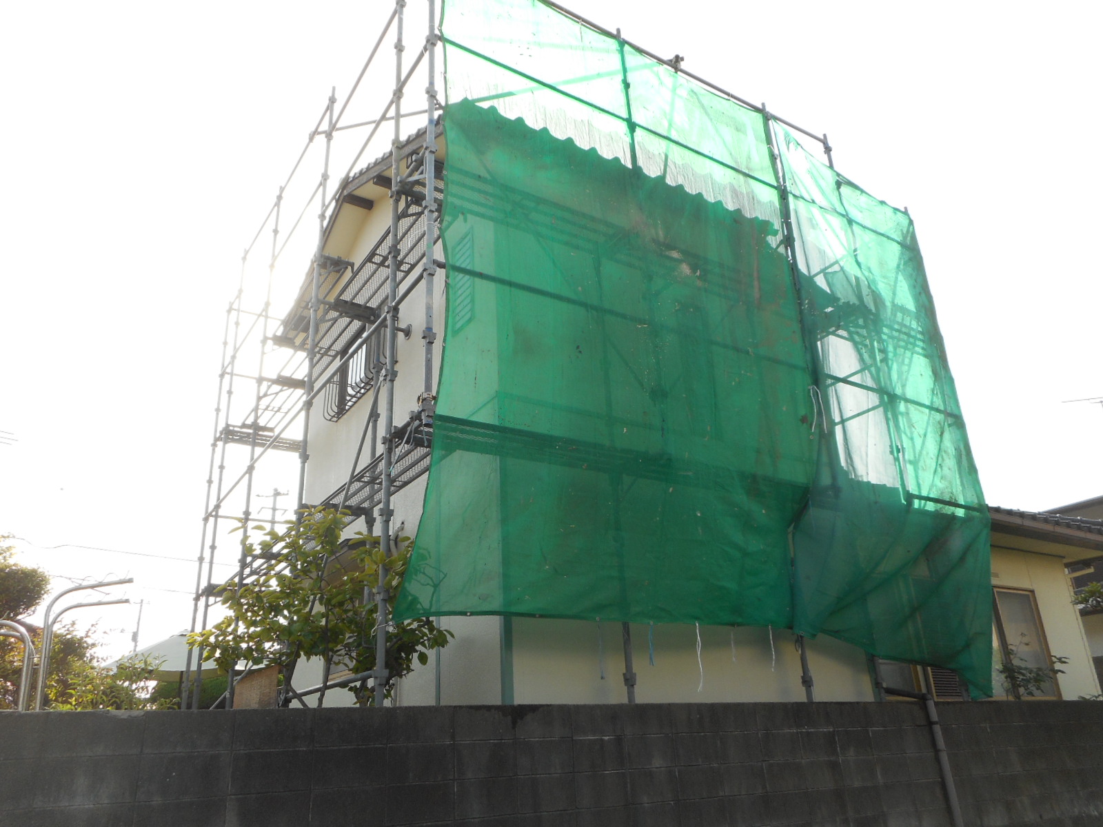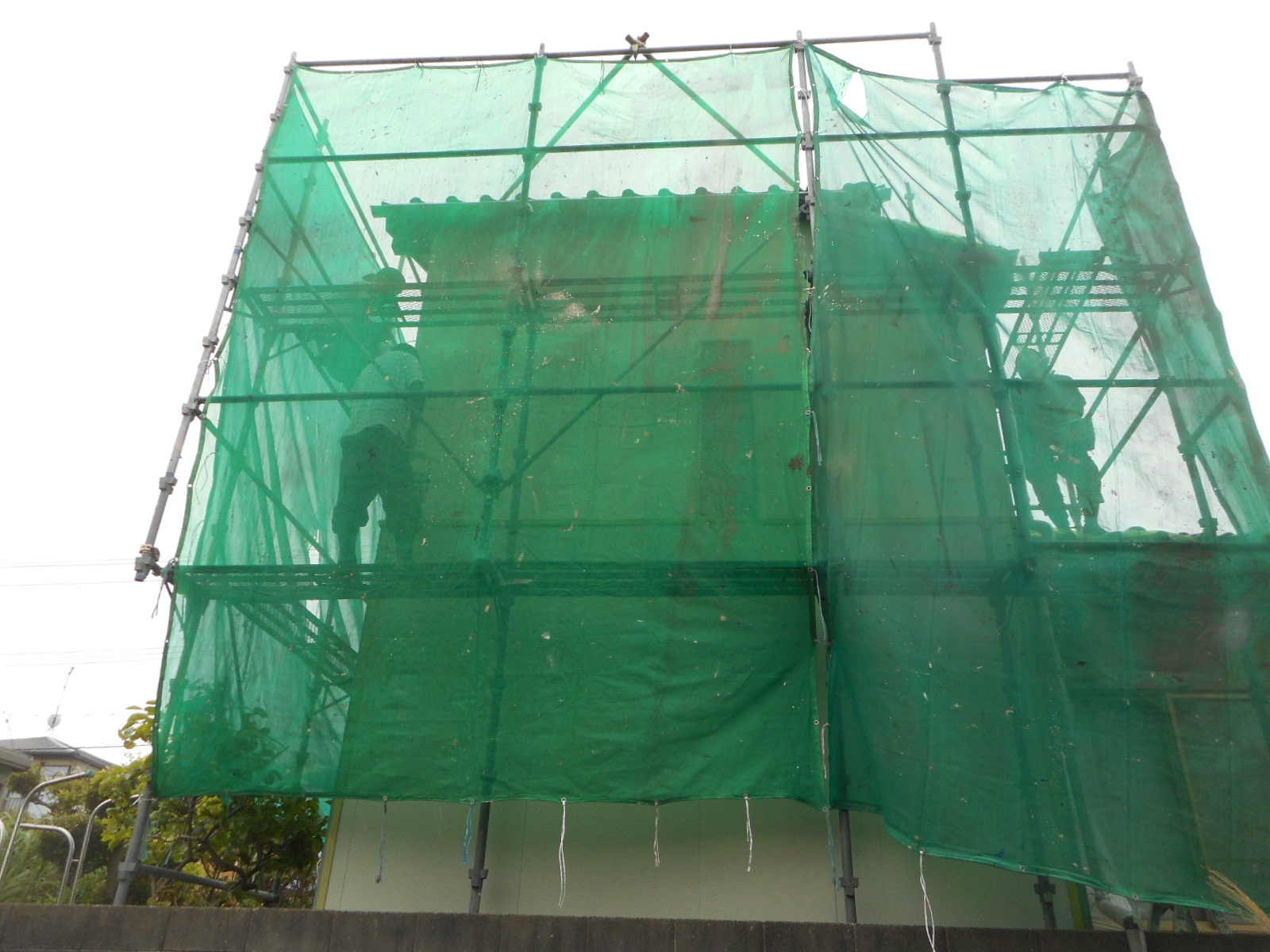 | 塗装用の足場を組み、この2階屋廻りすべてのサイディング目地やサッシ廻りのコーキングを打ち直し、全面塗装をします!! | 順次作業を進めています!! |