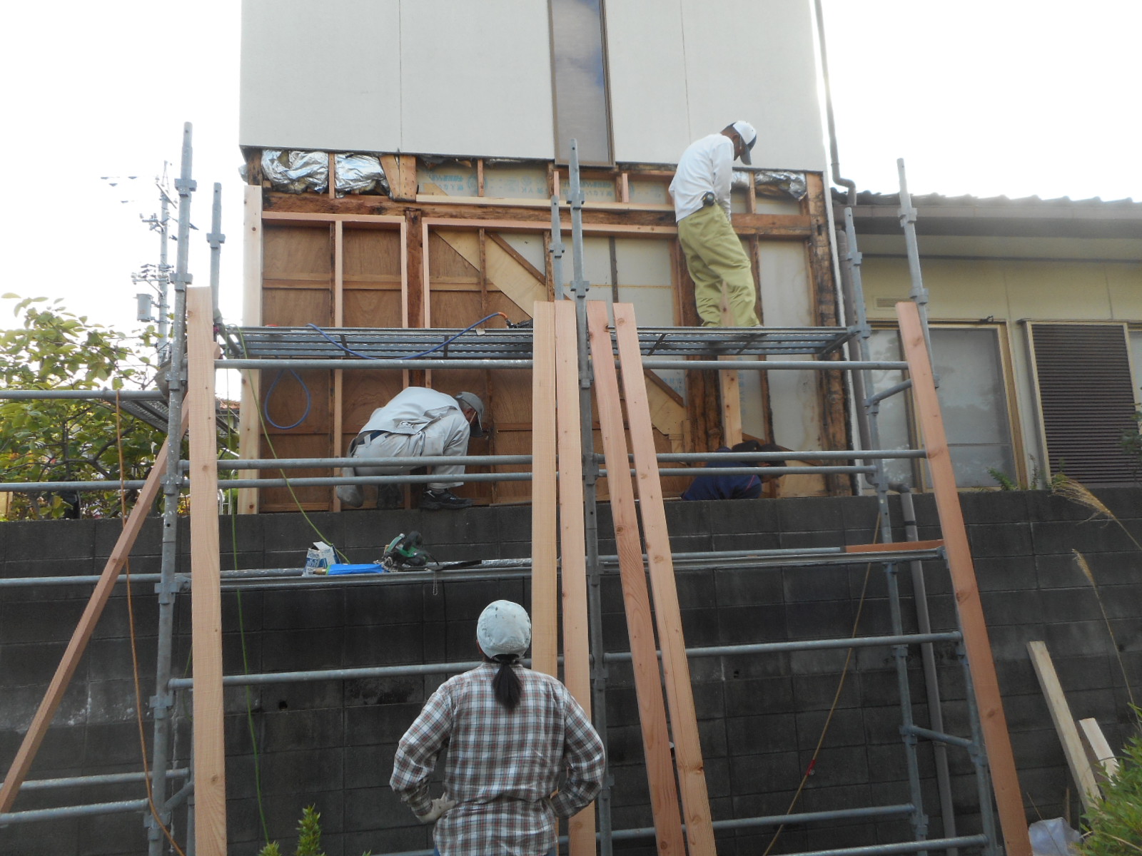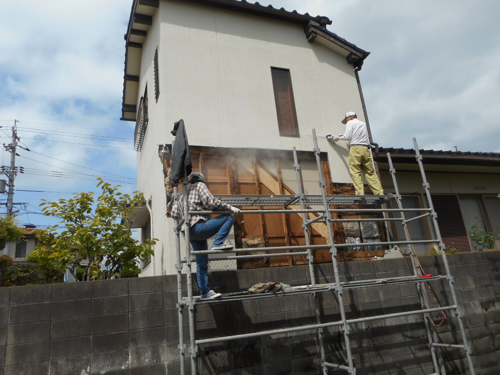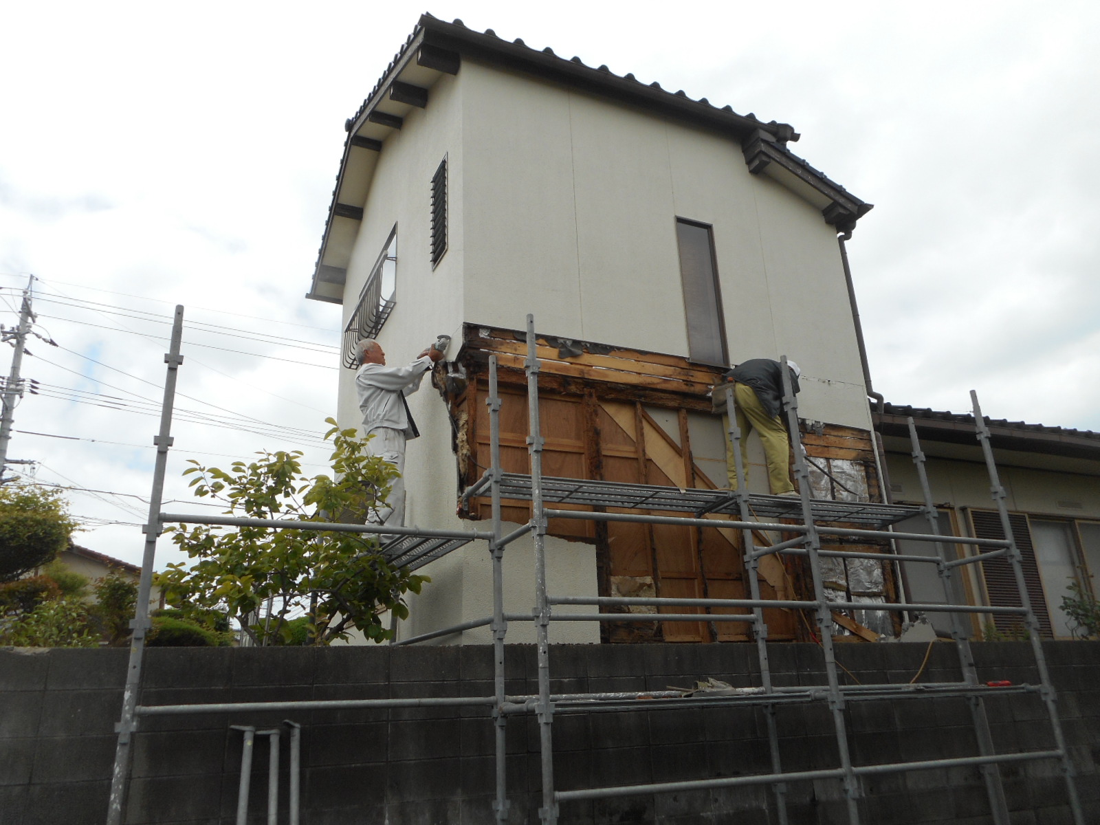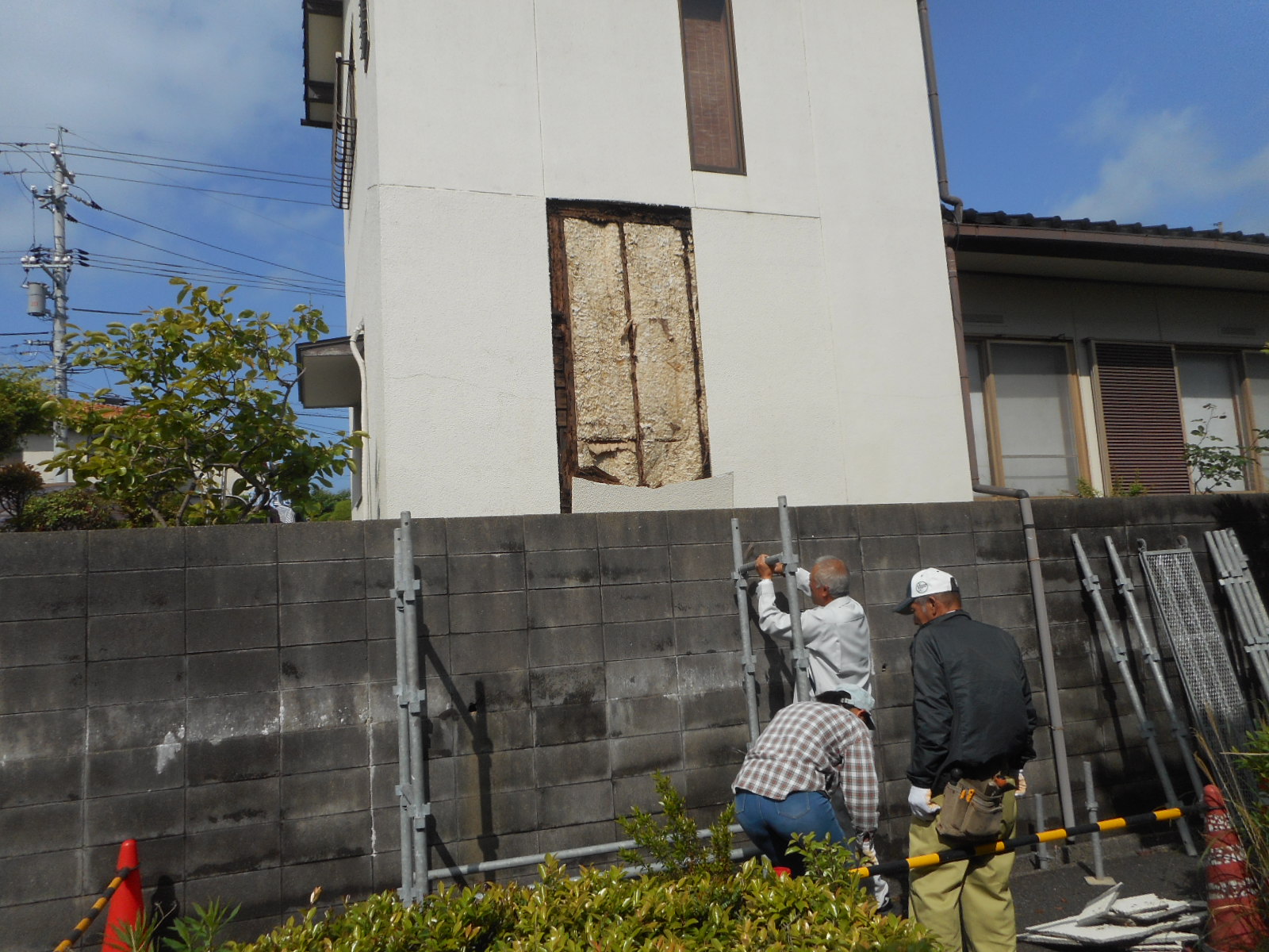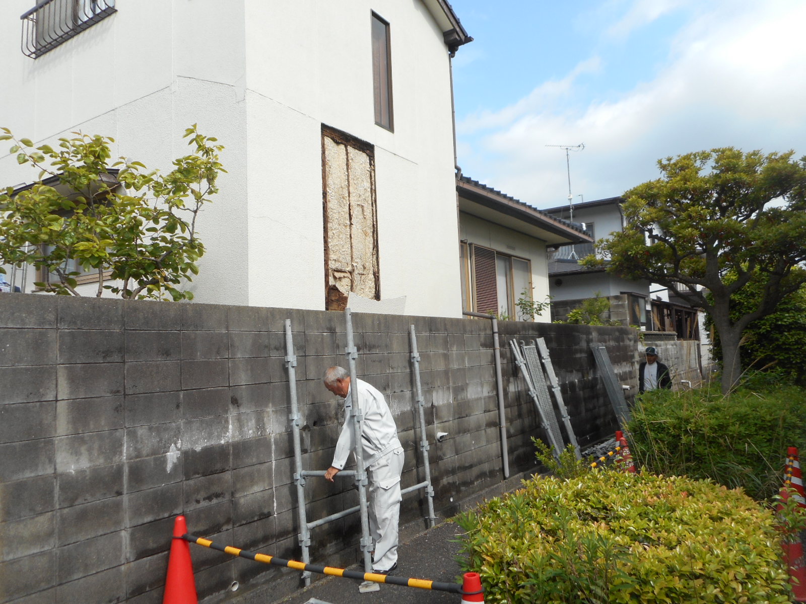 先日、当社がこれまでシロアリの駆除工事等をやらせて頂いた新垢田の方から夜中の物凄い音がしたので外に出て見たら、外壁が落ちていたと言う電話がありました。