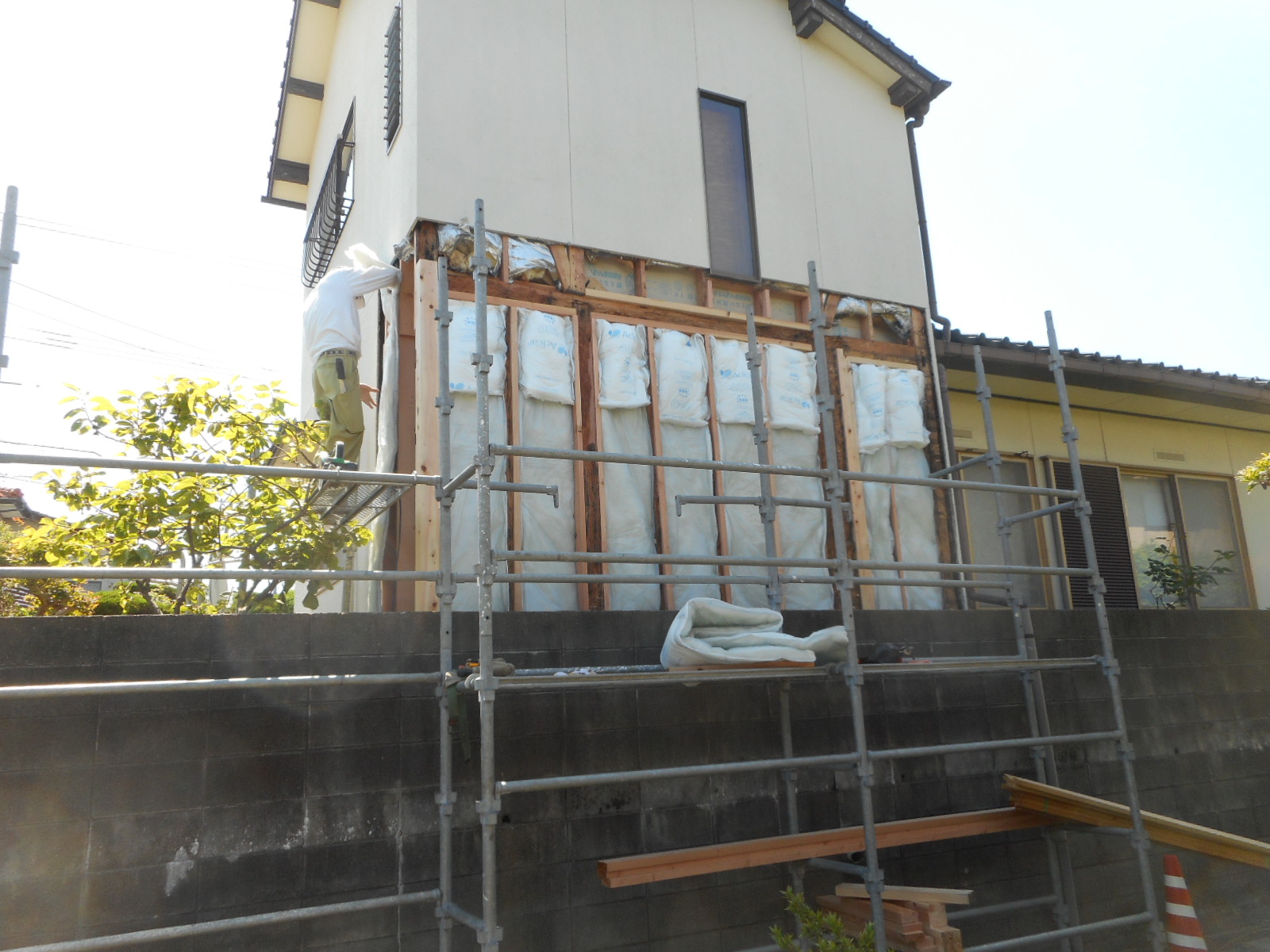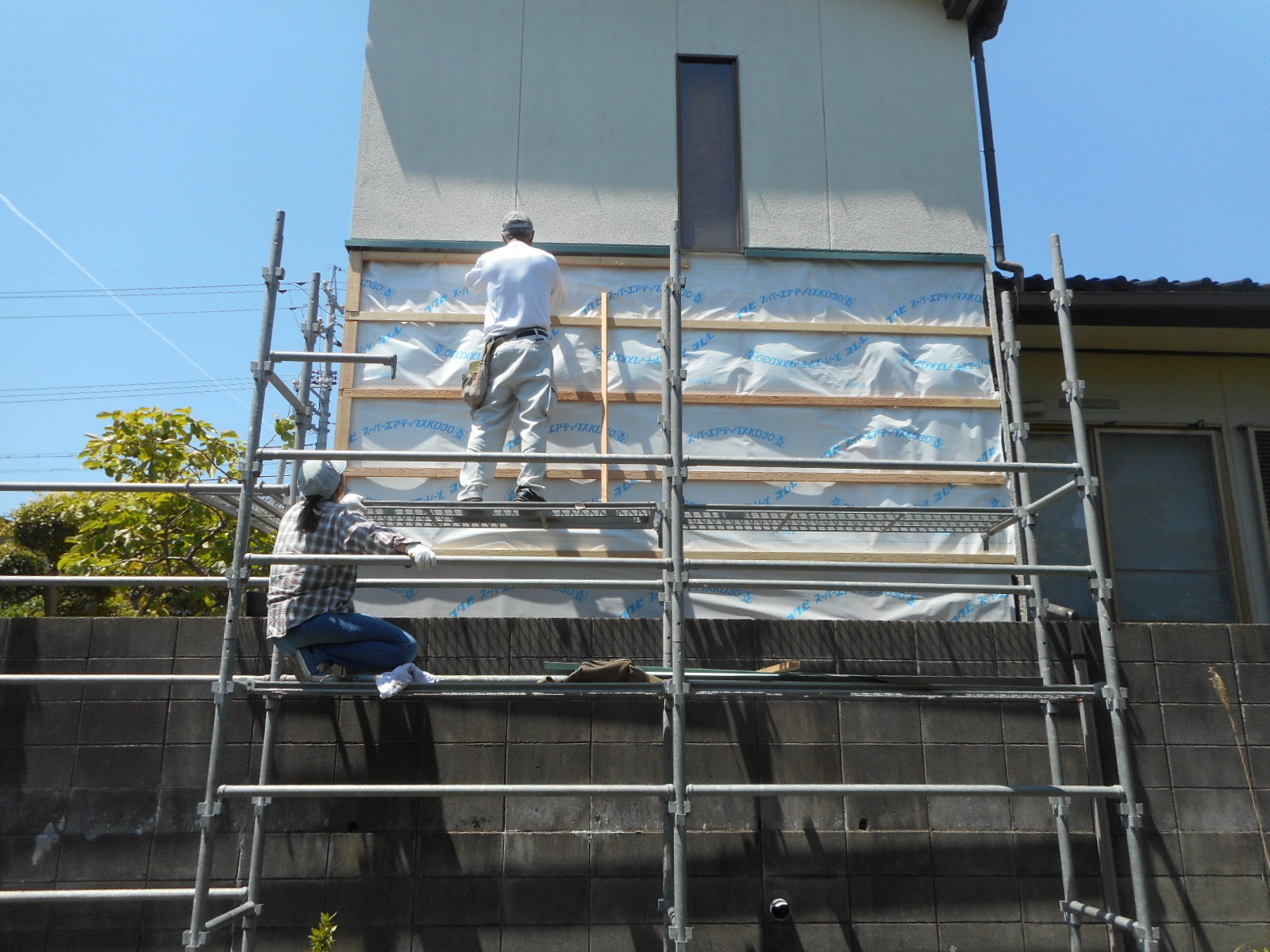 | 下地整備後、新規の断熱材(グラスウール)を入れます!! | 透湿、防水シートを施工後、サイディング下地の胴ブチを施工します!! |