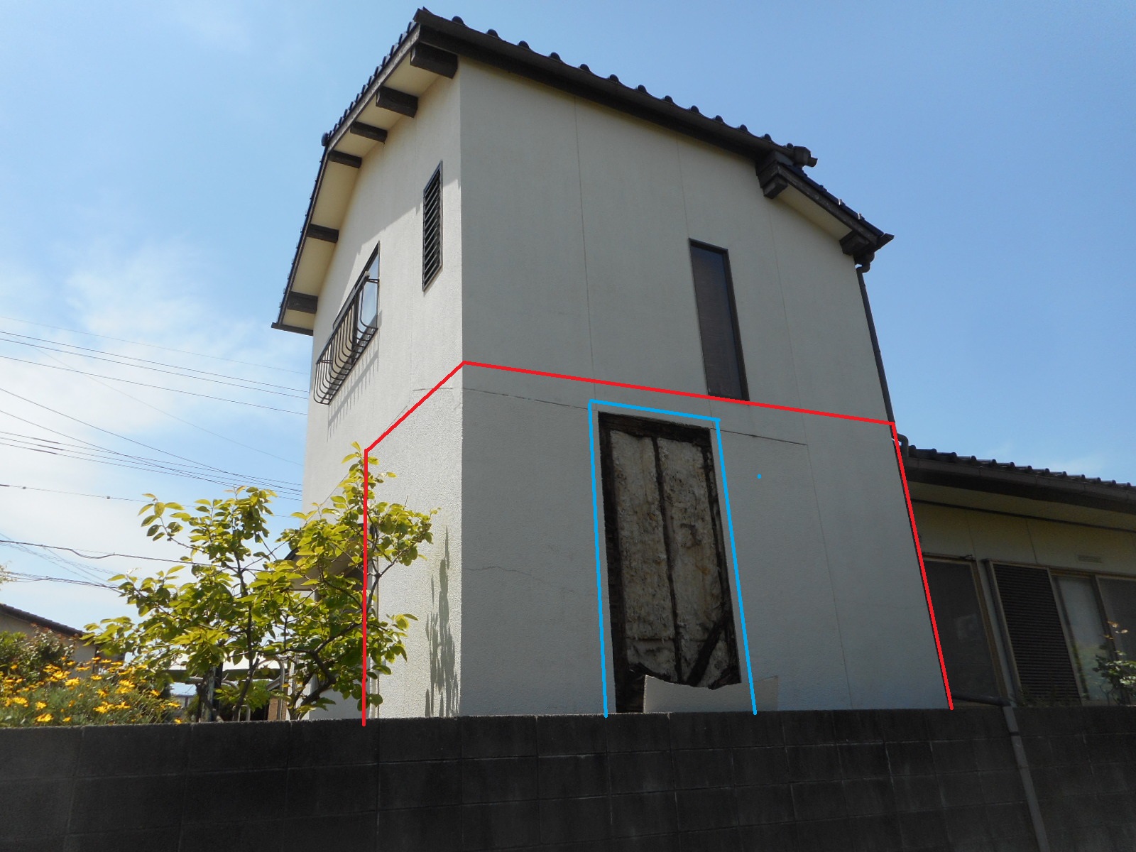 青線□で囲った部分の外壁(モルタル壁)が、きれいに剥がれ落ちています。