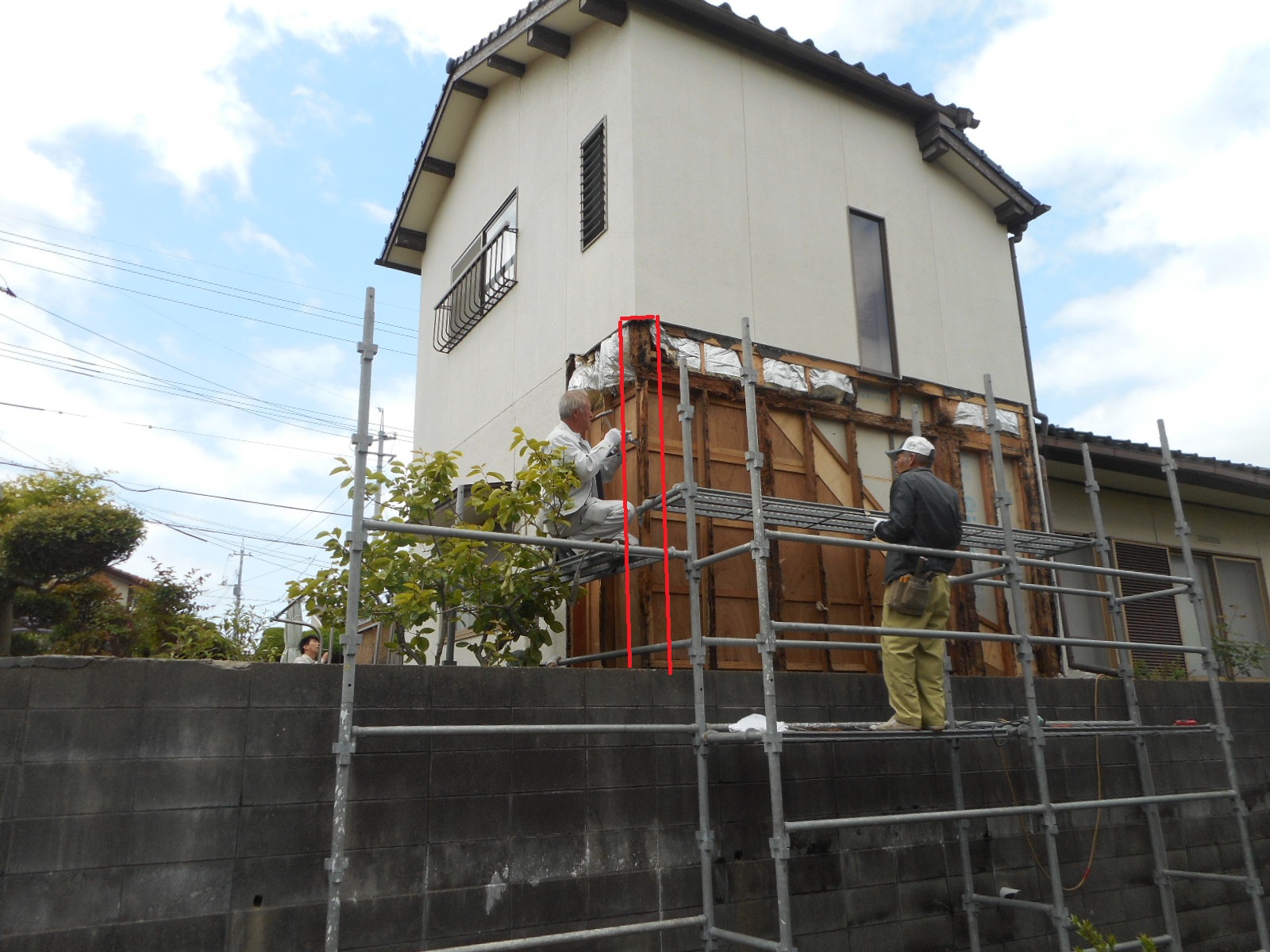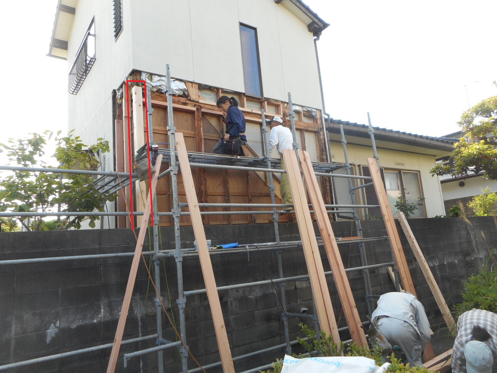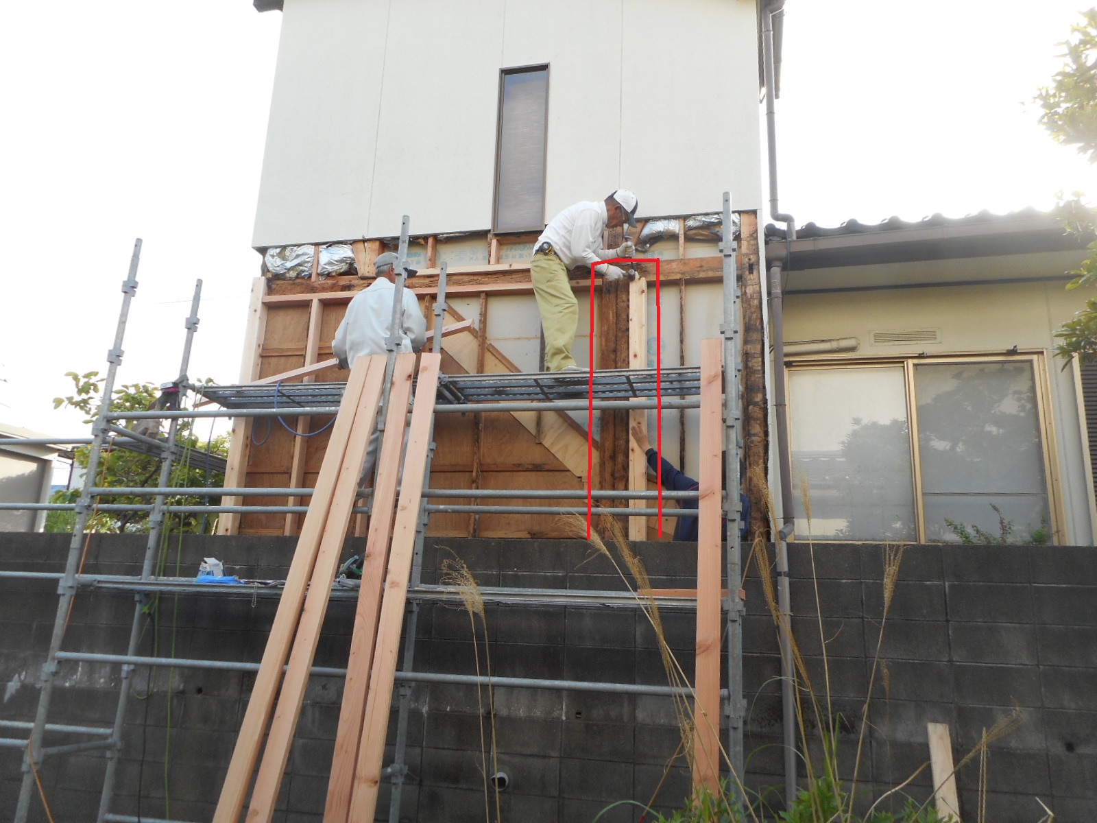 | 赤線□部分の柱も状態が良くないので右に新規の柱を抱かせました!! | 胴差しの下にも補強を入れ、他の柱や間柱も補強や交換をします!! |