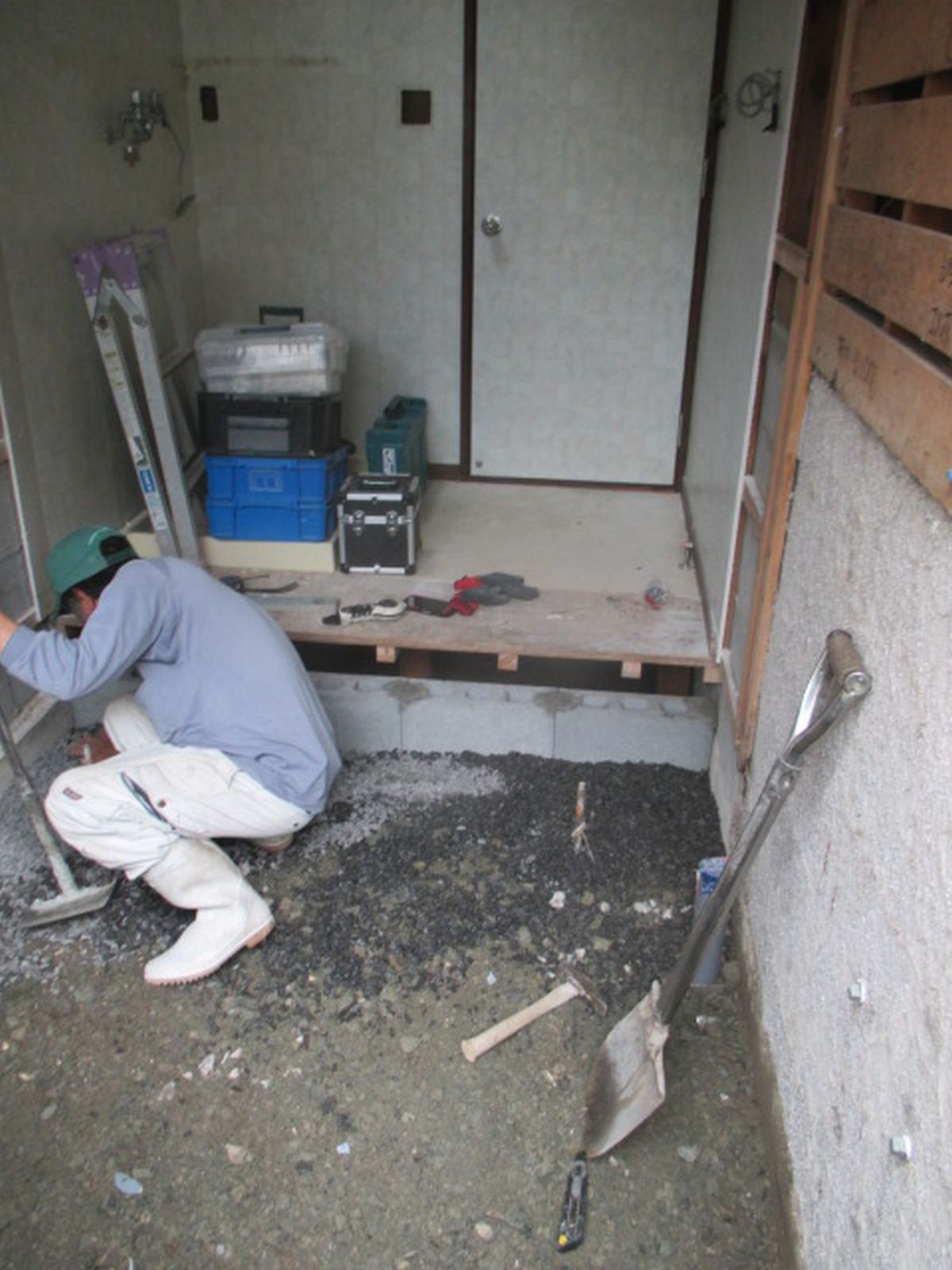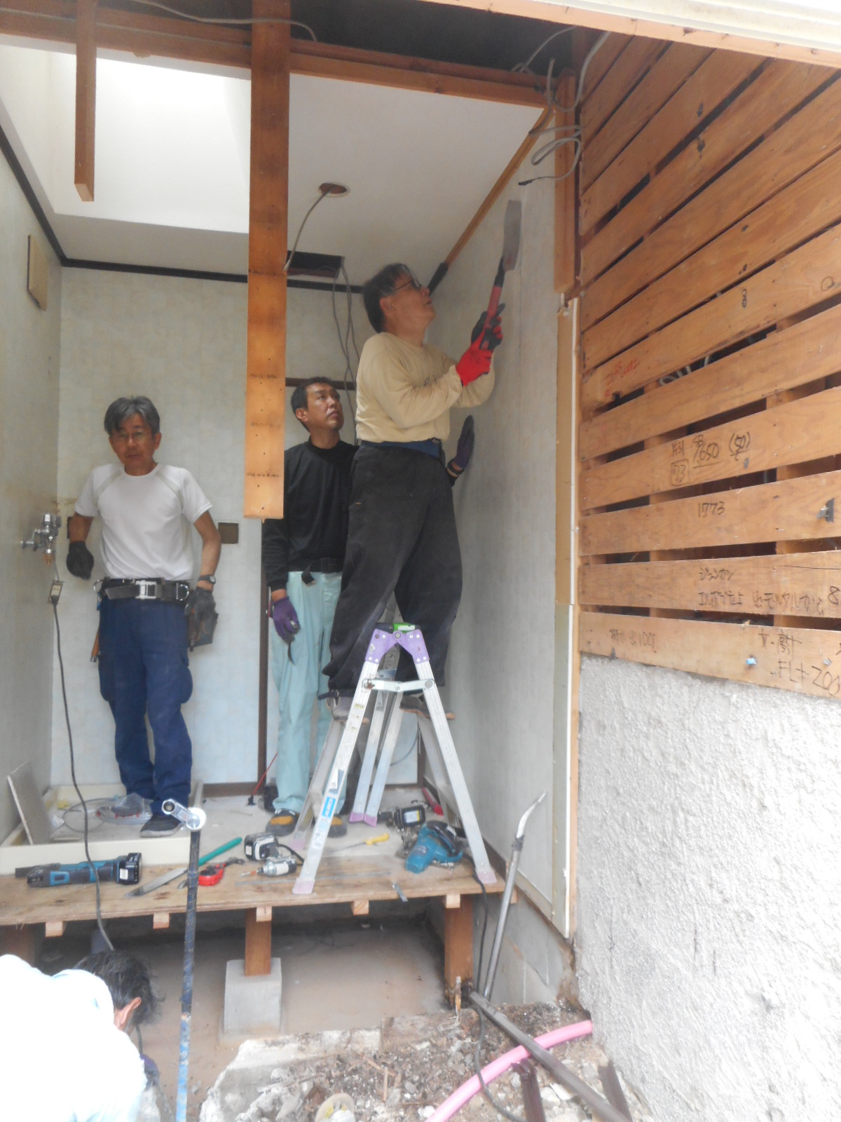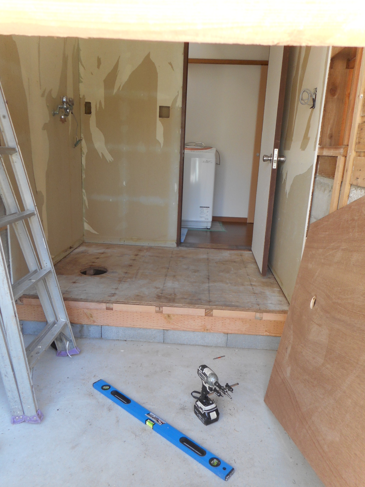 浴室を脱衣所側へ広げる分、脱衣所の床と天井、壁を解体しています!! 浴室と脱衣所の境界に、新規の基礎ブロックを施工します!!