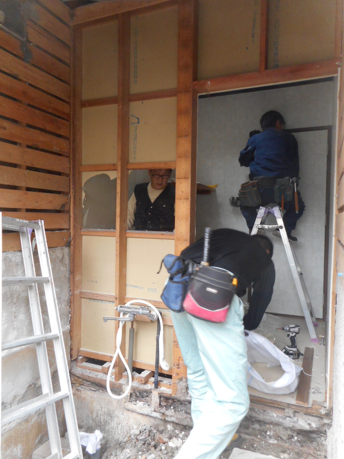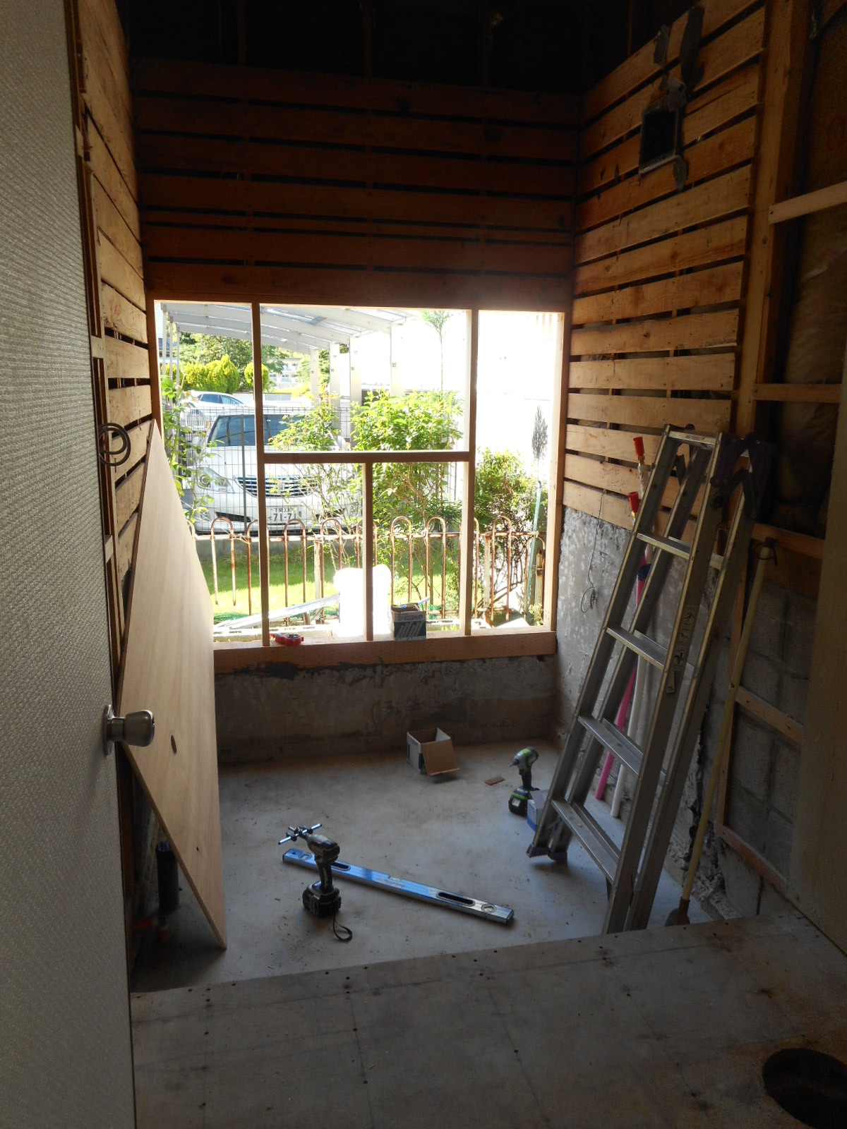 壁の造作と下地コンパネを施工し、新規のサッシを取付けました!! コンパネ部分に下地整備後、モルタルを塗りました乾いたら仕上げ塗装をします!!