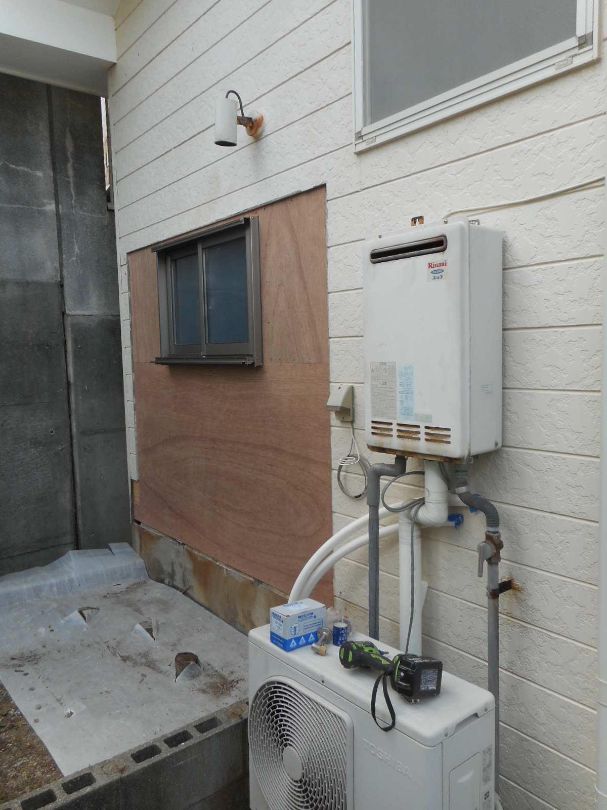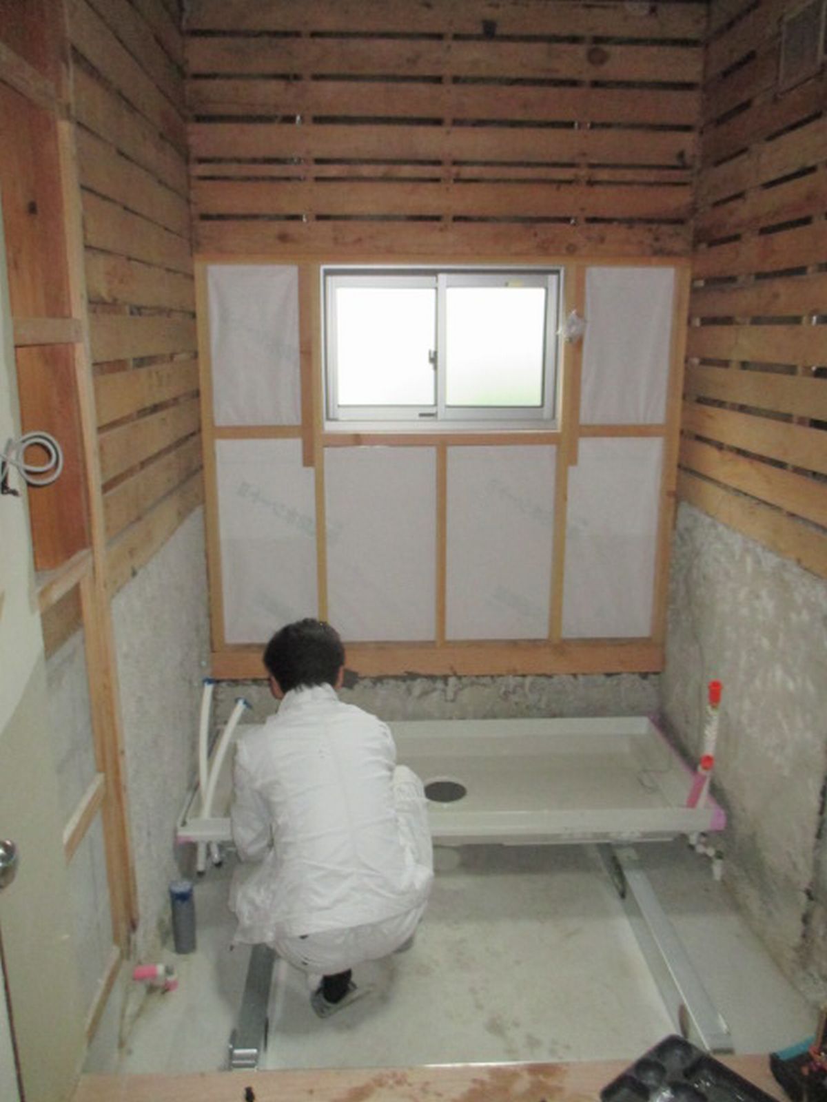 土台を施工し、浴室の土間にコンクリートを打ちました!! 窓を小さくするための、壁の造作をしています!!