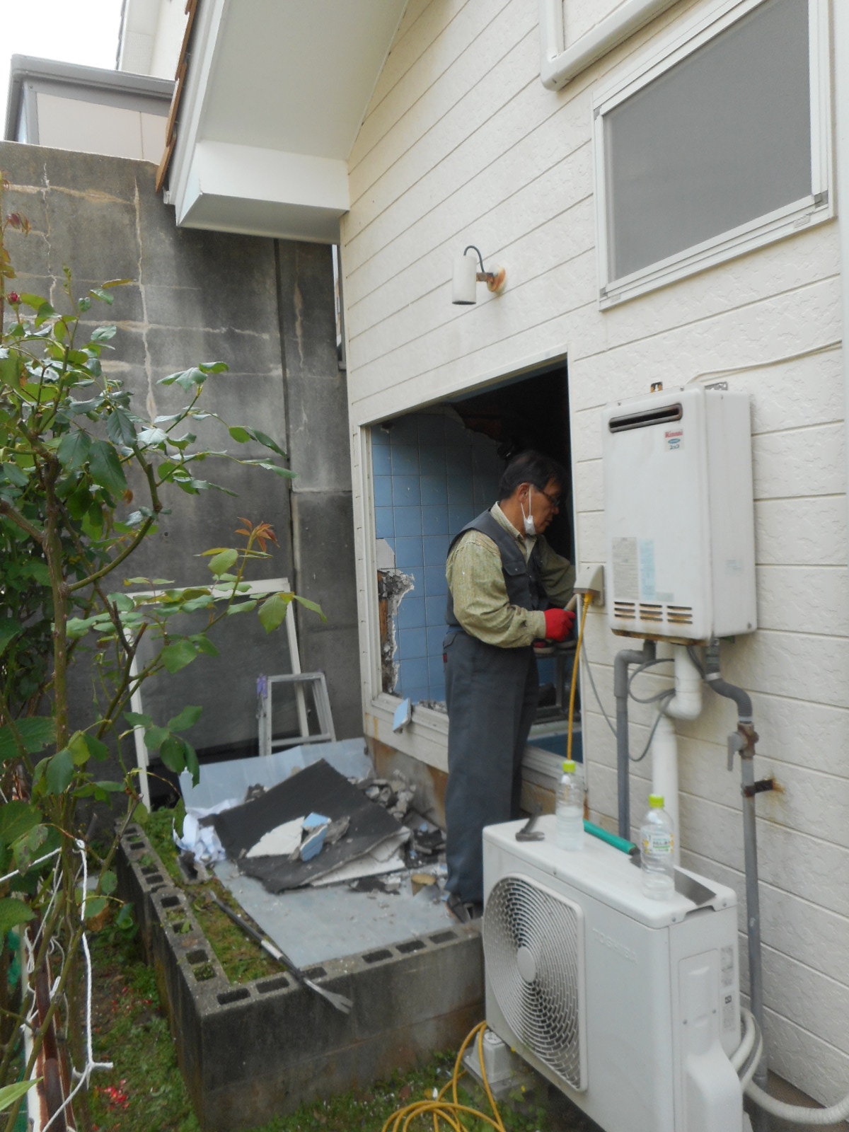 窓が大きいのでサッシを外し、ここから出入りをし作業を行います!! 浴室の中の解体をします!!