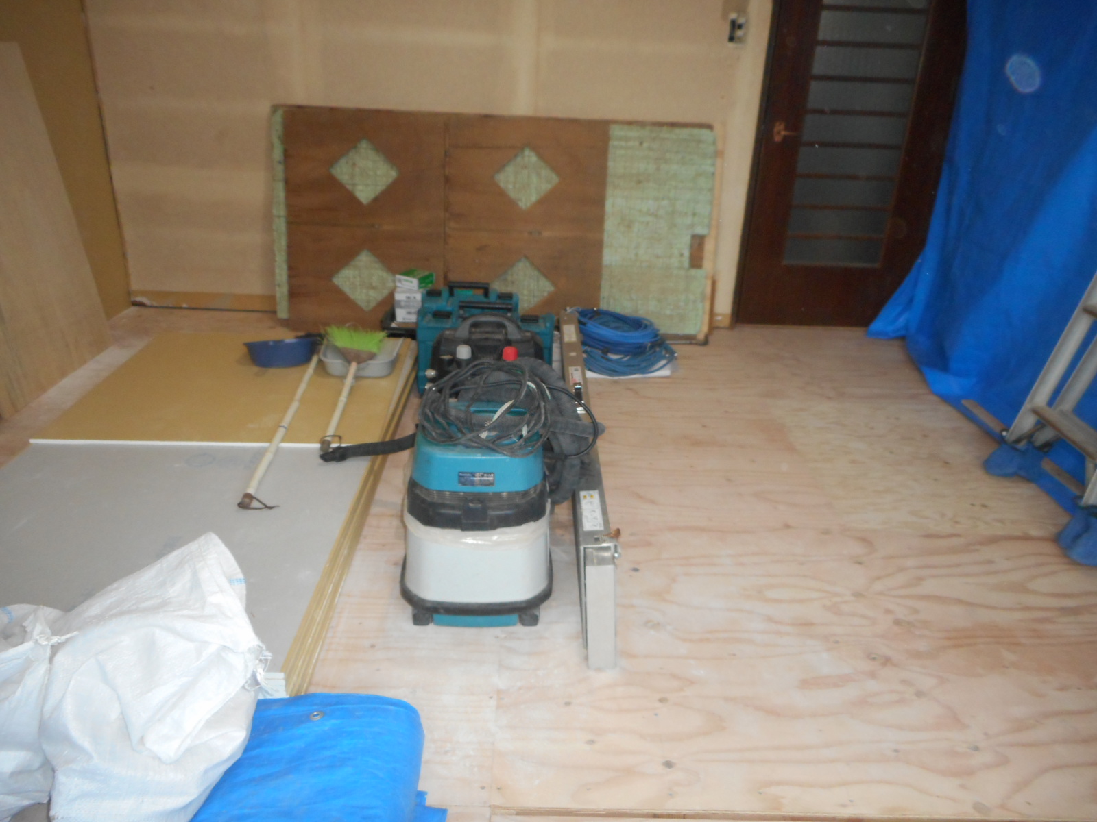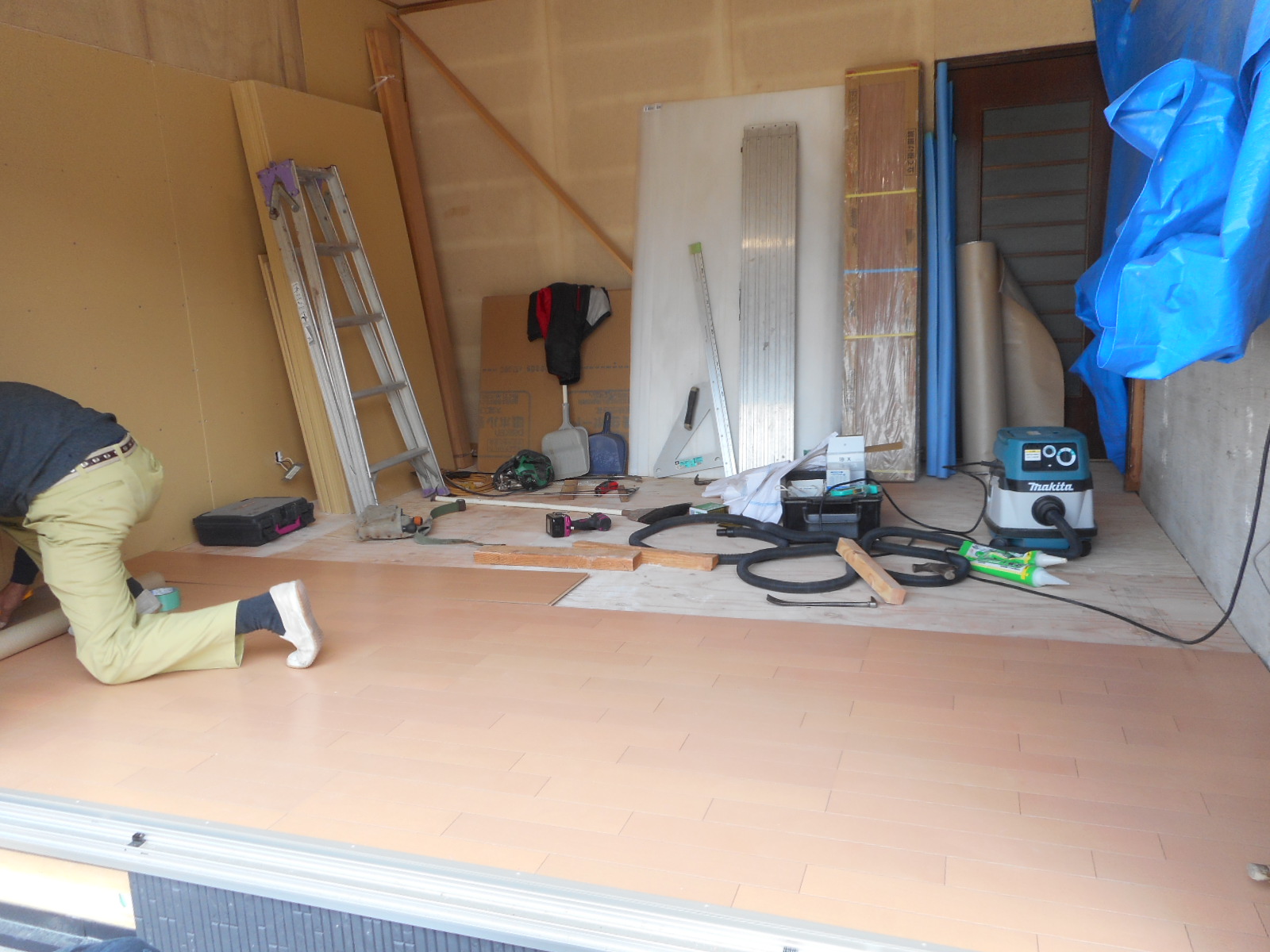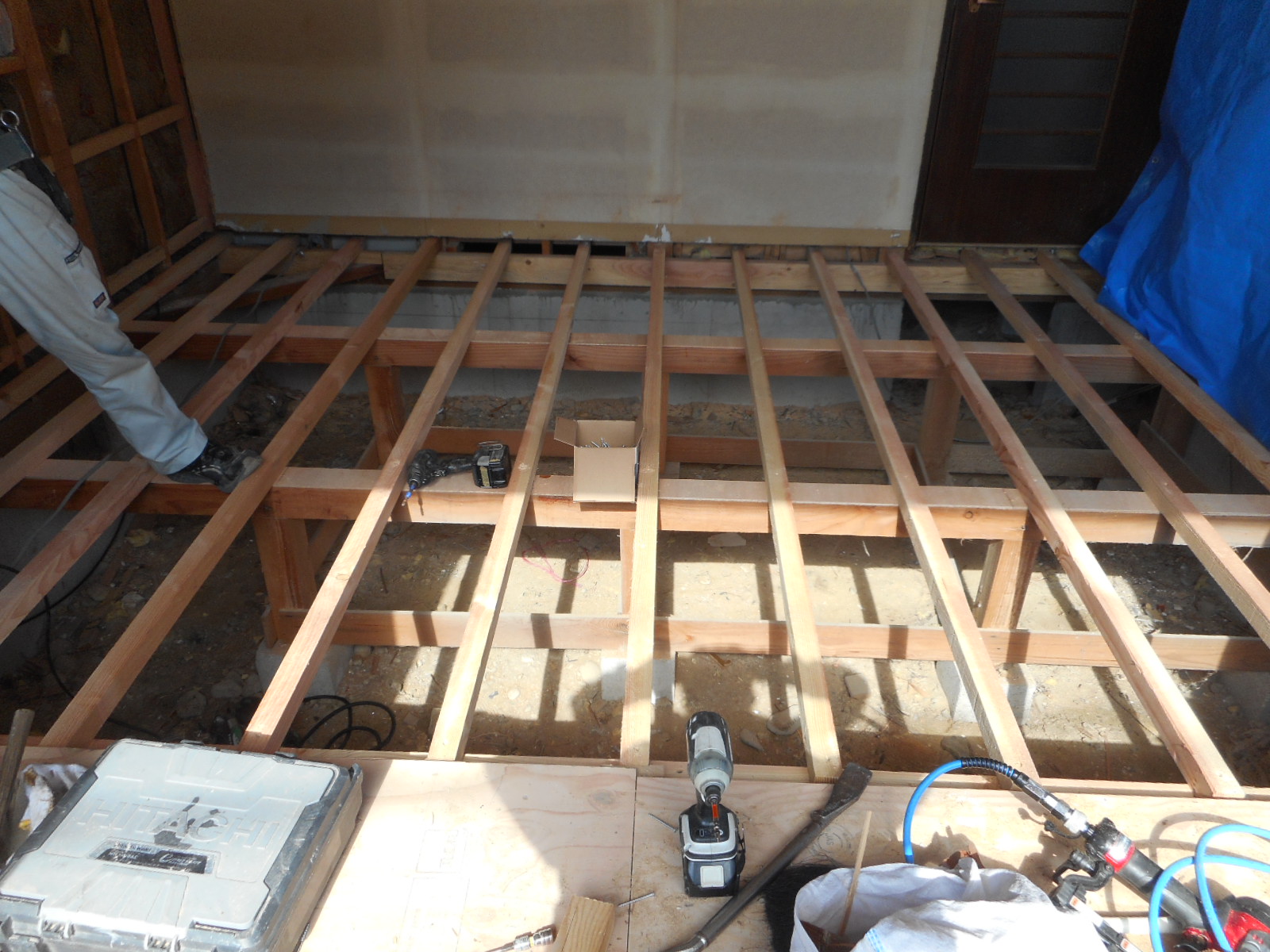 | 新規の根太を、施工しました!! | 根太の上に、捨て張りの合板を施工しました!! |