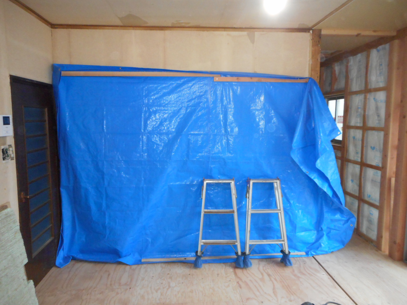 キッチンとの境界にブルーシートで養生をし、キッチンが使える様にしています!!