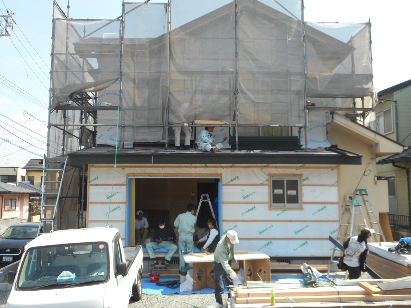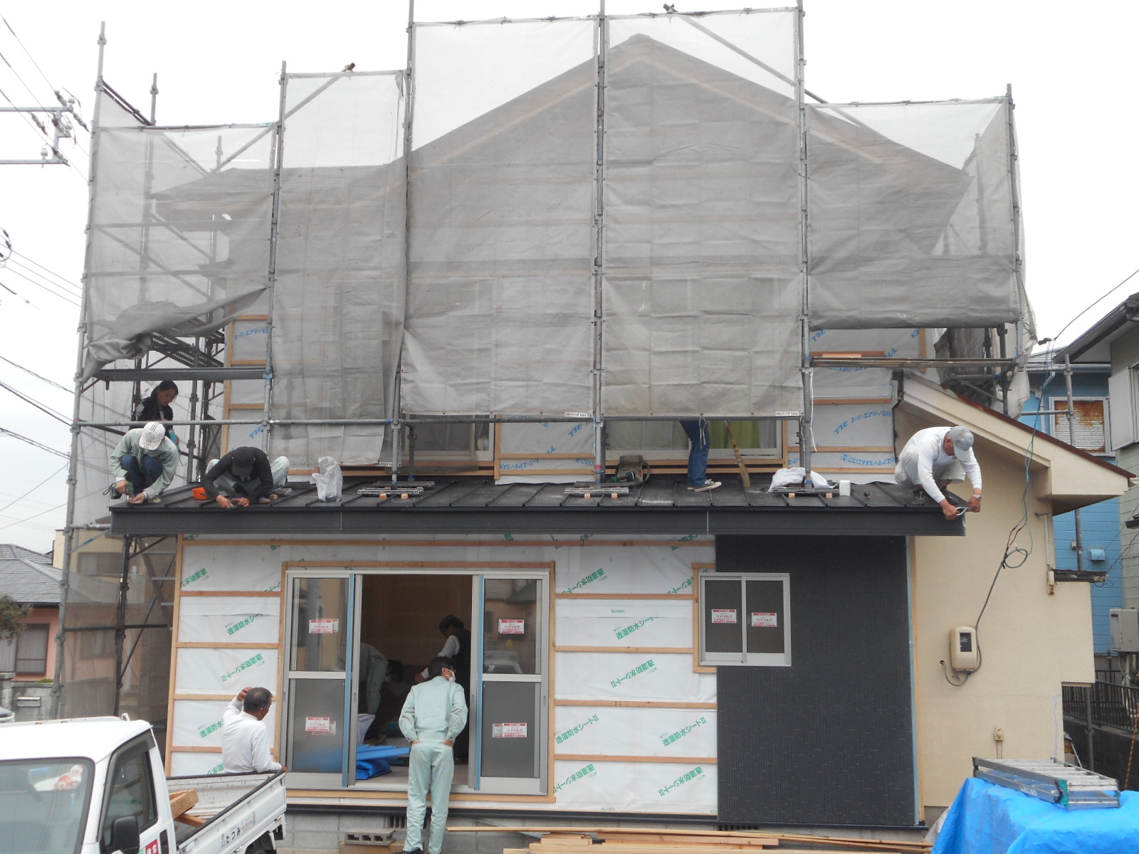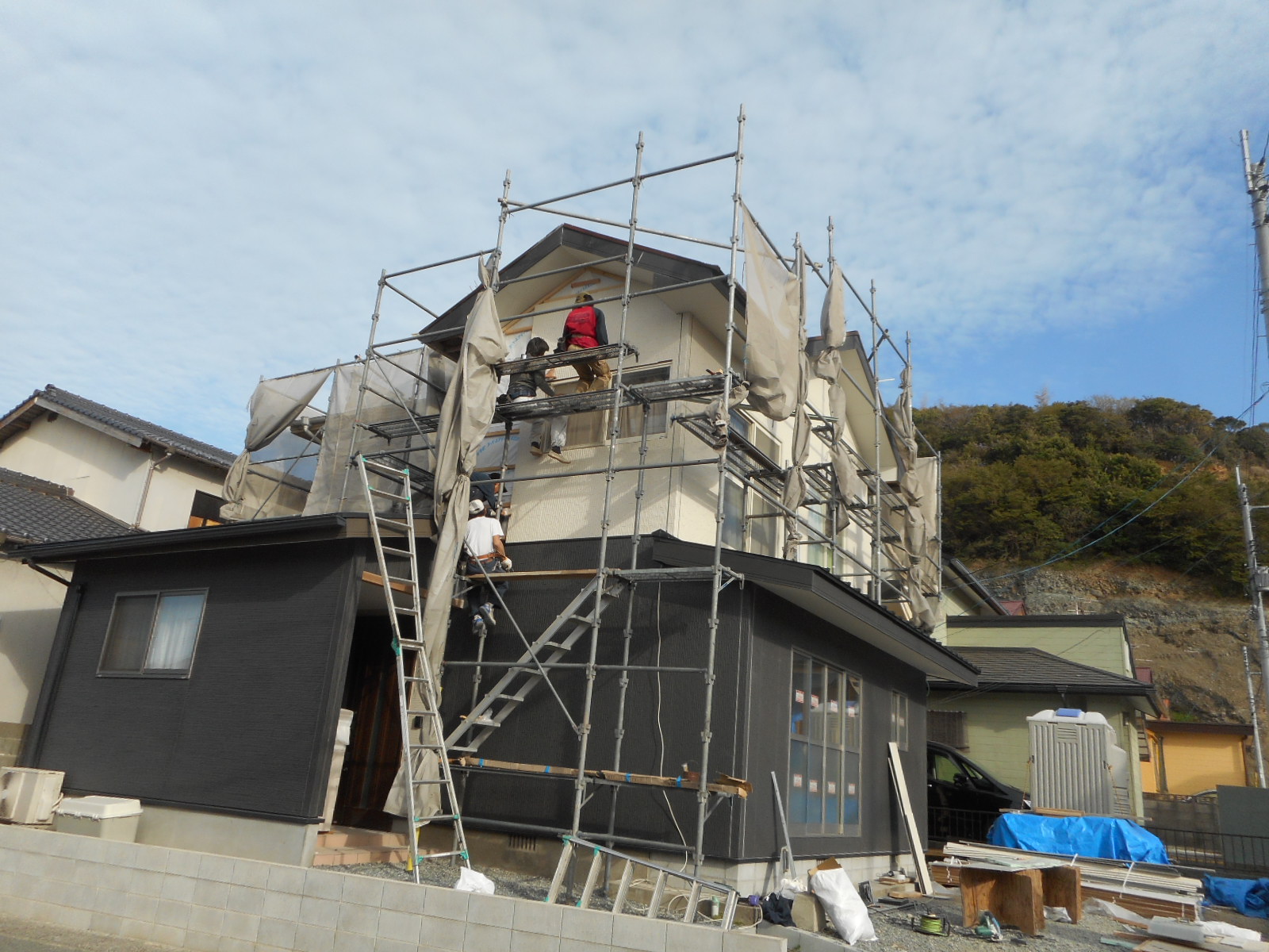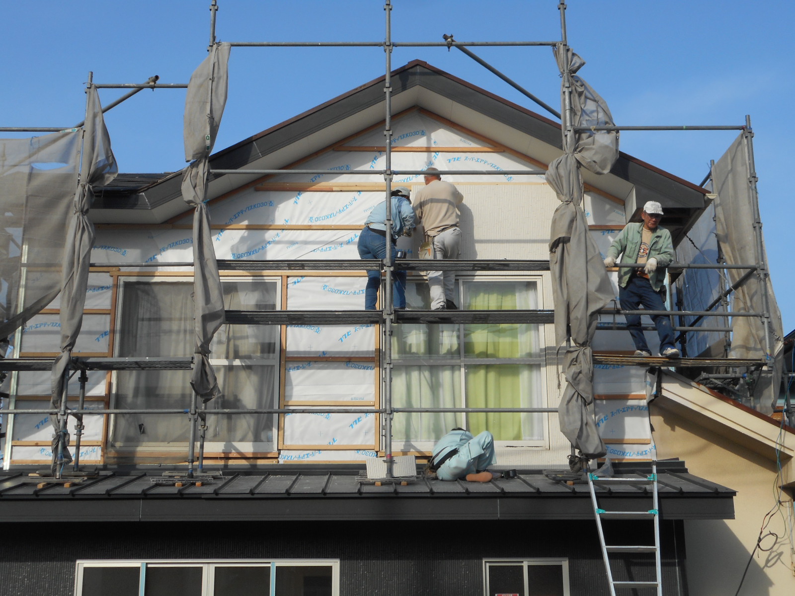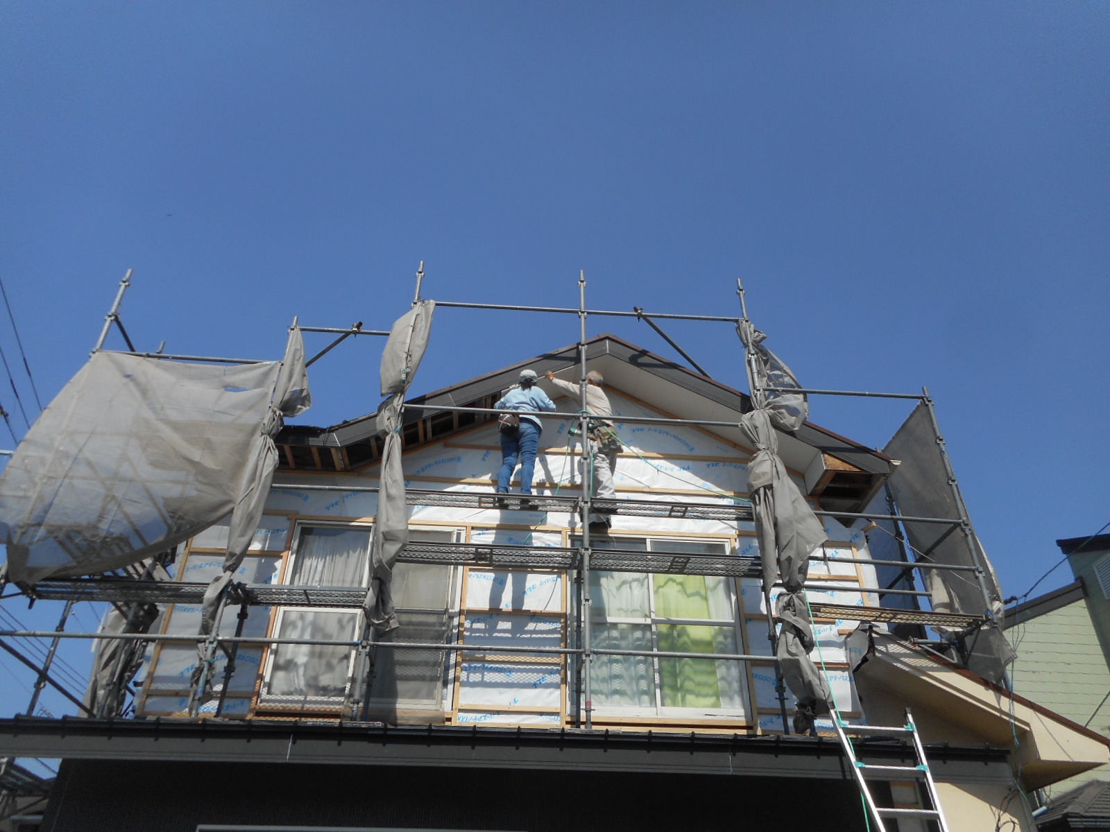 *足場を組み、養生シートを張りました!!