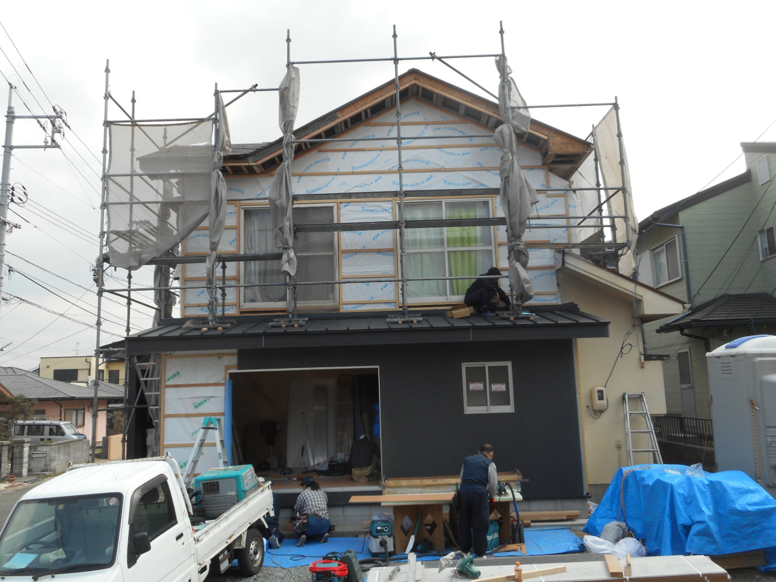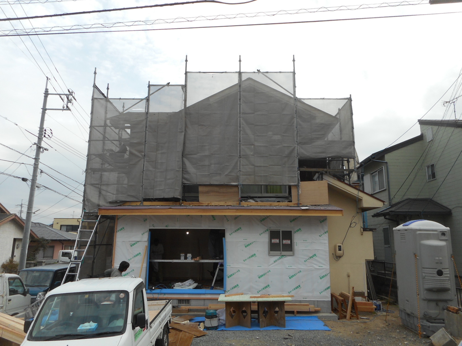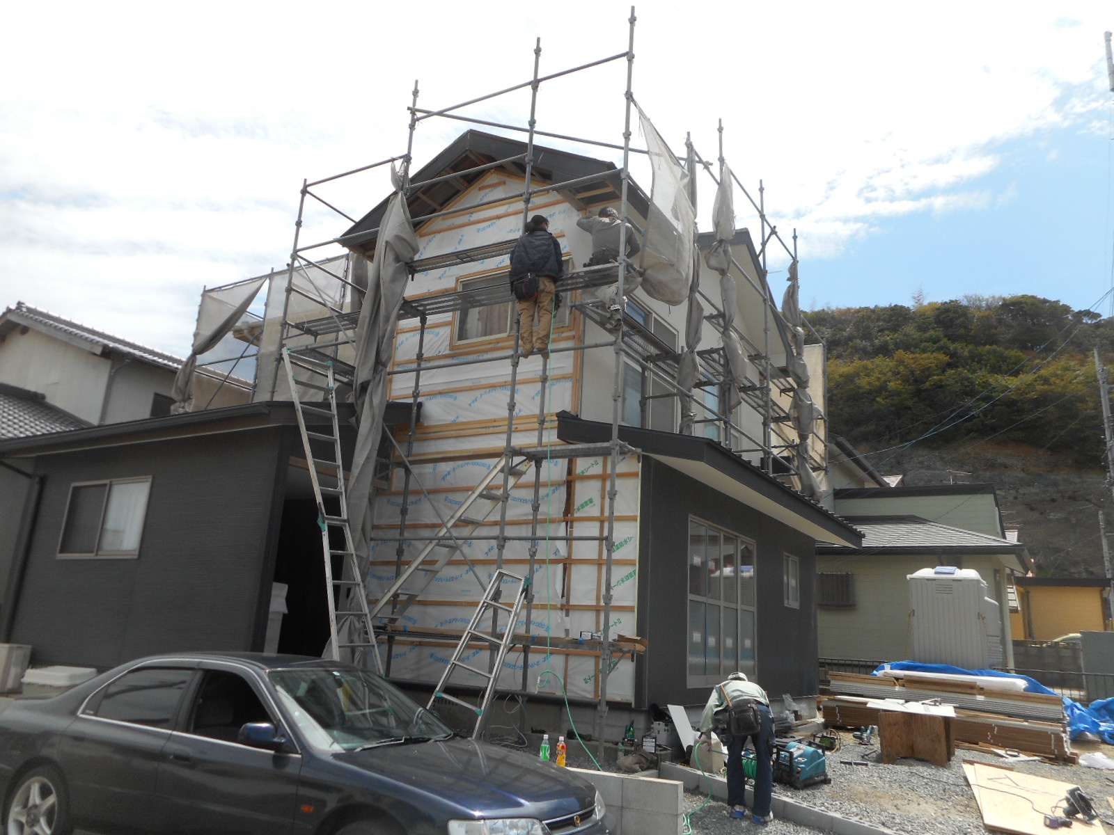 (これから既存のモルタル壁を解体、撤去する時にかなりのホコリ等が発生するため近所の迷惑にならない様にしっかりと養生をしました)