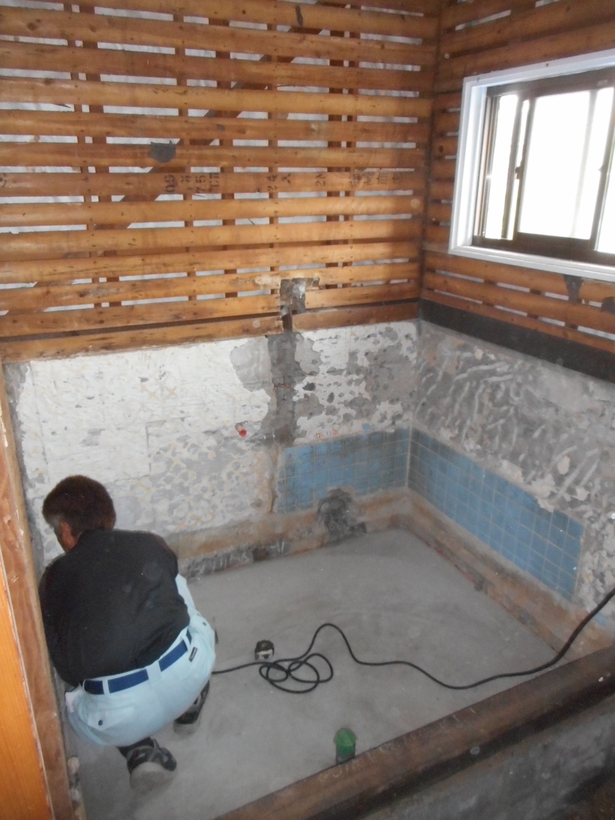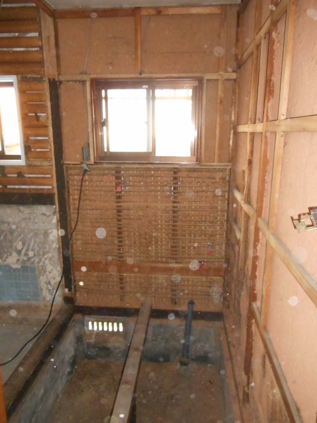 | 浴室を解体し、土間にコンクリートを打ちました!! | 洗面所も天井、壁、床、すべて解体しました!! |