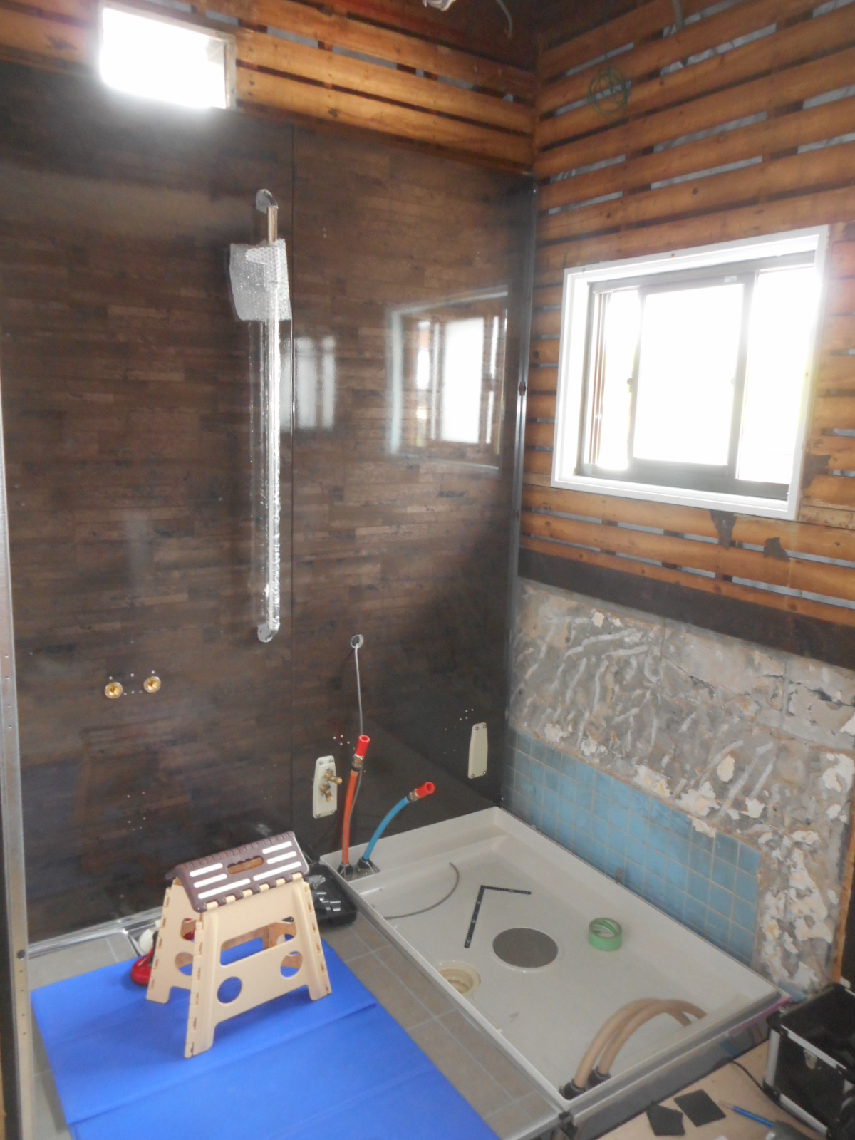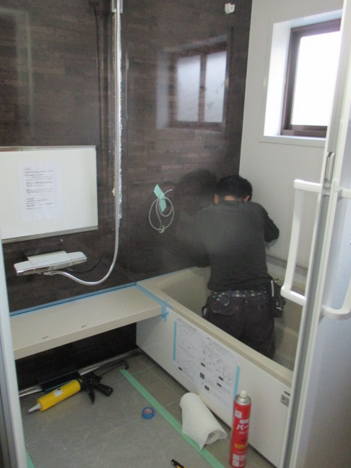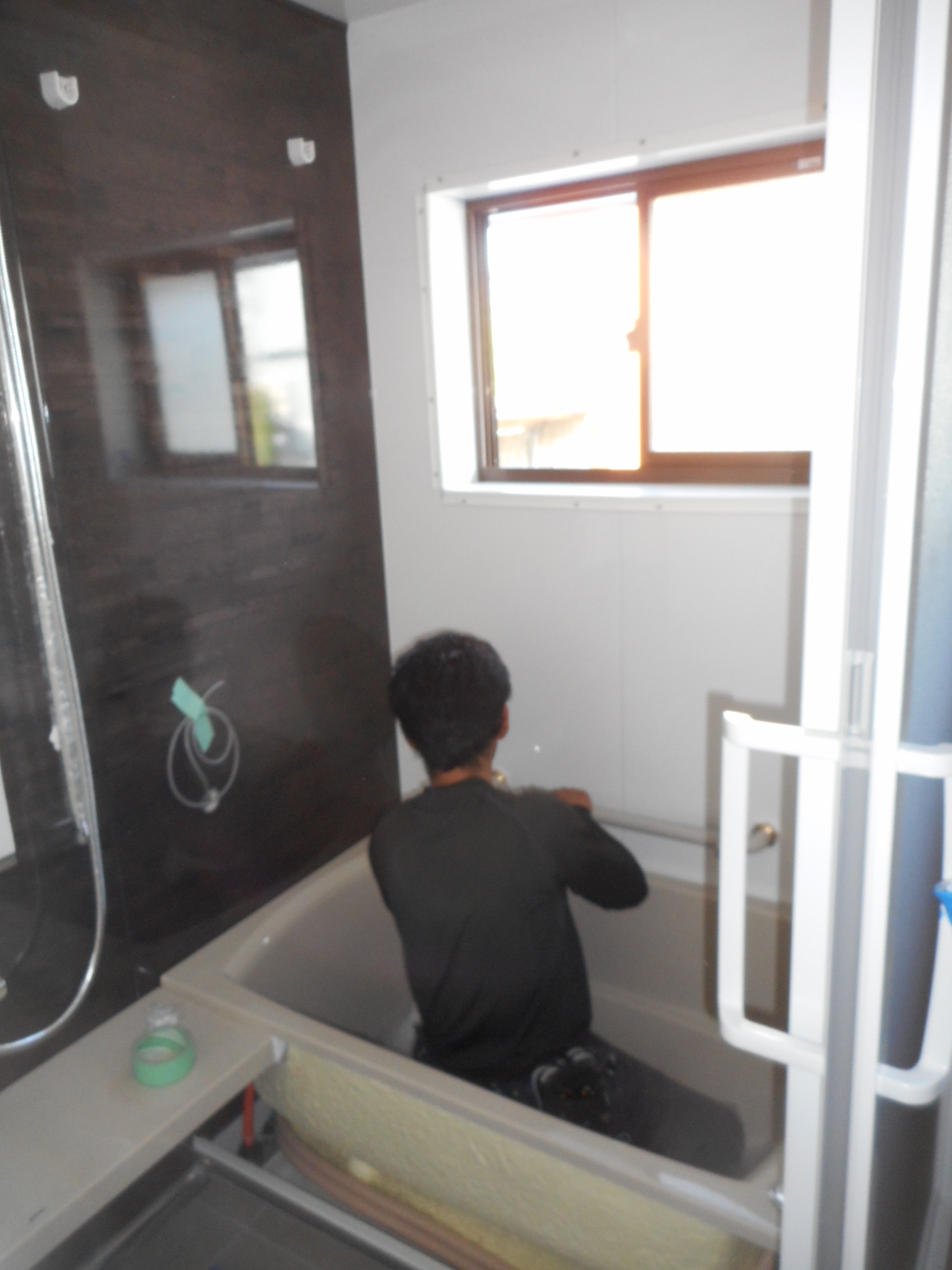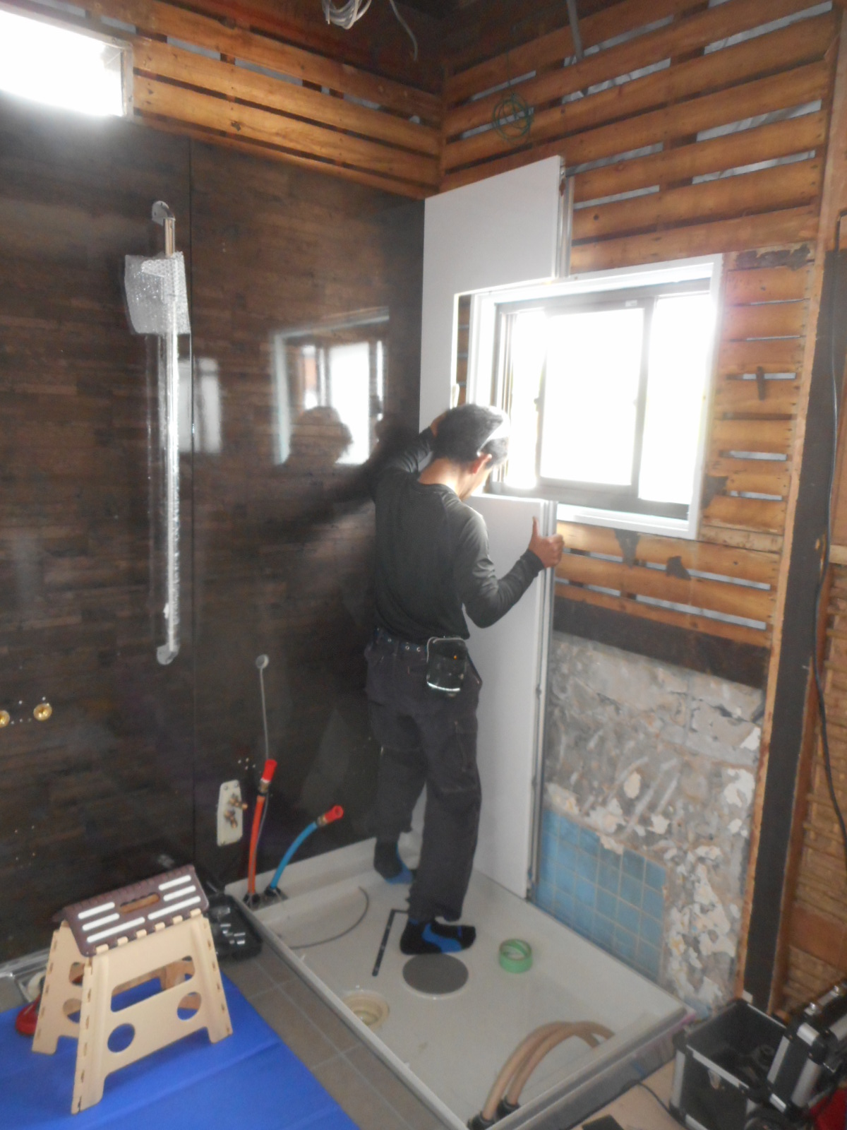 | サッシ廻りに窓額縁を取付け、側面パネルを組付けて行きます!! | パネルの組付け後、浴槽、カウンター、手摺り等順次組付けて行きます!! |