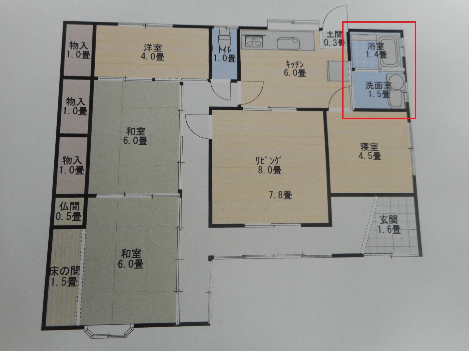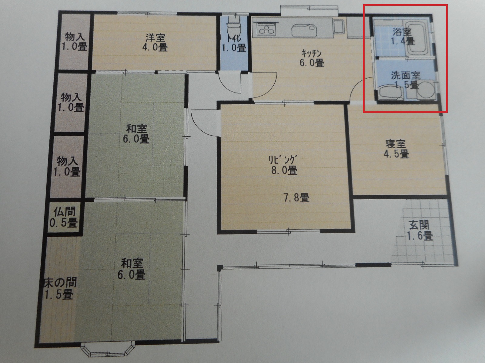 *図面。<赤線□で囲ったところが浴室と洗面所です>