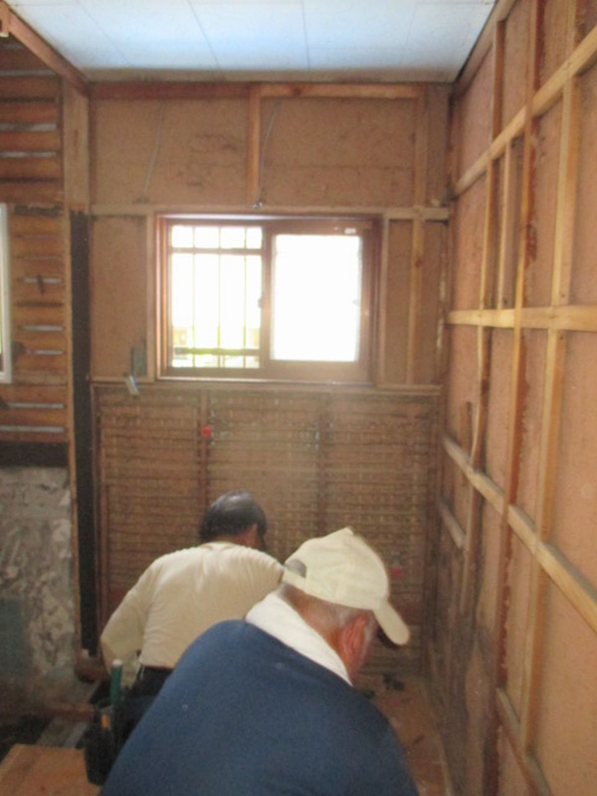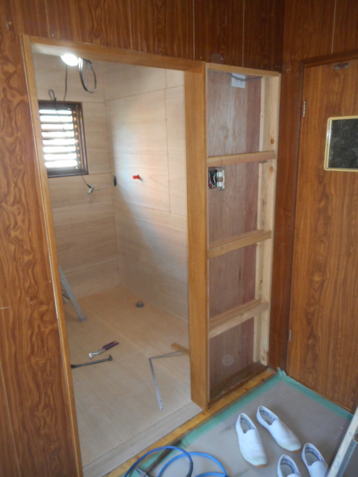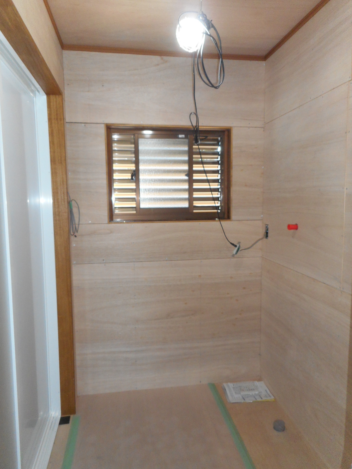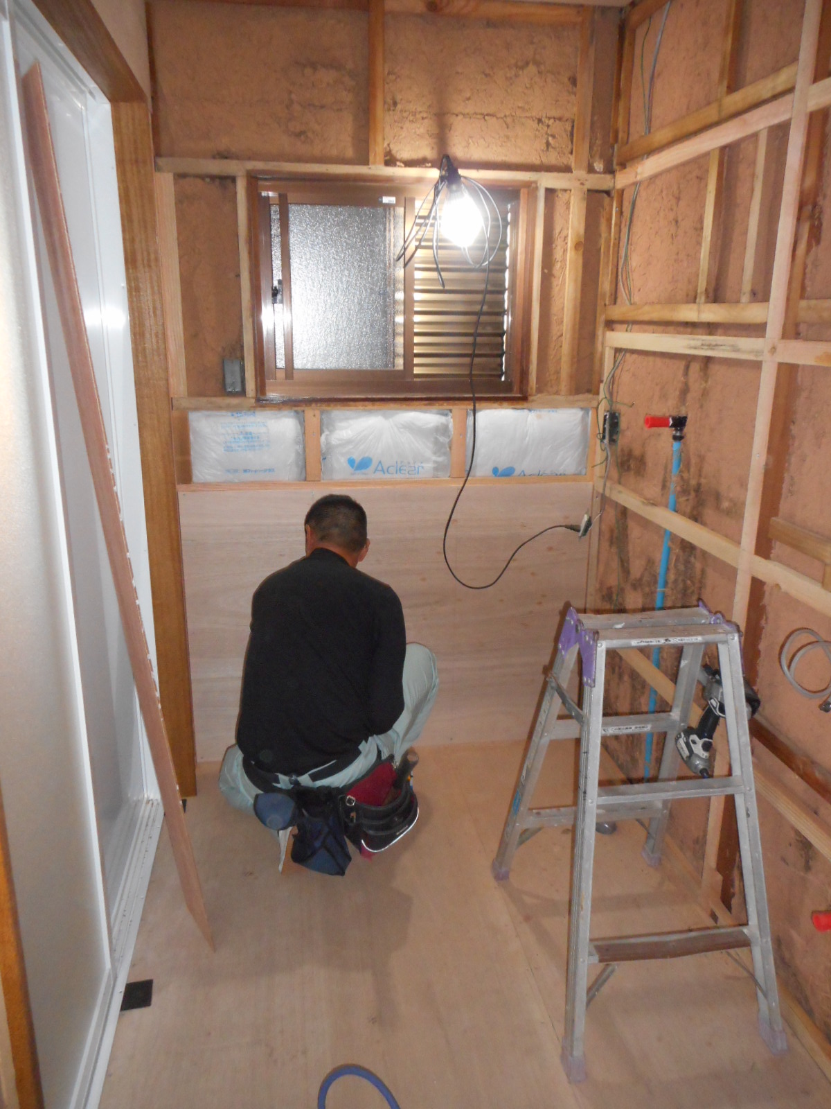 床は新規の根太を施工し、合板を張り、壁廻りもクロス下地の合板を張って行きます!! |