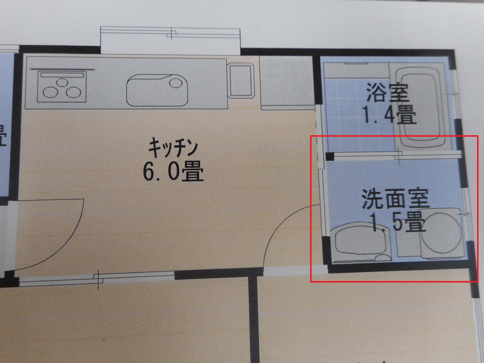 アフター!!図面の様に入り口の右側に小壁を造り、片引き戸(新規製作)の位置を移動し、洗濯機と洗面化粧台を正面から右側に配置を替え、内装を一新し化粧台も新しくします。