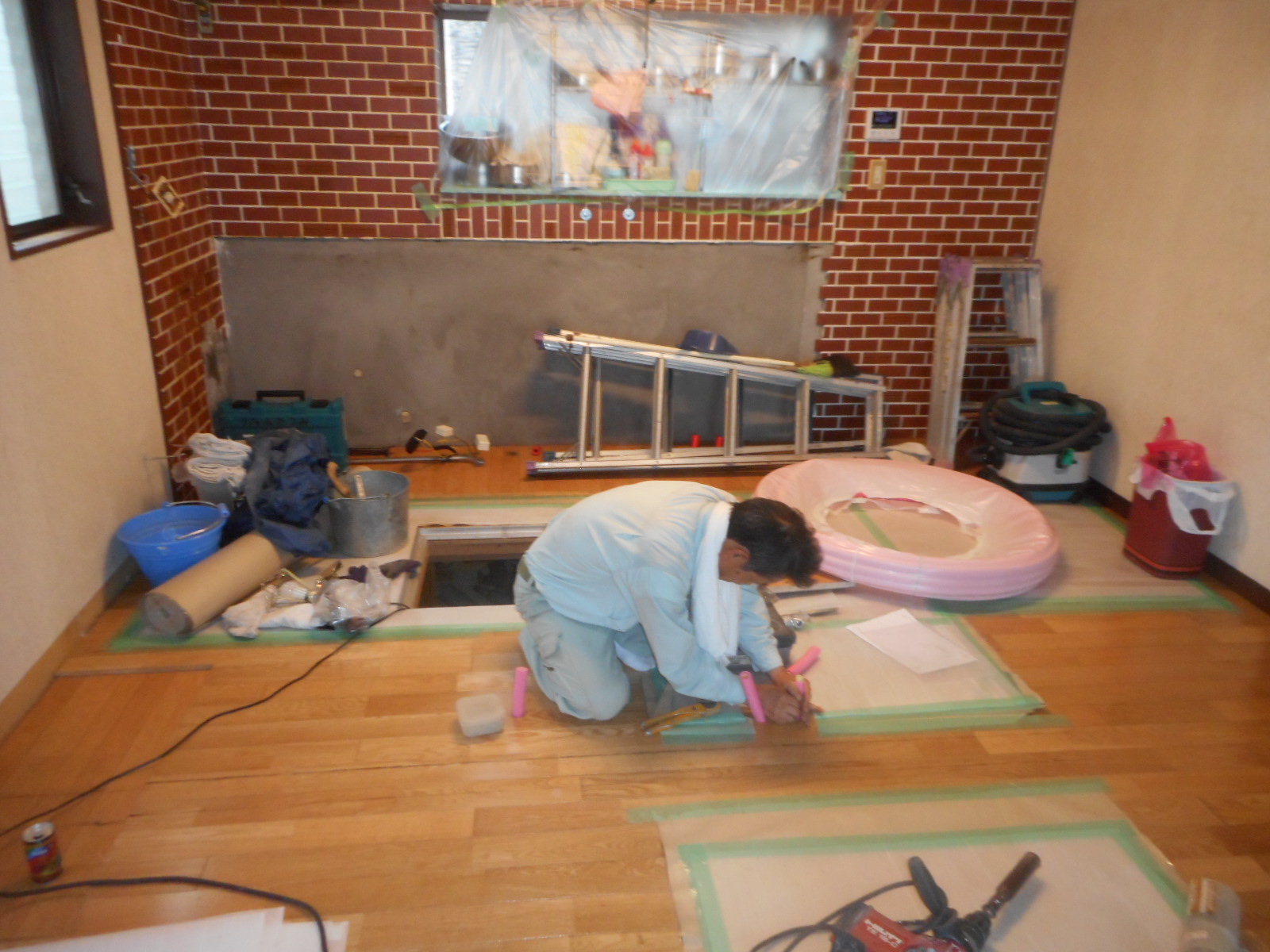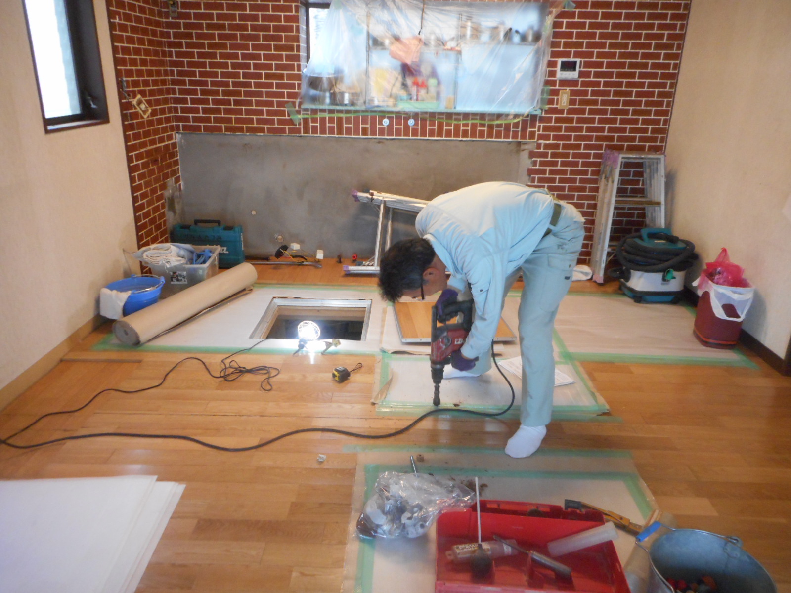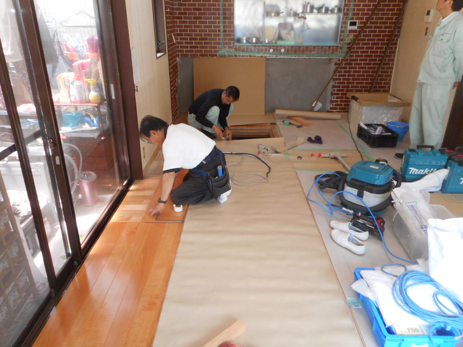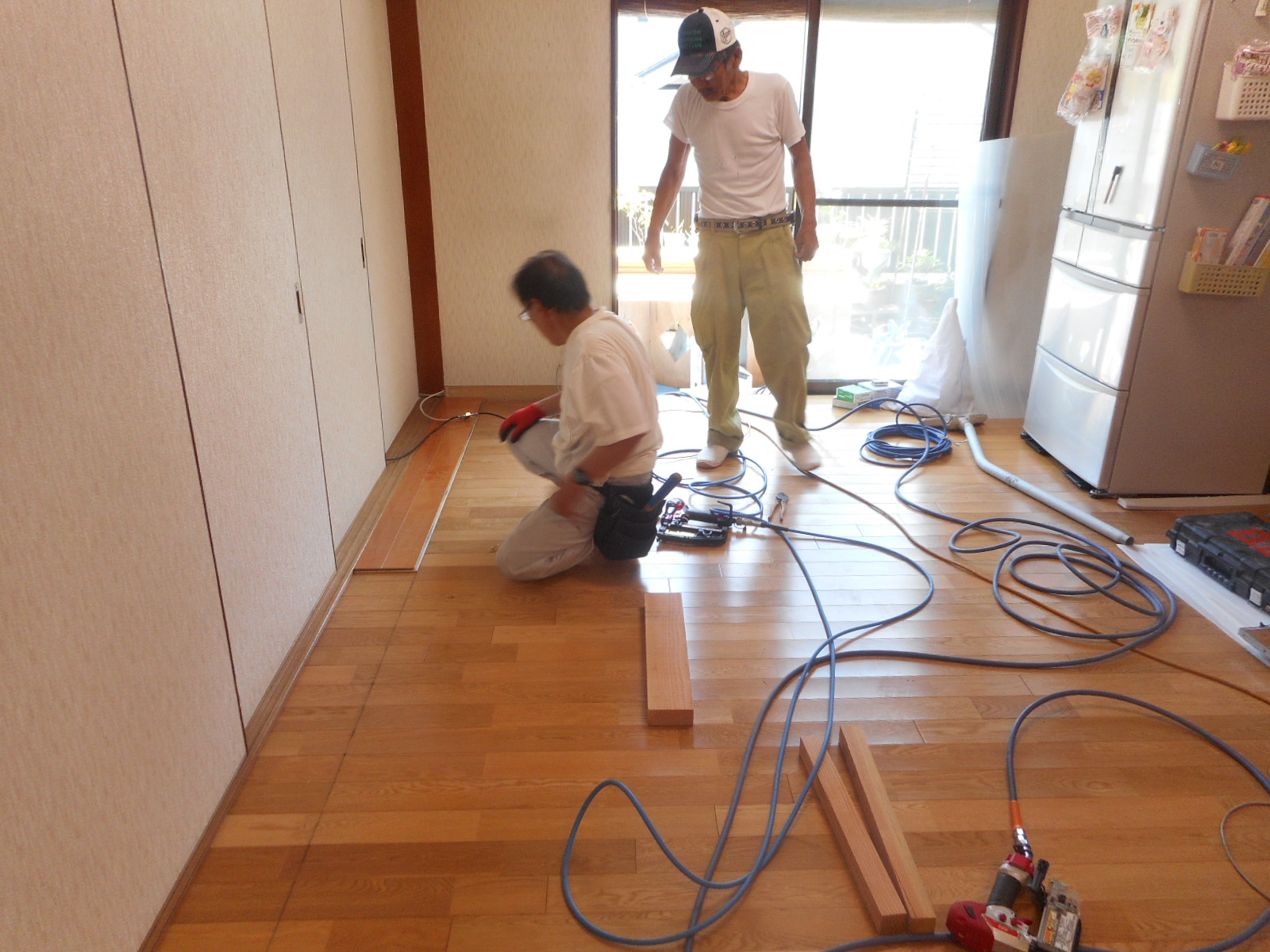 | 新規のフロア材を、リビング側から張って行きます!! | 順次キッチン側へと、フロア材を張って行きます!! |