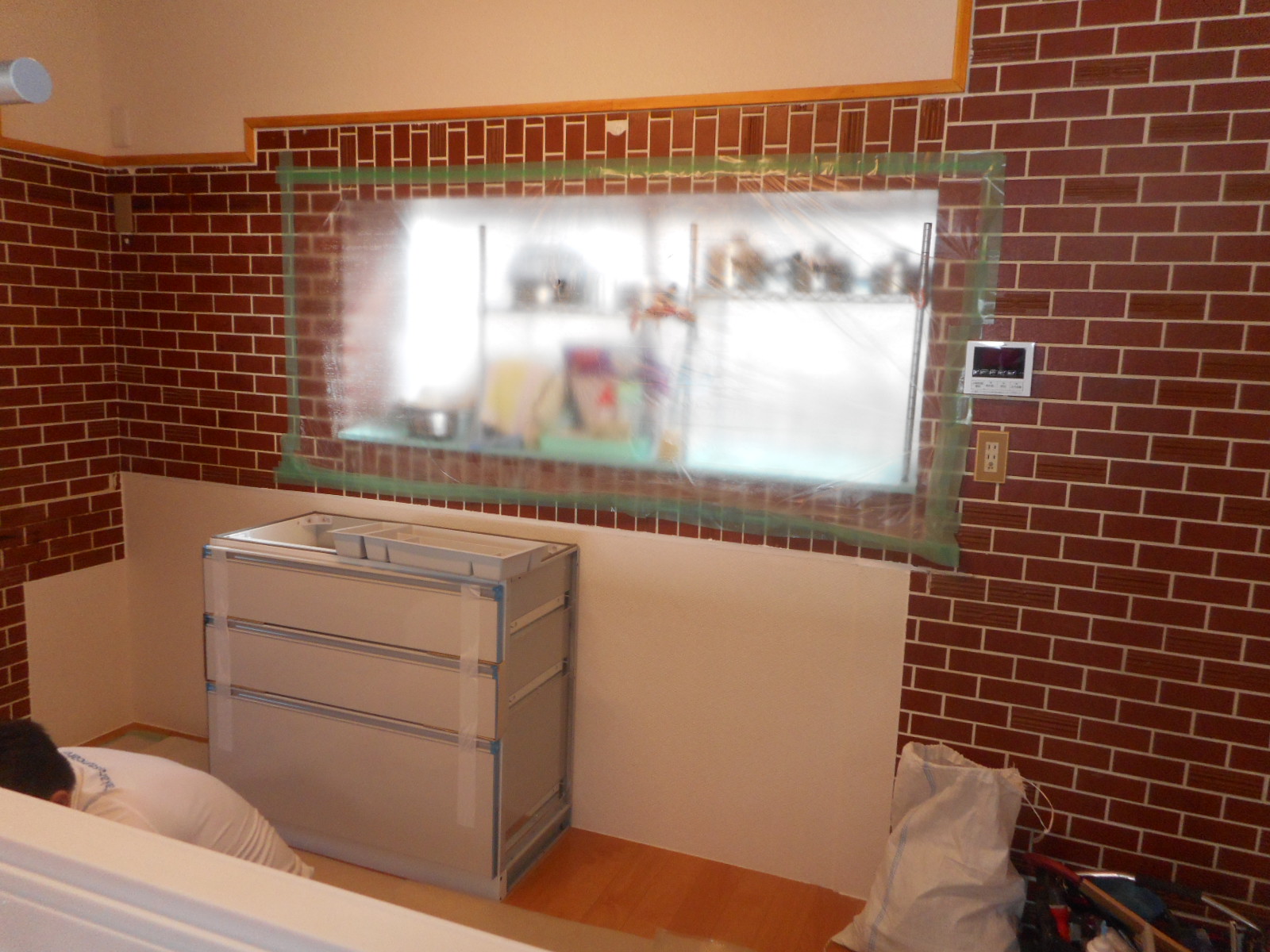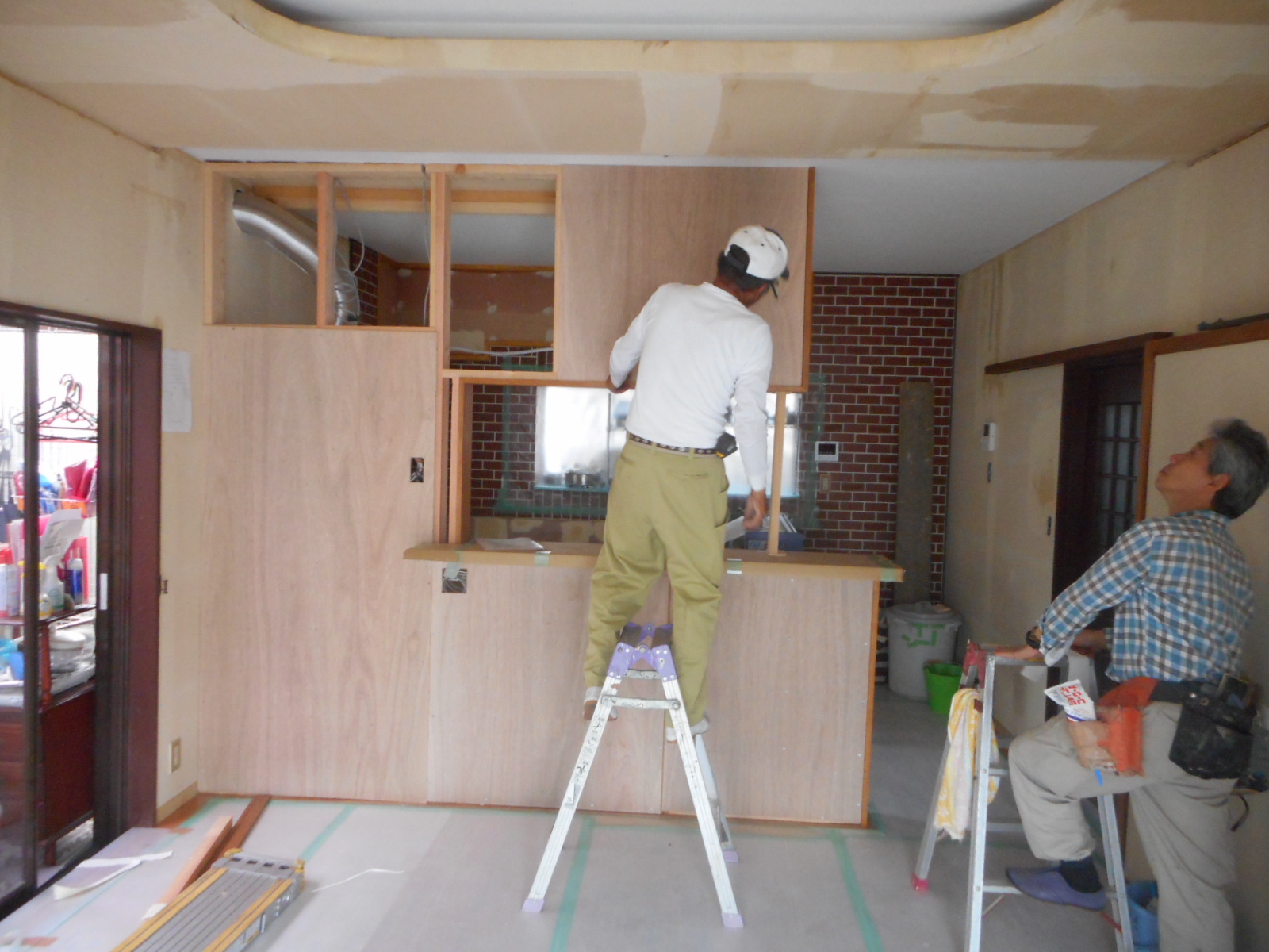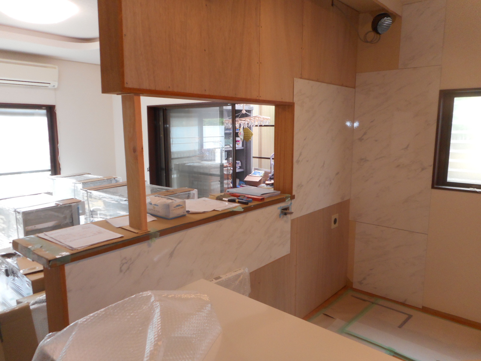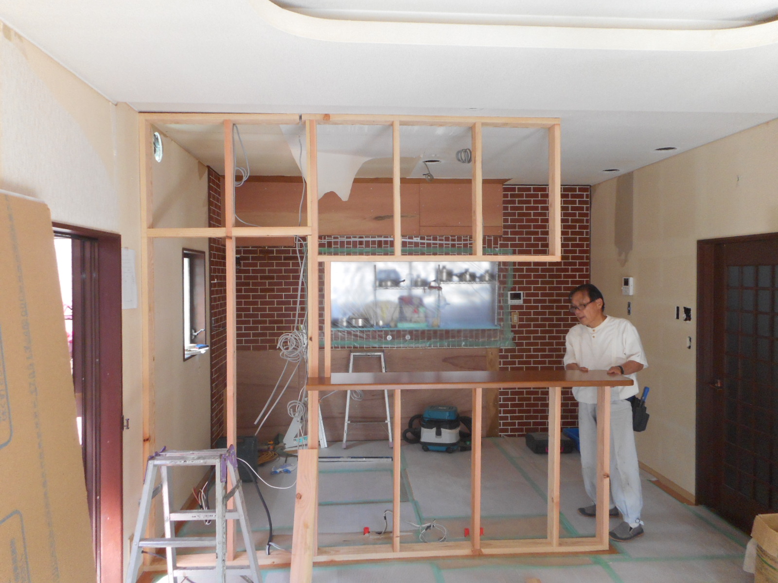 | 対面キッチン用の壁の、骨組みをします!! | 対面キッチン用の壁の造作を、順次して行きます!! |
