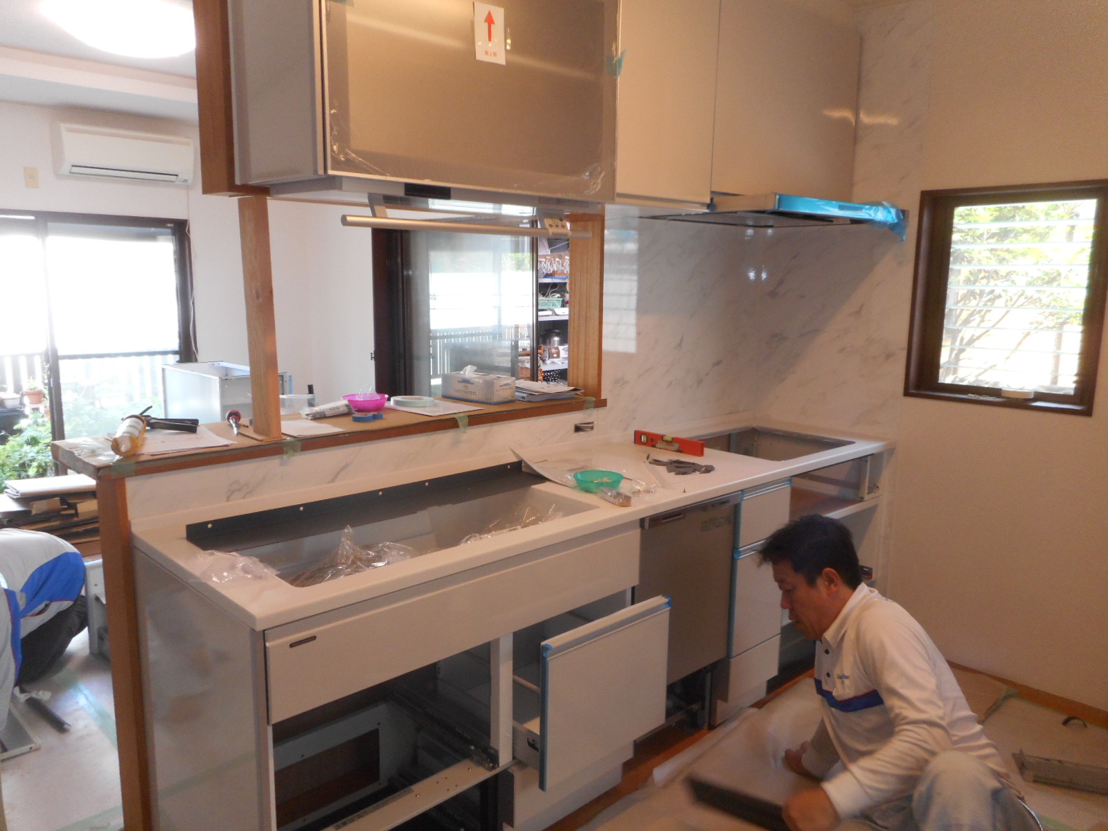 | 下の流し台部分も、順次組付けて行きます!! | 後(元流し台があった所)には背面収納棚を組付けます!! |