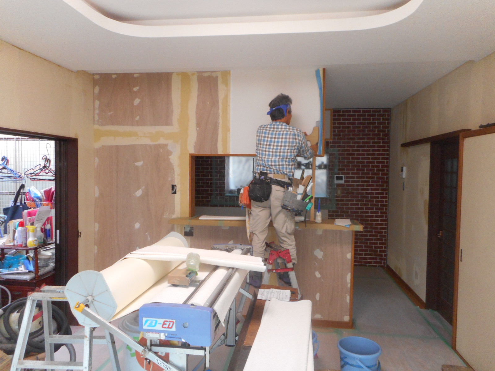 | クロスを張って、行きます!! | 天井と壁廻りのクロス張りが、完了しました!! |