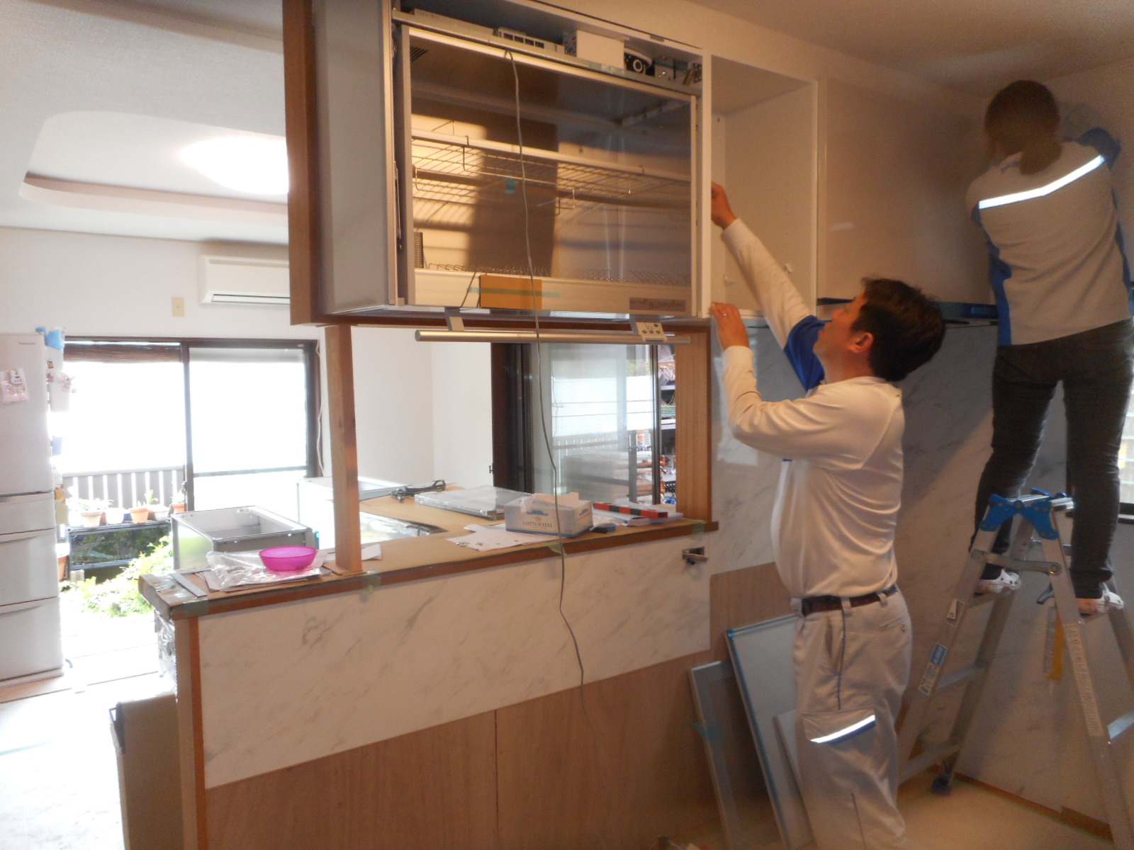 | キッチンパネルを、施工しました!! | レンジフード、吊戸棚、電動昇降吊戸棚を組付けます!! |