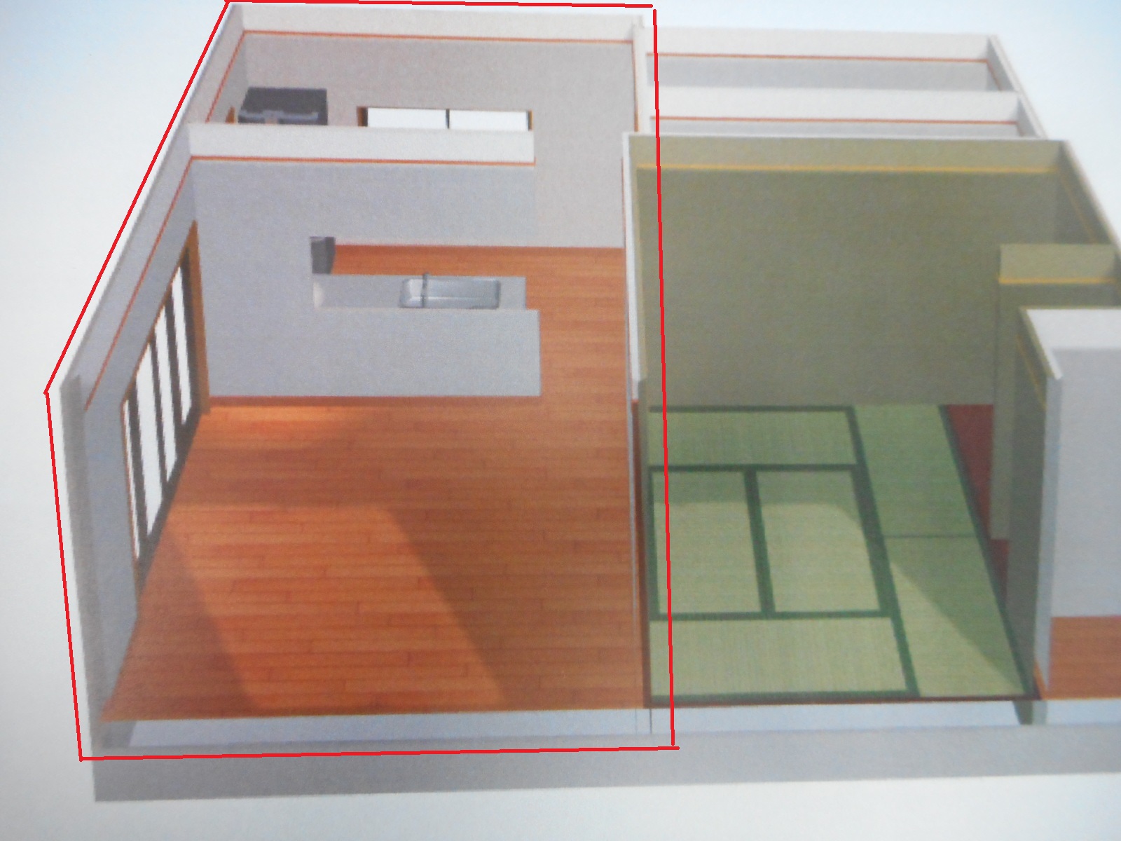 *改修後の、3Dです!!(赤線□で囲った部分がLDKです)