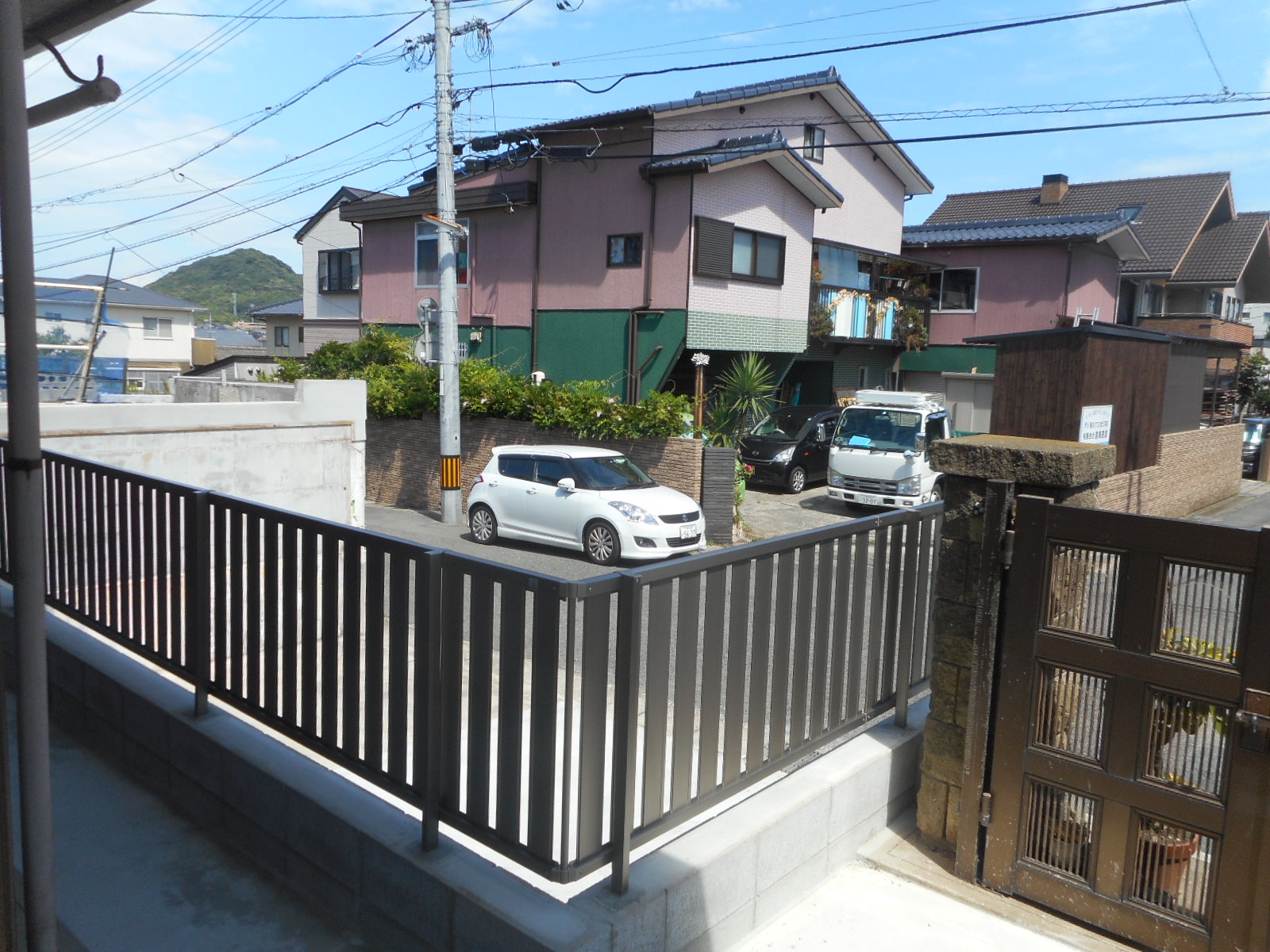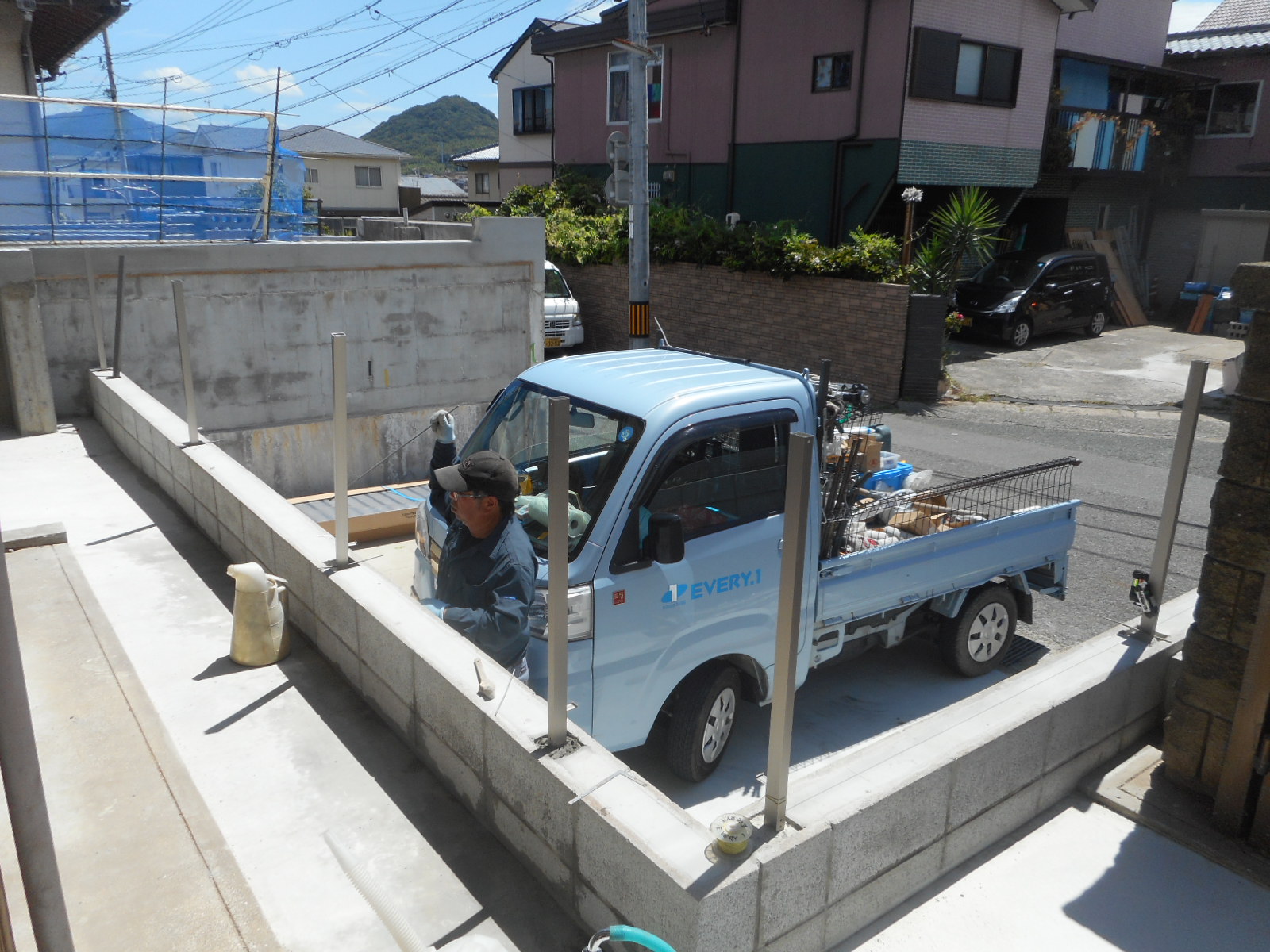 | ブロックの上に、フェンスを施工します!! | フェンスの柱を、順次立てて行きます!! |