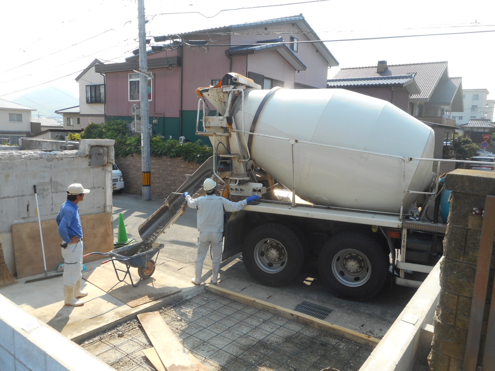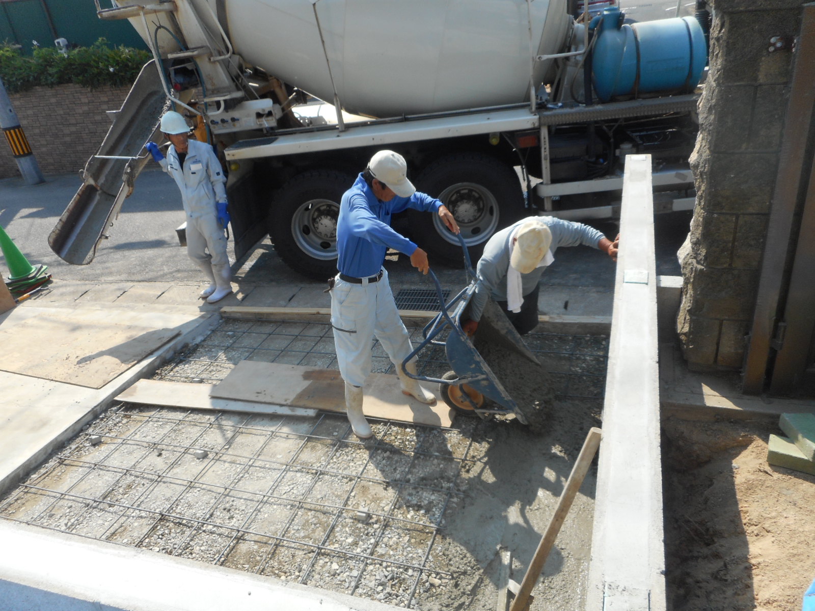 | 生コン車から、一輪車に生コンを移します!! | 順次生コンを、打設して行きます!! |