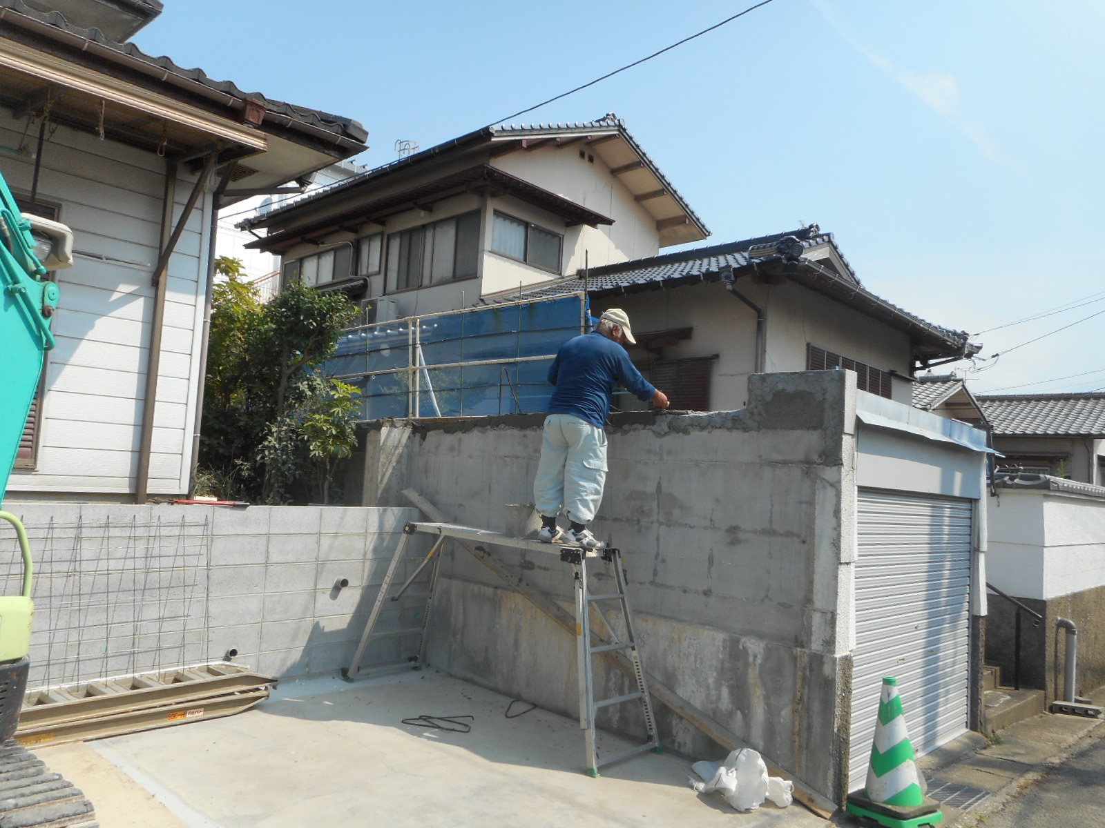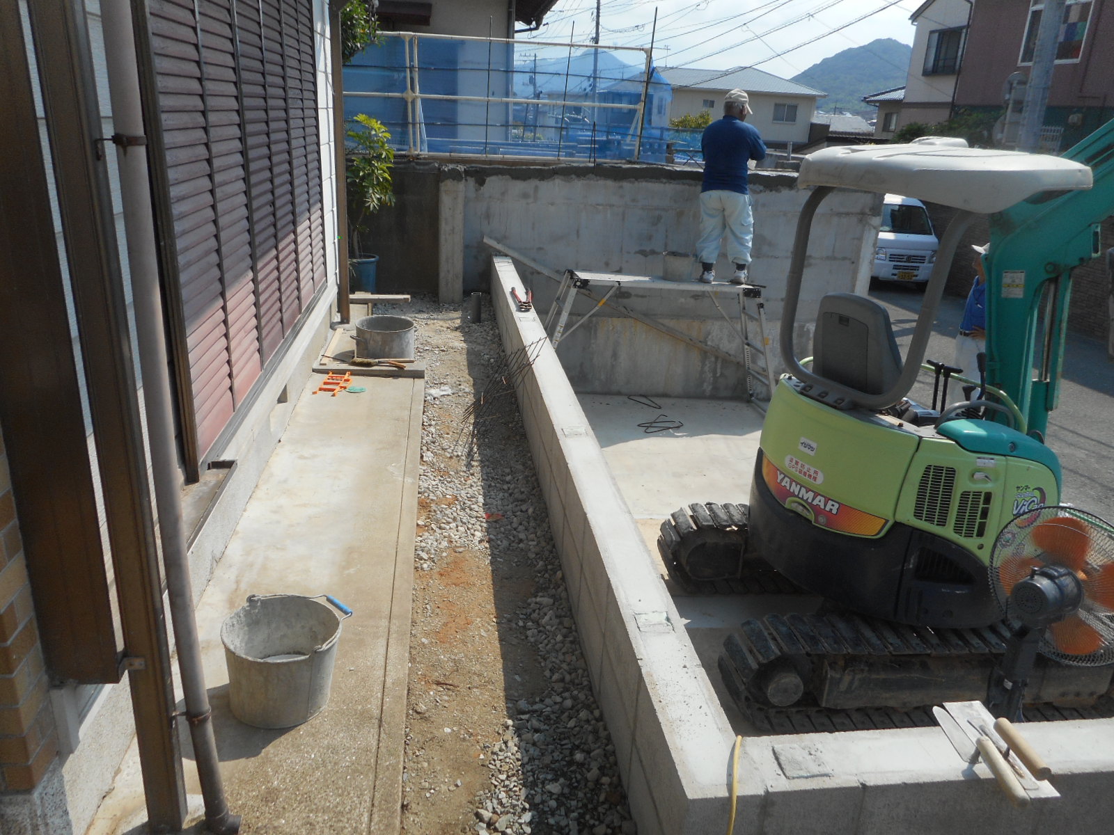 | 内側の生コンの打設が、完了しました!! | 右側のコンクリート擁壁(元掘り車庫の右壁)の上部をモルタルで補修します!! |
