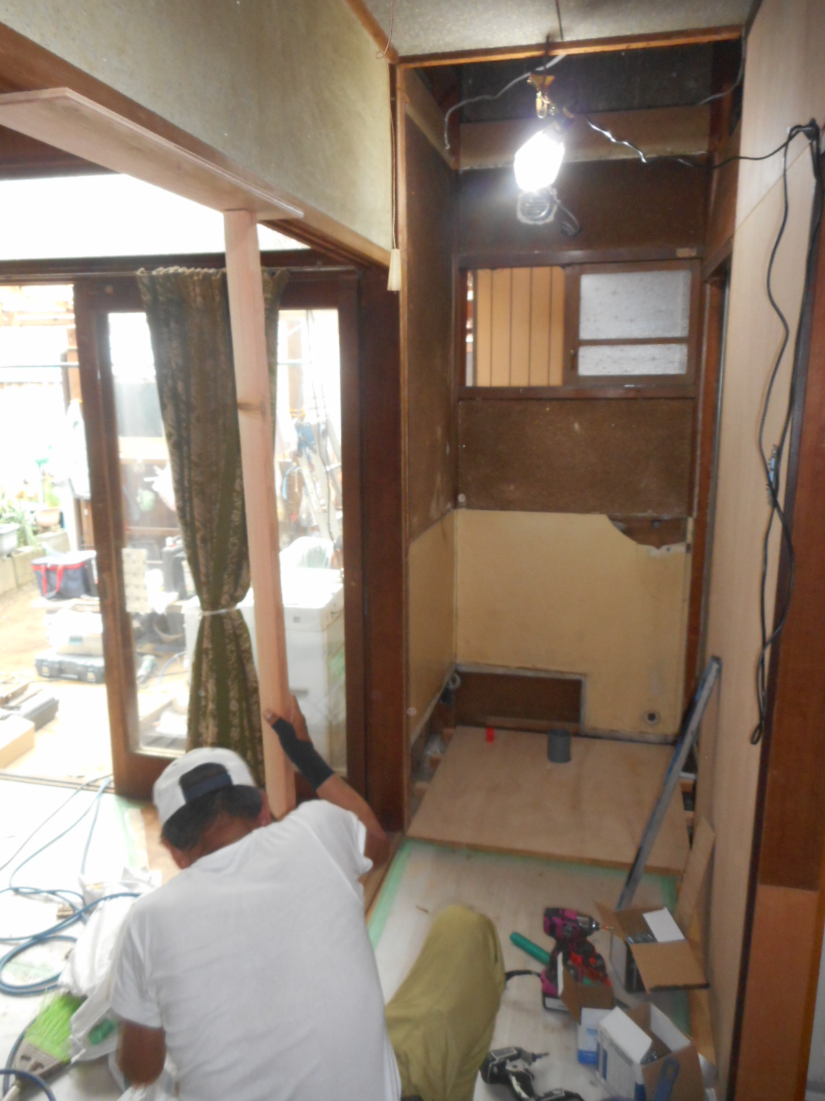 | 既存便器を撤去し、給排水管の整備をしました!! | 広くするため、左側の壁の骨組みをします!! |
