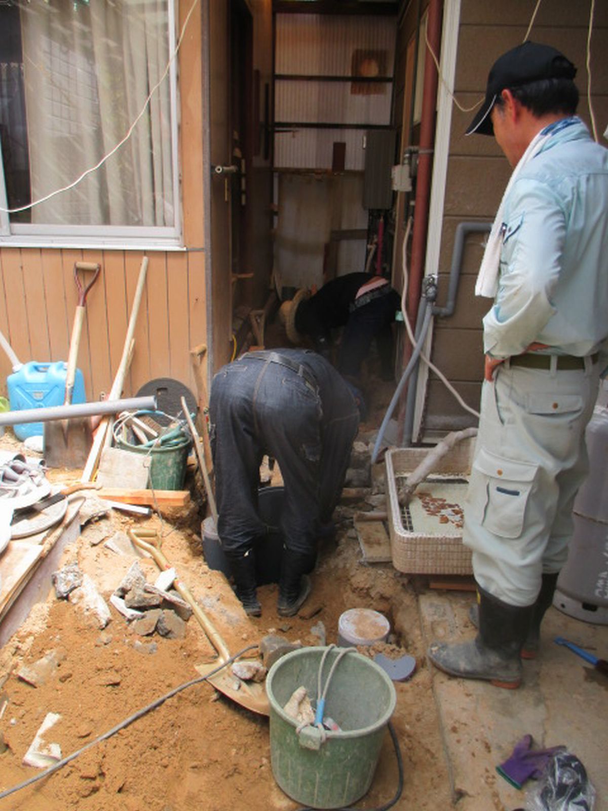 | 新規の量水計を、取付けます!! | 給水管は、道路を通っている本管に接続し下水管も本管の枡に繋ぎ入れます!! |