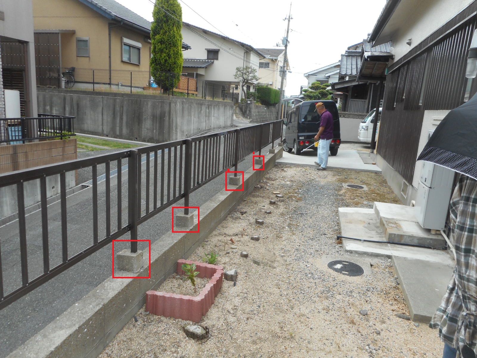 上の写真の様な形でフェンスが取付けられているのですが、赤枠で囲ったフェンス取付けの束石の状態が悪いのと、フェンス自体も状態が悪いため、このままでは危険と言うことで、改修することにしました。