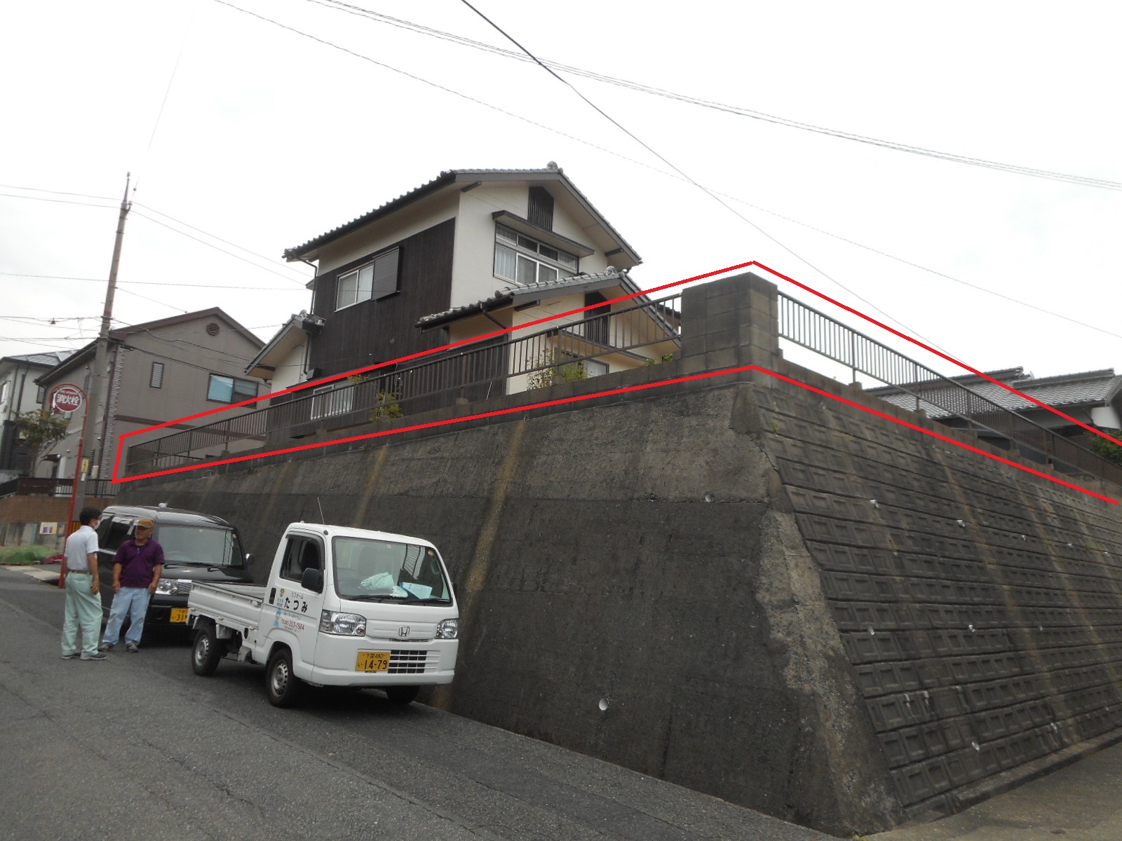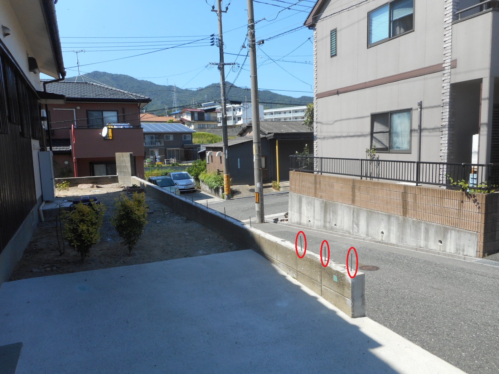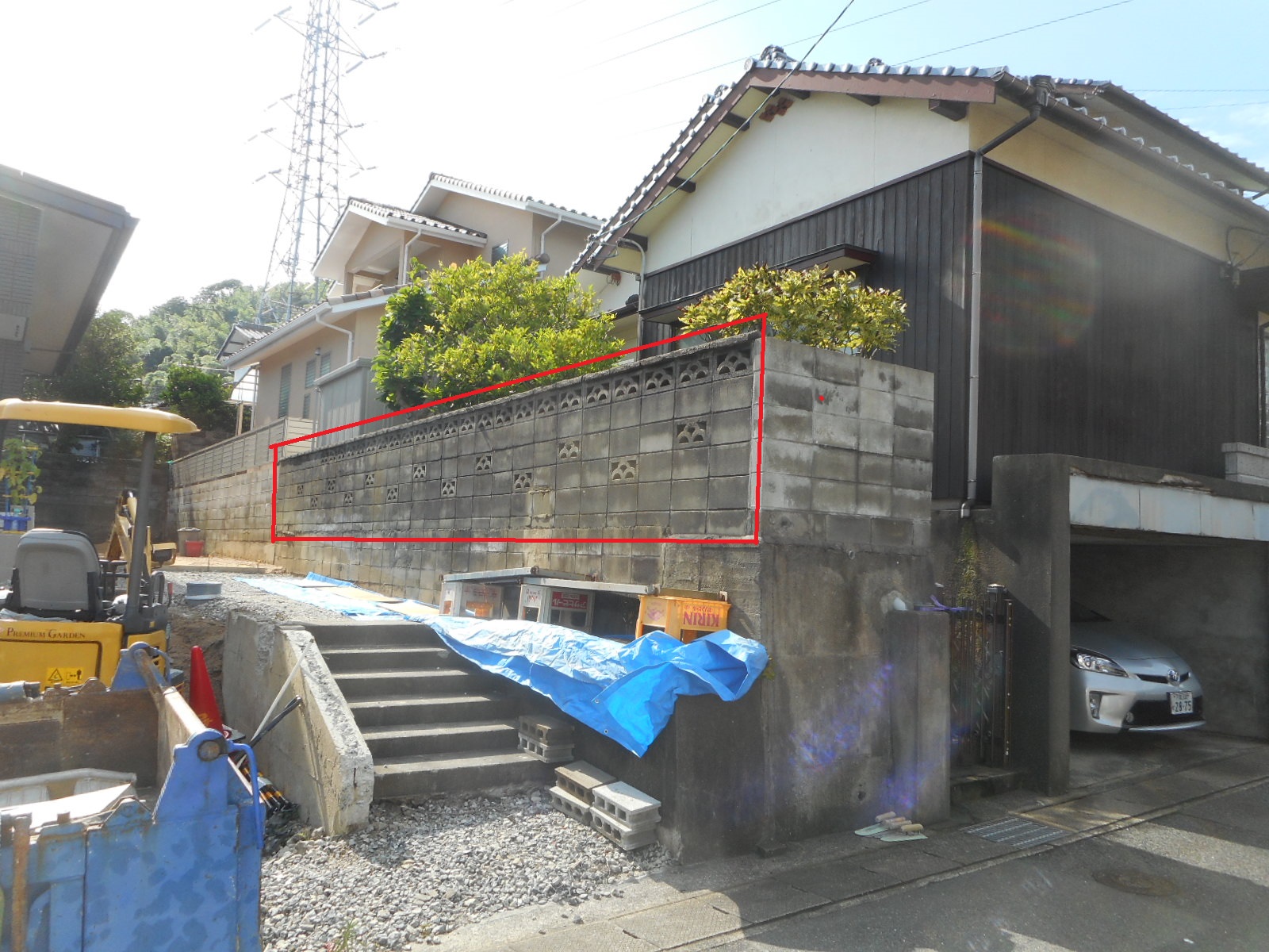 右上のお家の所有となる、赤枠で囲った部分のブロック塀の状態が悪いために、改修することにしました。
