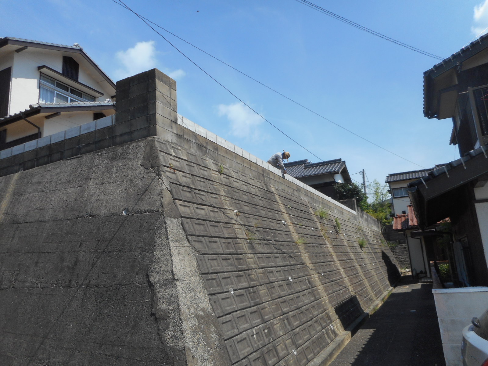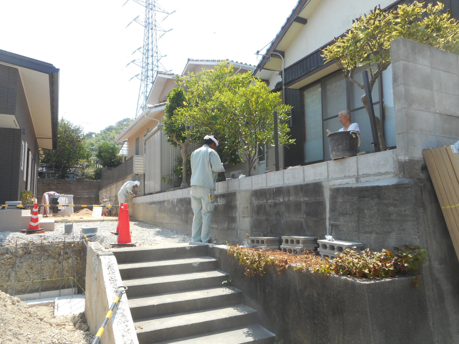 このお家に近々入居される方に小さなお子さんが居ると言うことで、上の施主さんが気にされて、万が一このブロック塀が倒壊して、下のお家のお子さんにケガでもさせたら大変と言うことで改修を決心した様です。